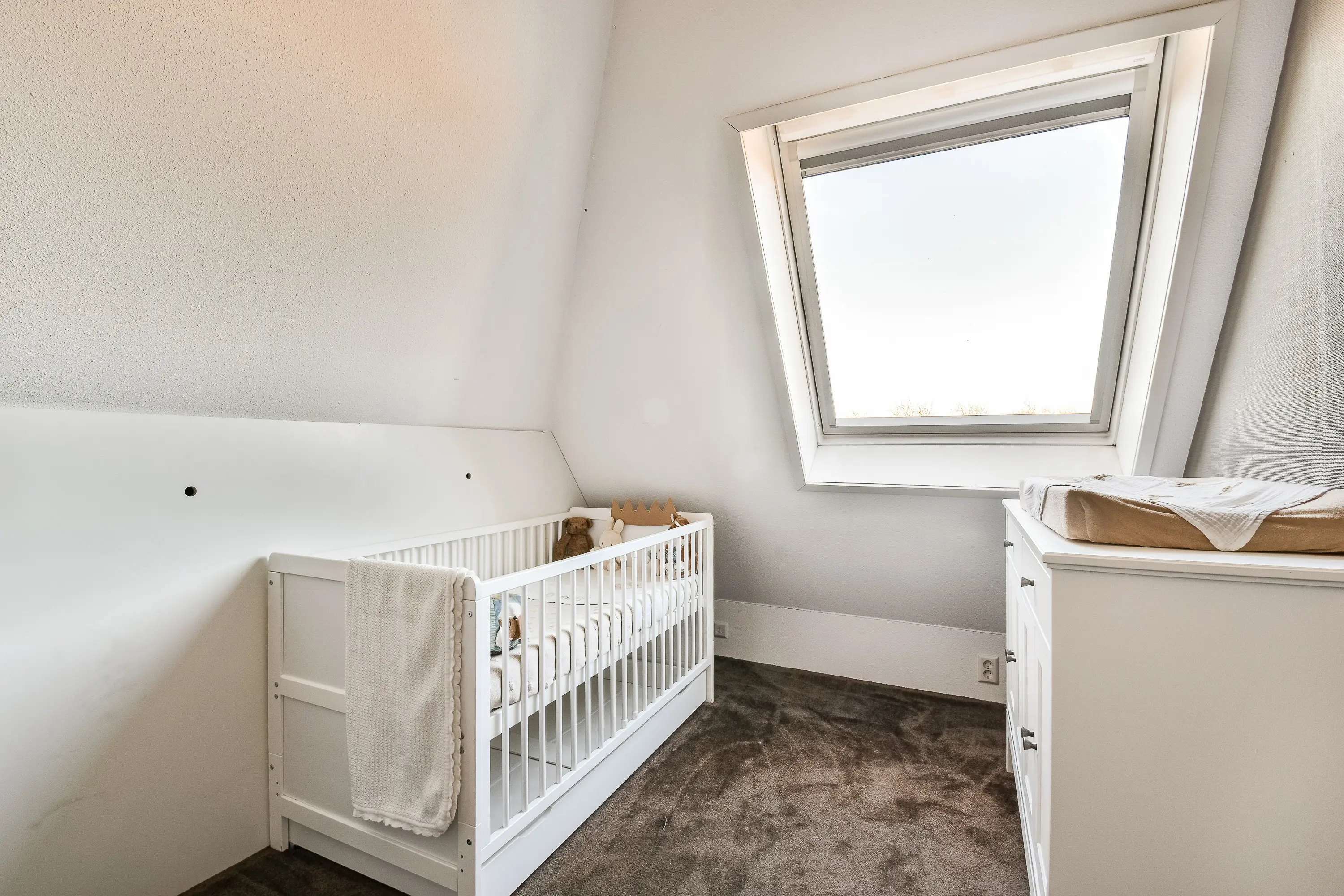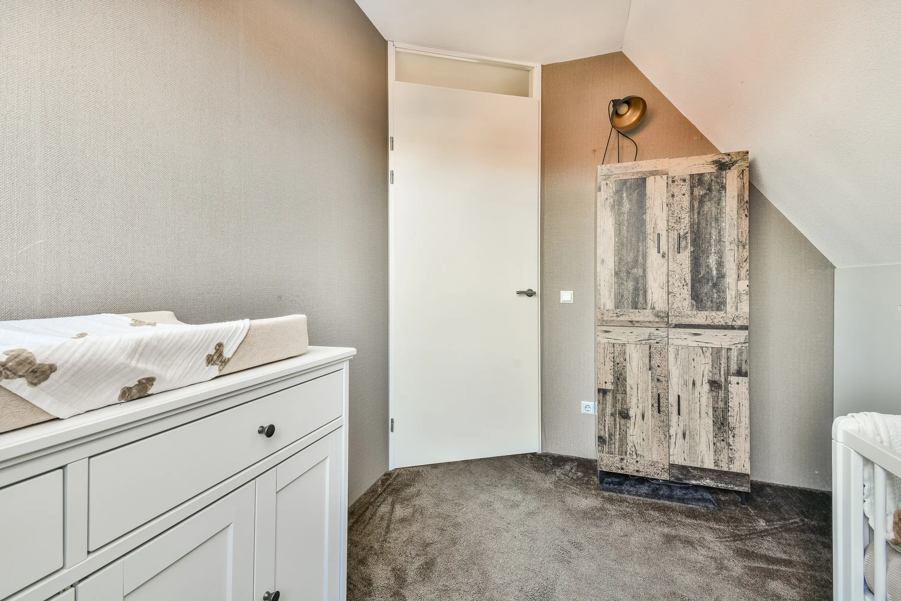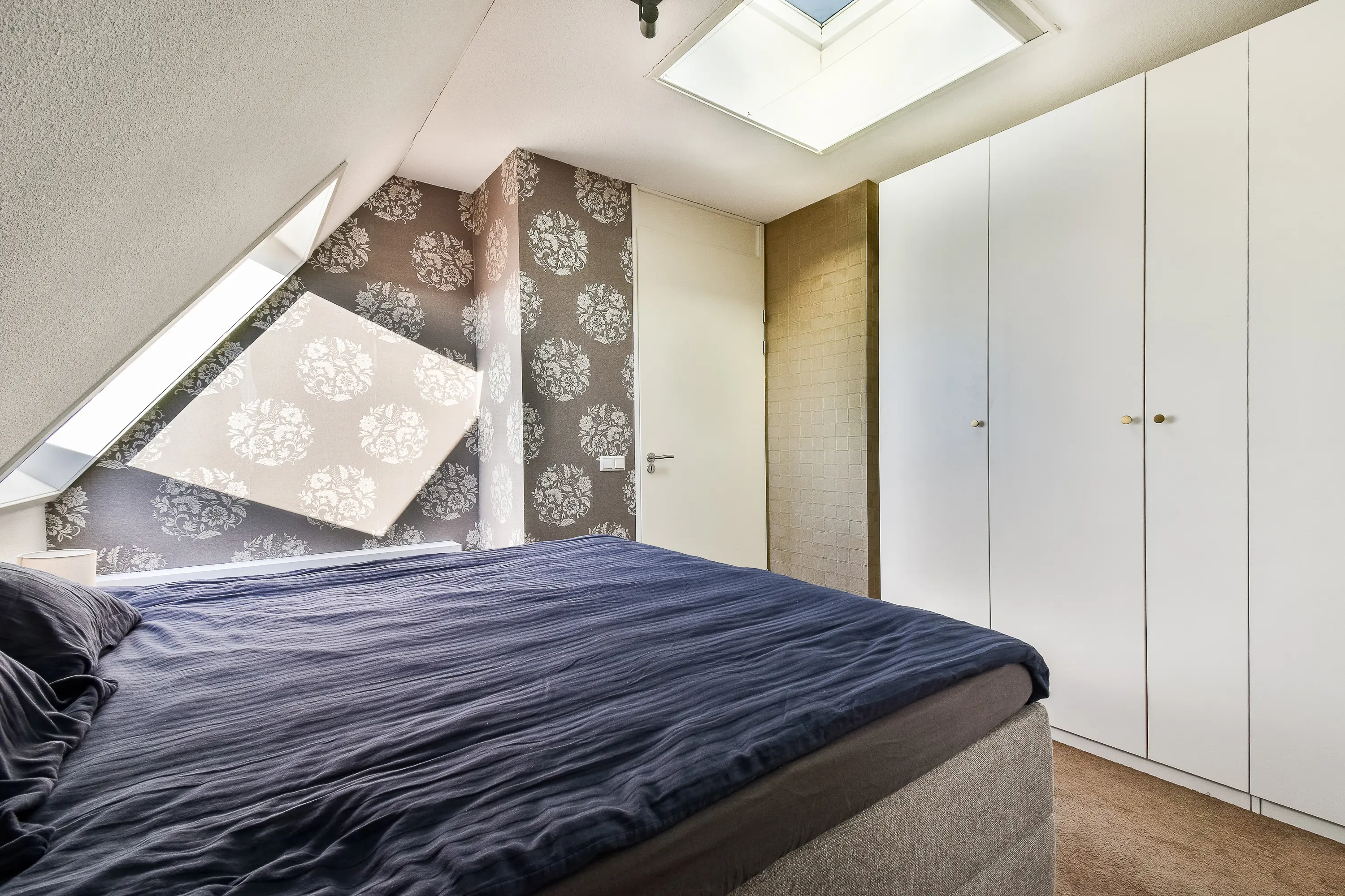 De tweede kamer op deze verdieping is ideaal als kinder-, logeer- of werkkamer. Ook hier een Velux dakraam met zonwering en verduistering, vaste internetaansluiting, voldoende stopcontacten en extra bergruimte achter de knieschotten.