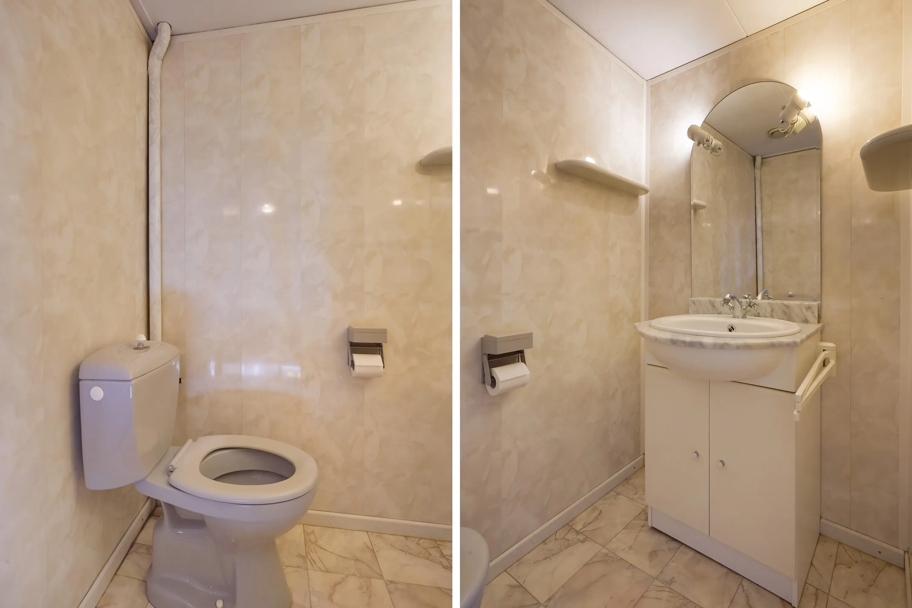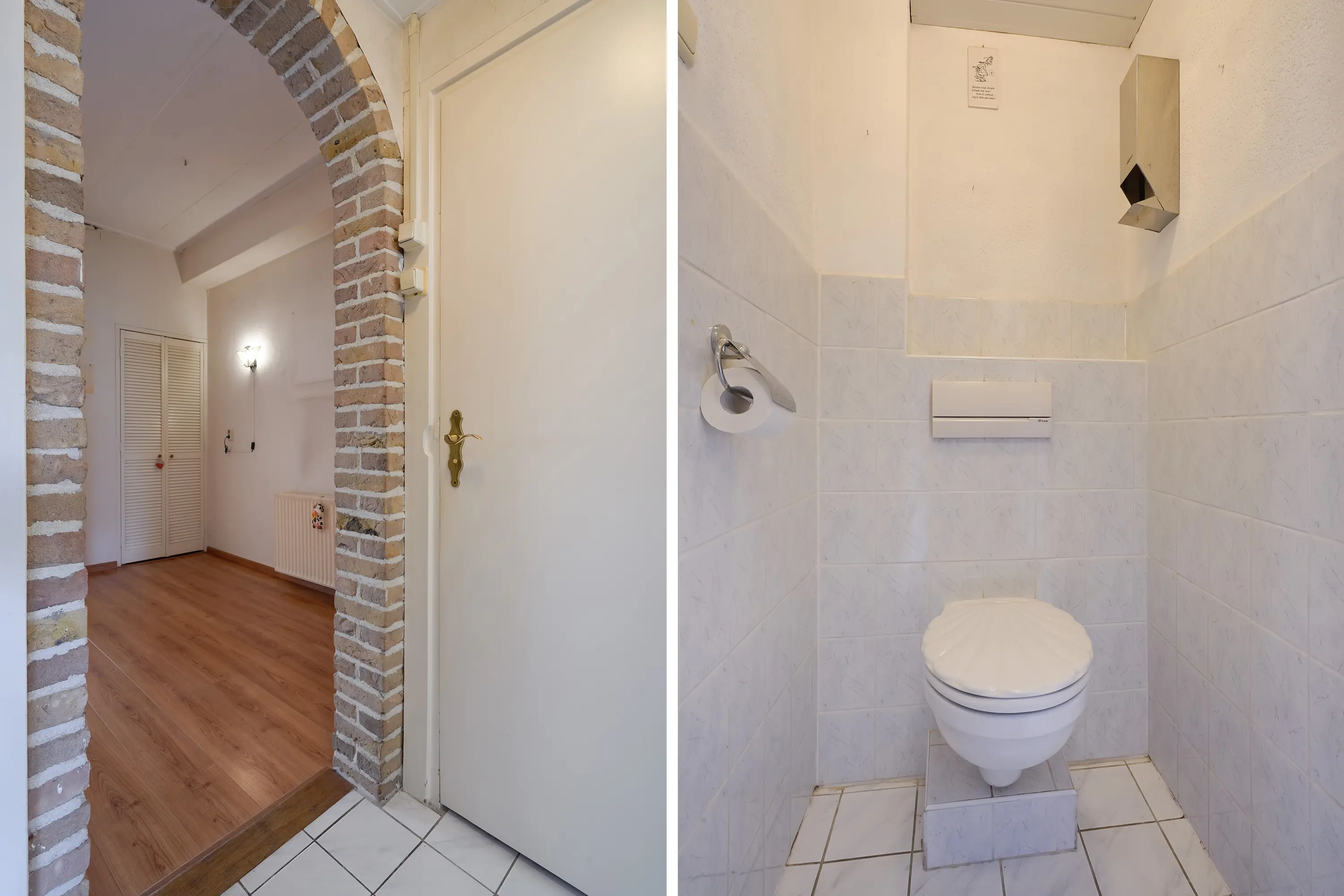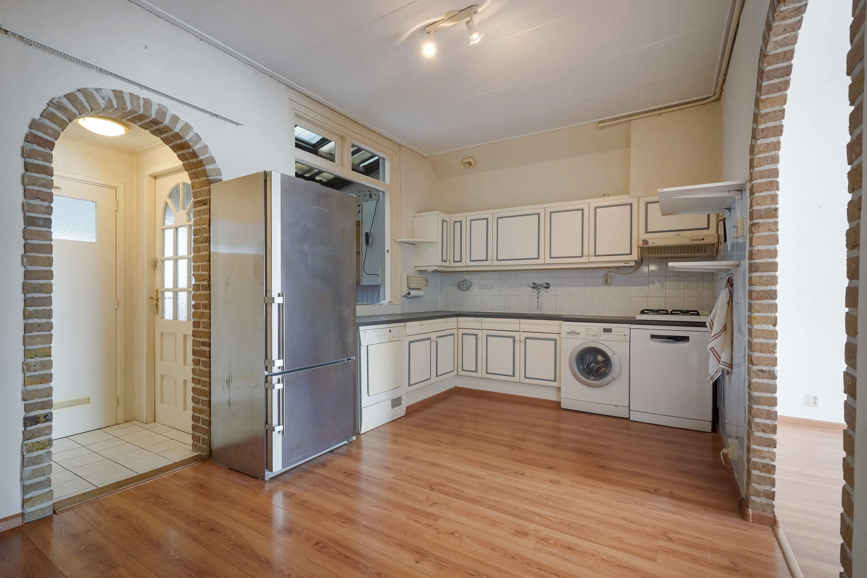 Via een tweede, stenen doorgang zijn toegangsdeuren naar de badkamer, de toiletruimte en de bijkeuken gevestigd.