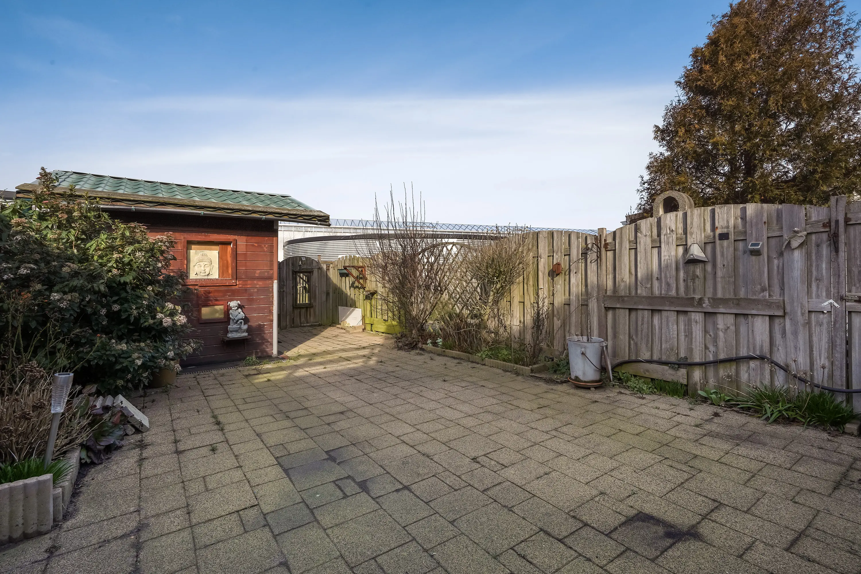 De tuin is grotendeels bestraat, omringd door houten schuttingen, en ingericht met groenborders. Achterin is een achterom aanwezig en staat een vrijstaand houten schuur, voorzien van schuin dak, ramen, regenwater opvang en elektra. De tuin heeft een diepte van ca. 10,85 meter en is gesitueerd op het noordwesten.