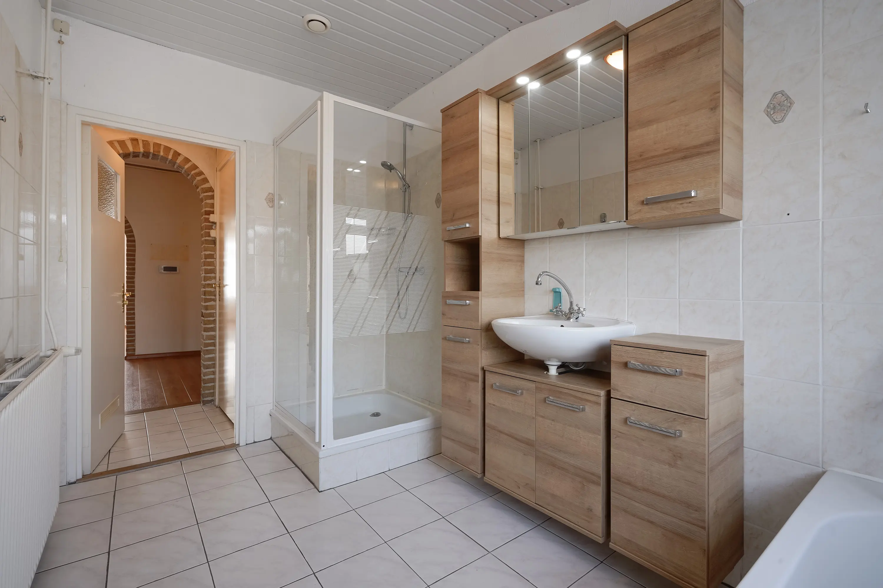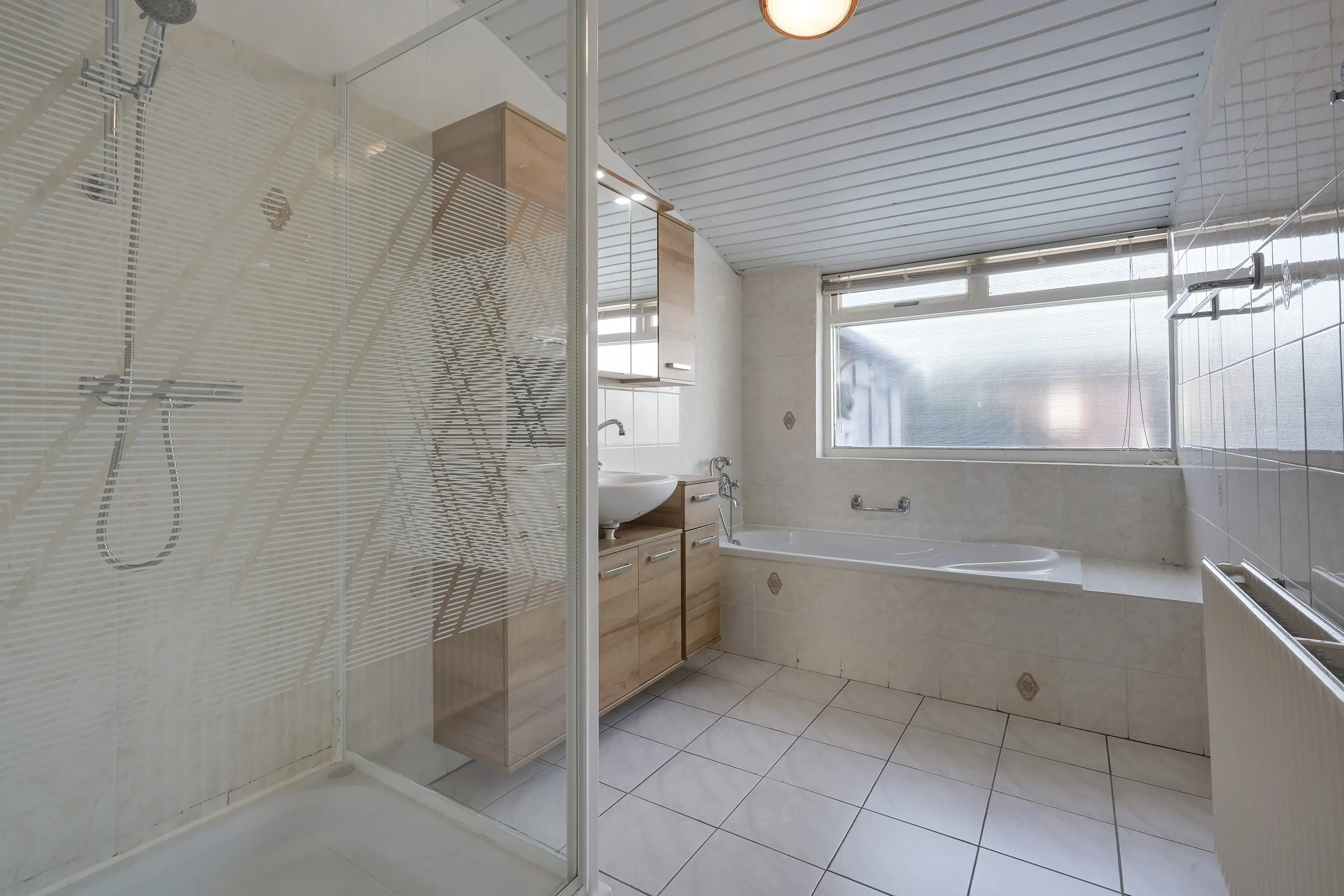 De badkamer, grotendeels betegeld, is ingericht met een ligbad, een inloopdouche en wastafelmeubel, een groot kozijn met te openen kiepraam kijkt uit de tuin, een radiator verwarmt de ruimte.