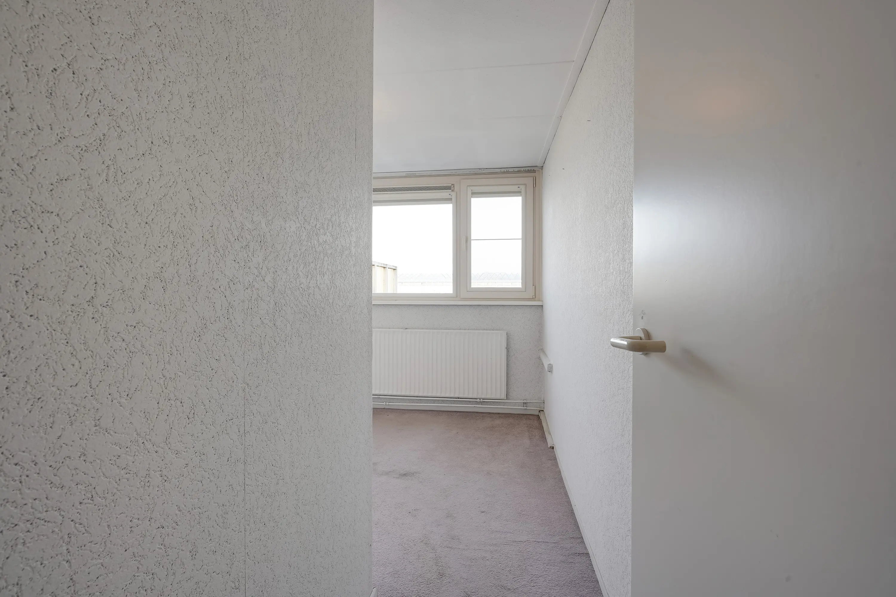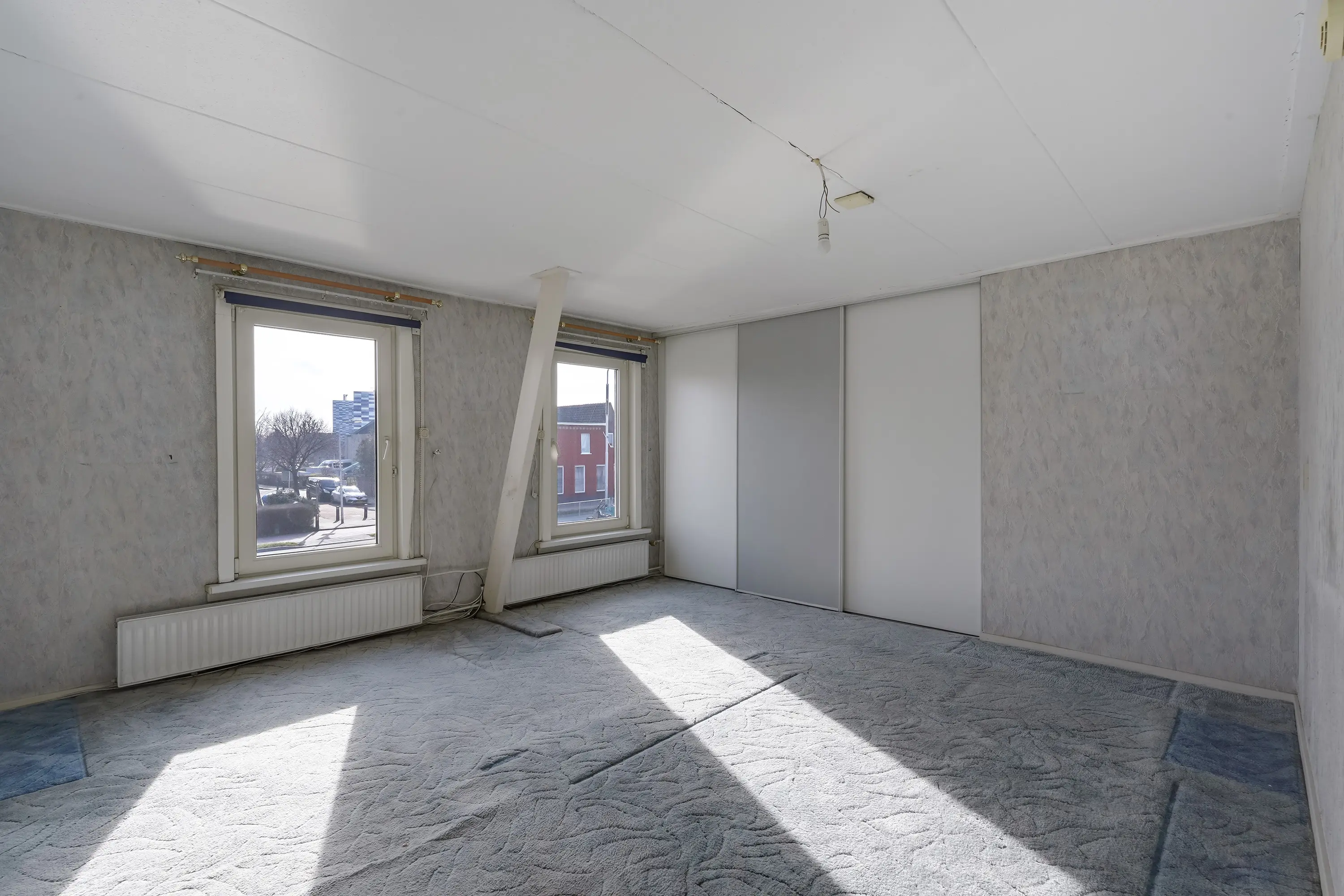 De hoofdslaapkamer is gevestigd aan de voorzijde en geschikt over twee grote ramen met kunststof kozijnen en draai-/kiepramen. In een nis is een plafondhoge kast met schuifwanden geplaatst.