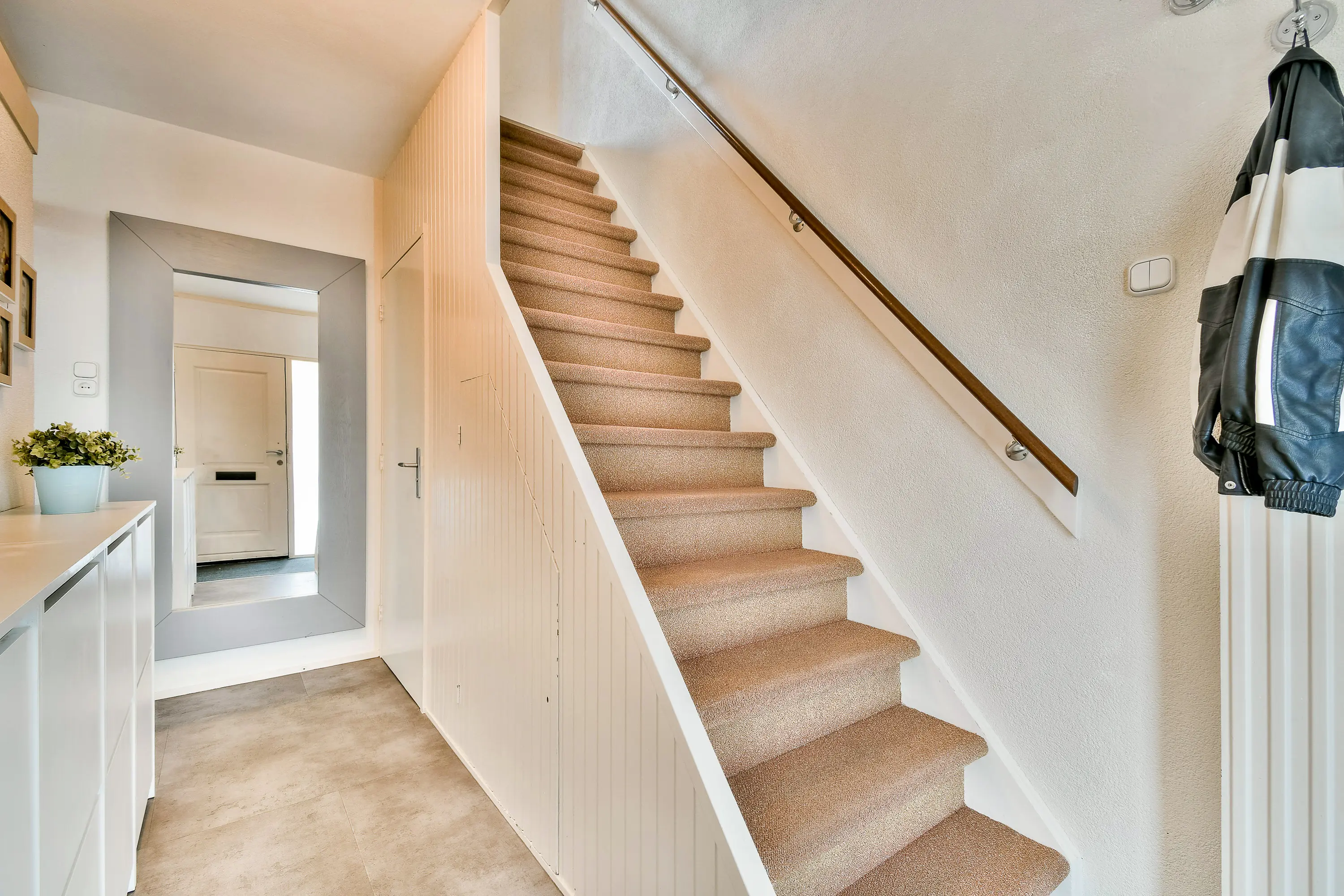 Via de entree komt u in de hal met garderoberuimte, meterkast (voorzien van glasvezelaansluiting) en de trapopgang. Onder de trap bevindt zich een praktische trapkast waar tevens de verdeler en de pomp van de vloerverwarming zijn geplaatst.