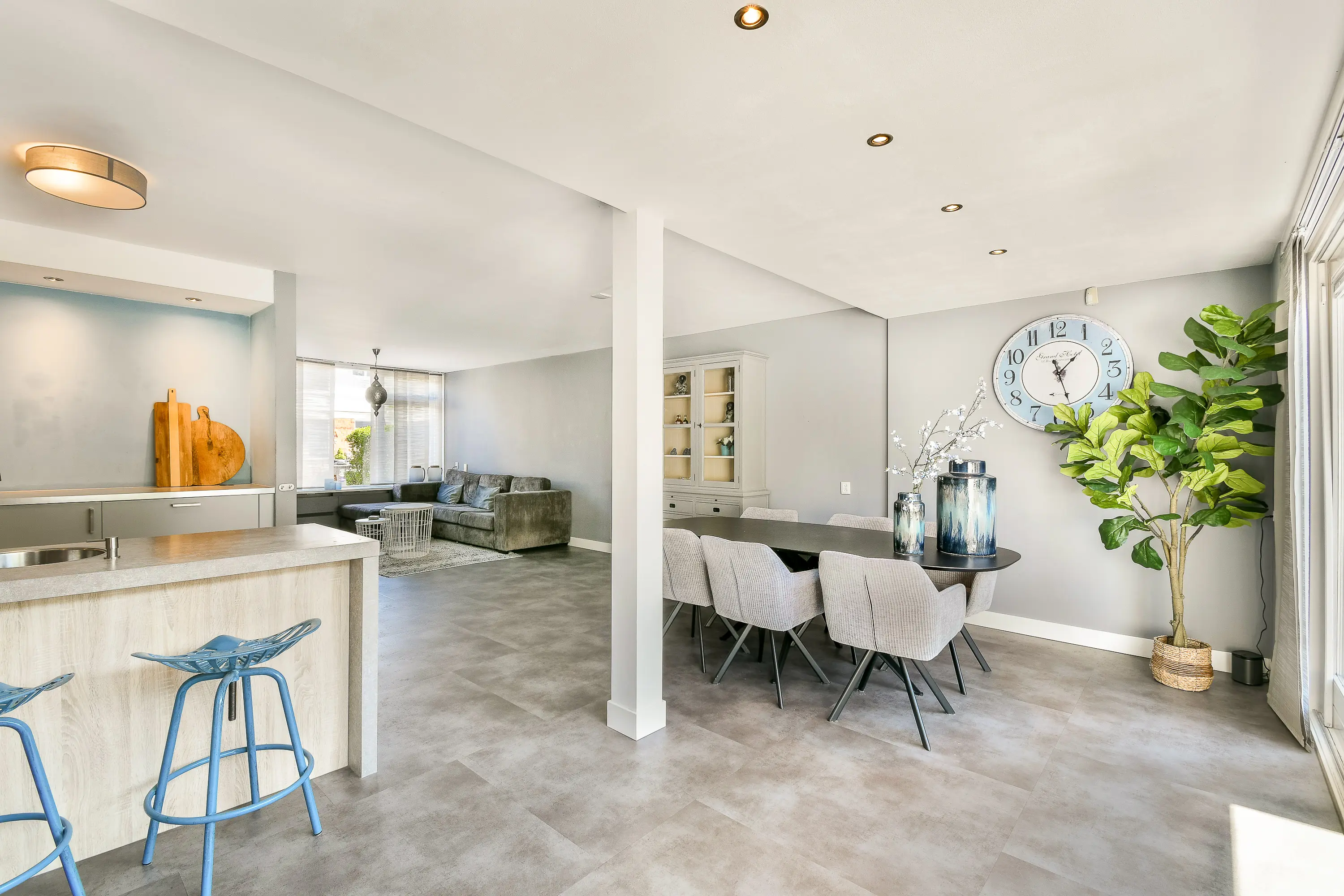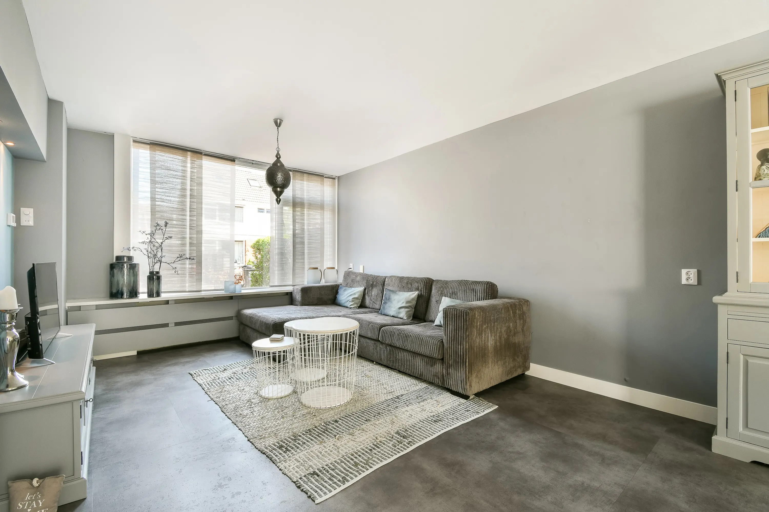 De lichte en ruime woonkamer is heerlijk open en staat in directe verbinding met de eetkamer en de keuken. De moderne PVC-vloer met vloerverwarming zorgt voor een strakke uitstraling en extra comfort. Zowel de wanden als het plafond zijn strak afgewerkt, in het gestuukte plafond zijn lichtspots verwerkt.