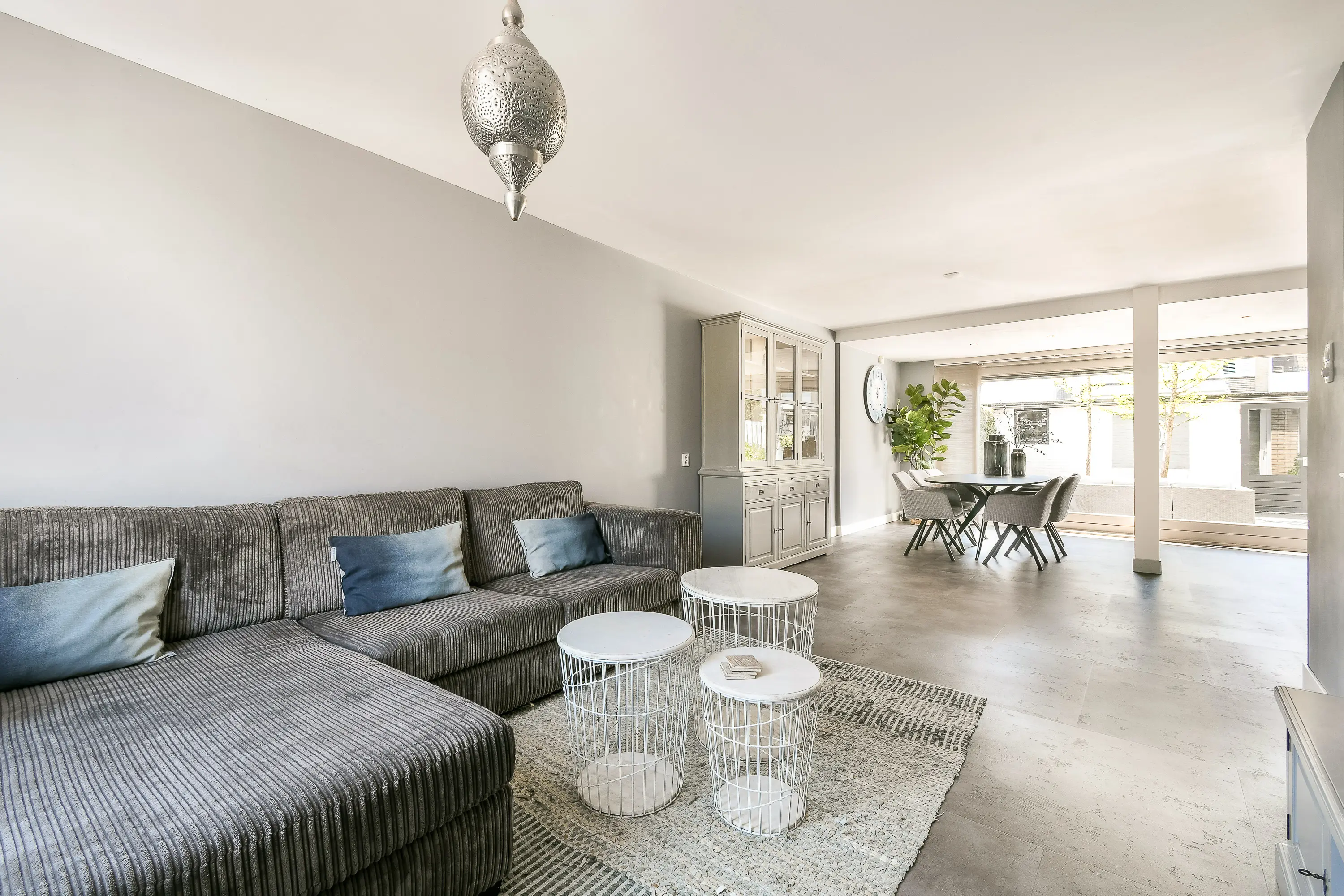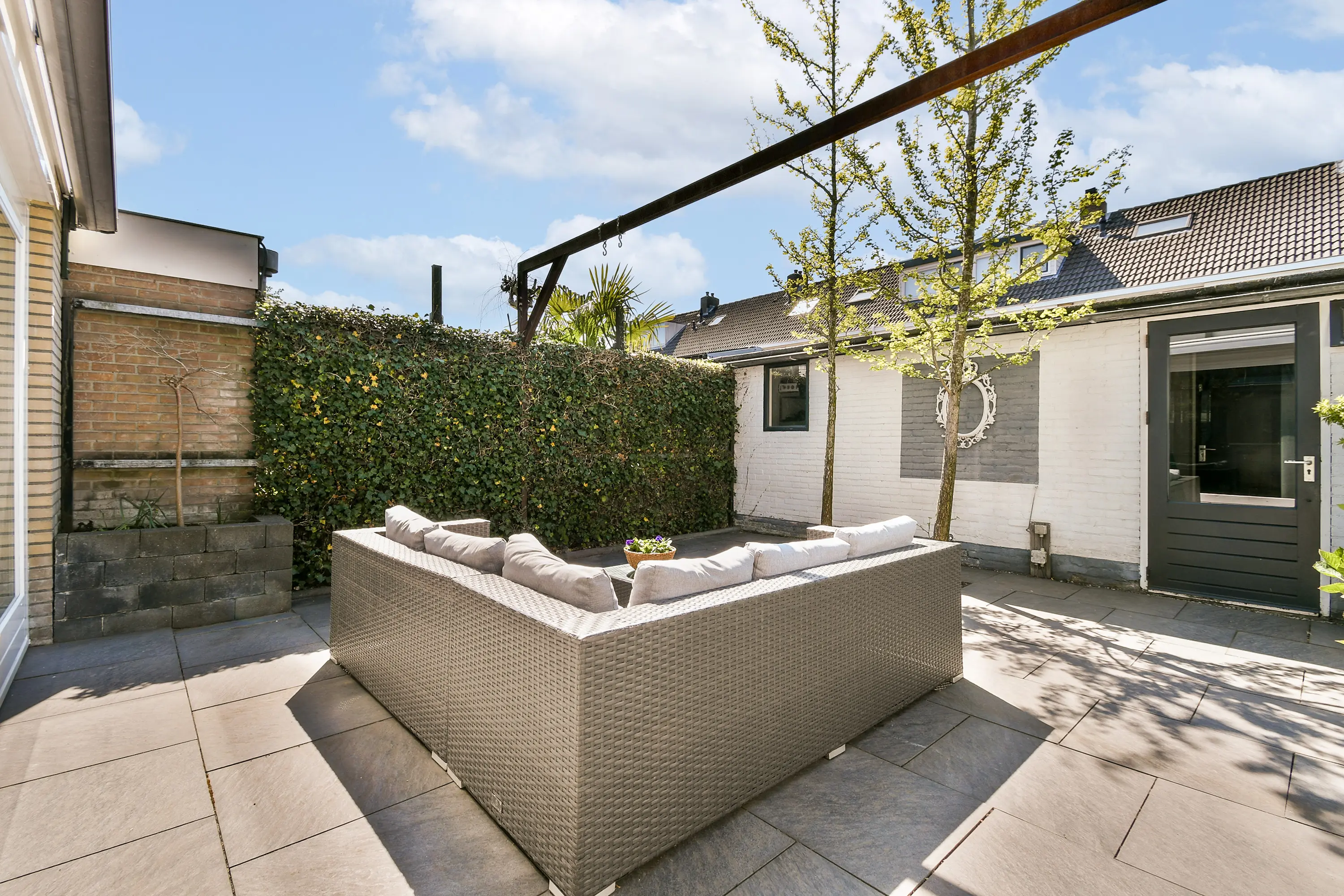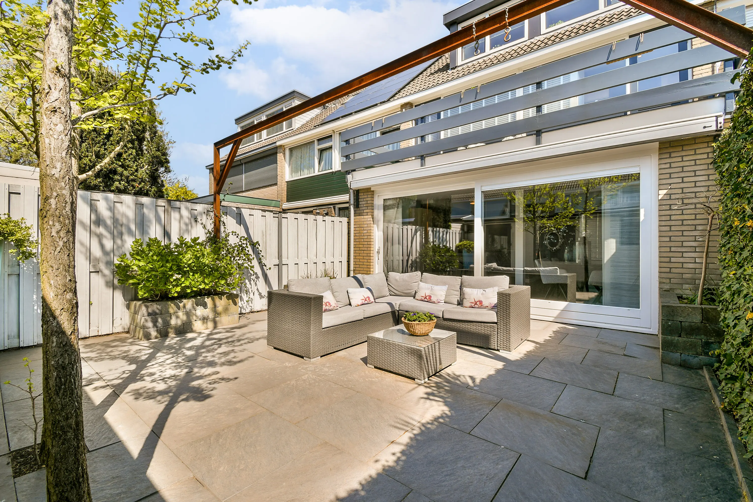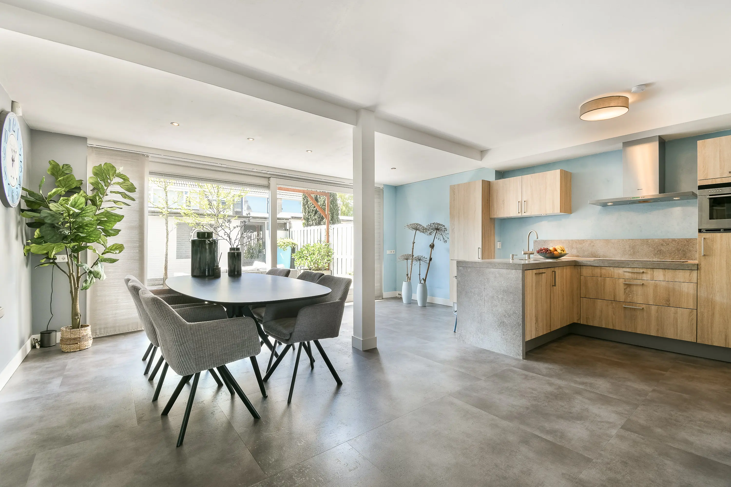 Dankzij de brede schuifpui aan de achterzijde stroomt het daglicht rijkelijk naar binnen en wordt de tuin een natuurlijk verlengstuk van de leefruimte.