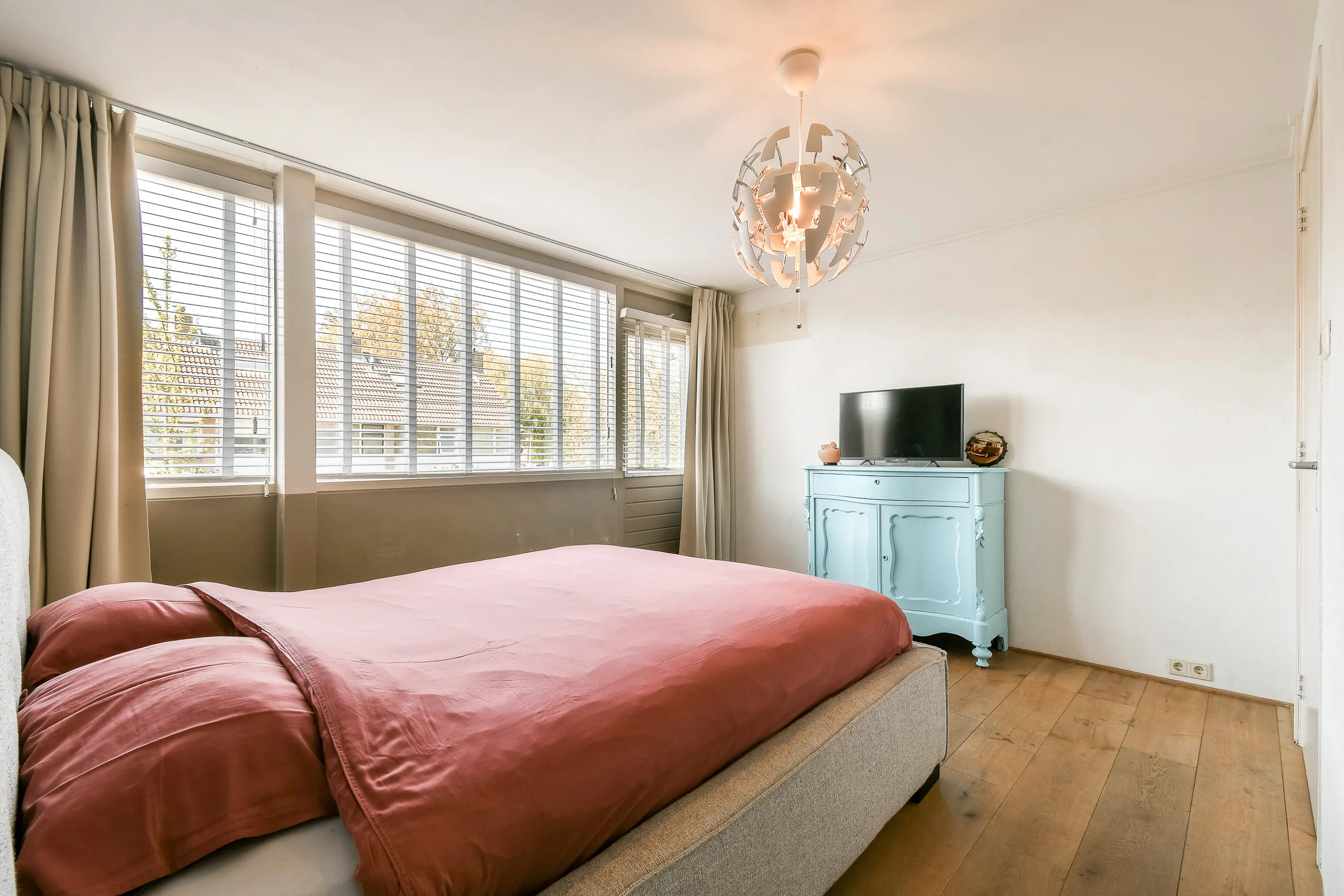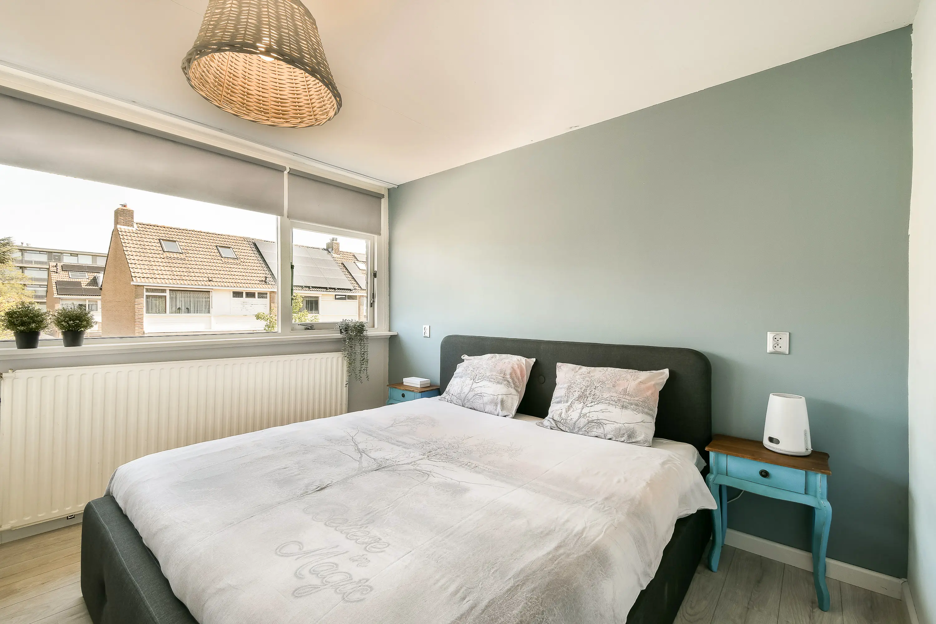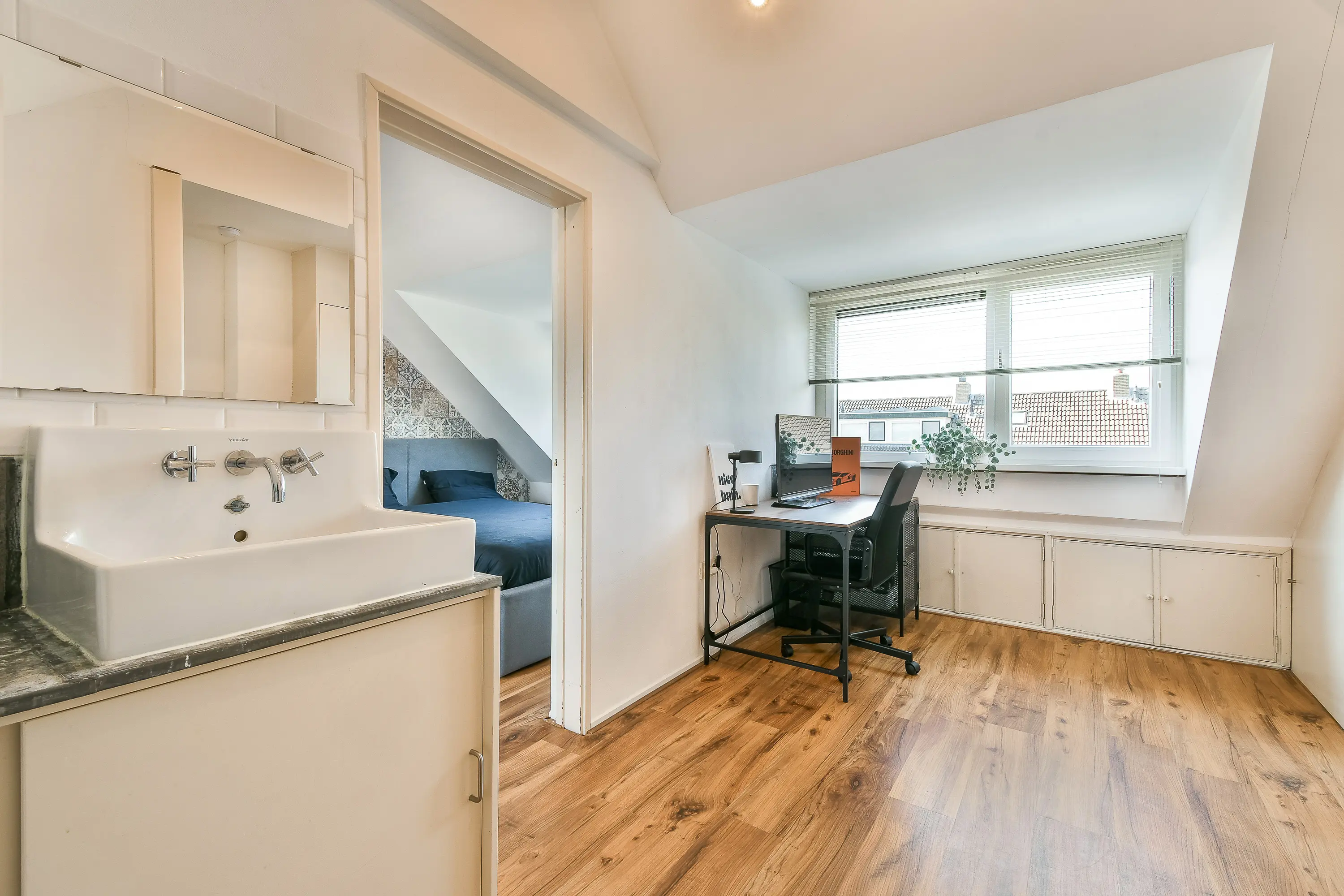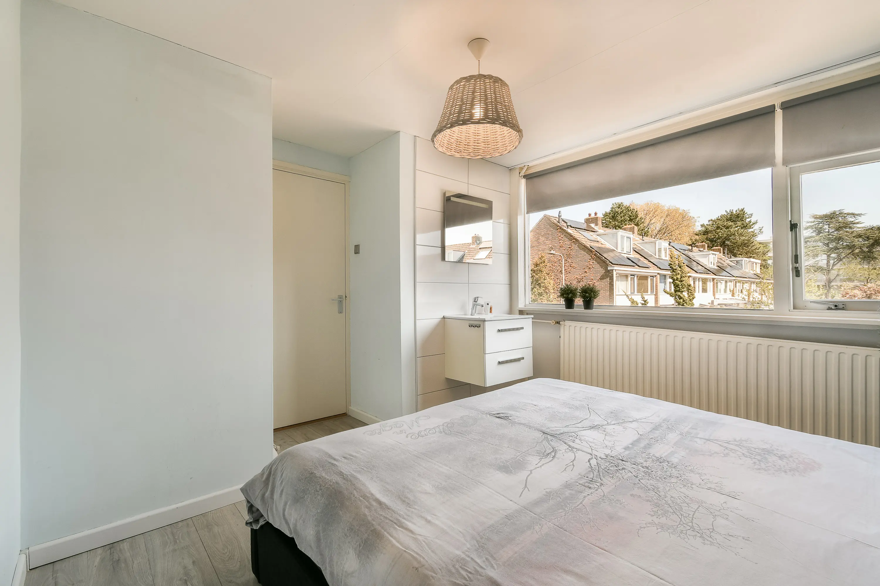 Aan de voorzijde bevindt zich een slaapkamer met laminaatvloer, isolerende beglazing en een eigen wastafelmeubel.