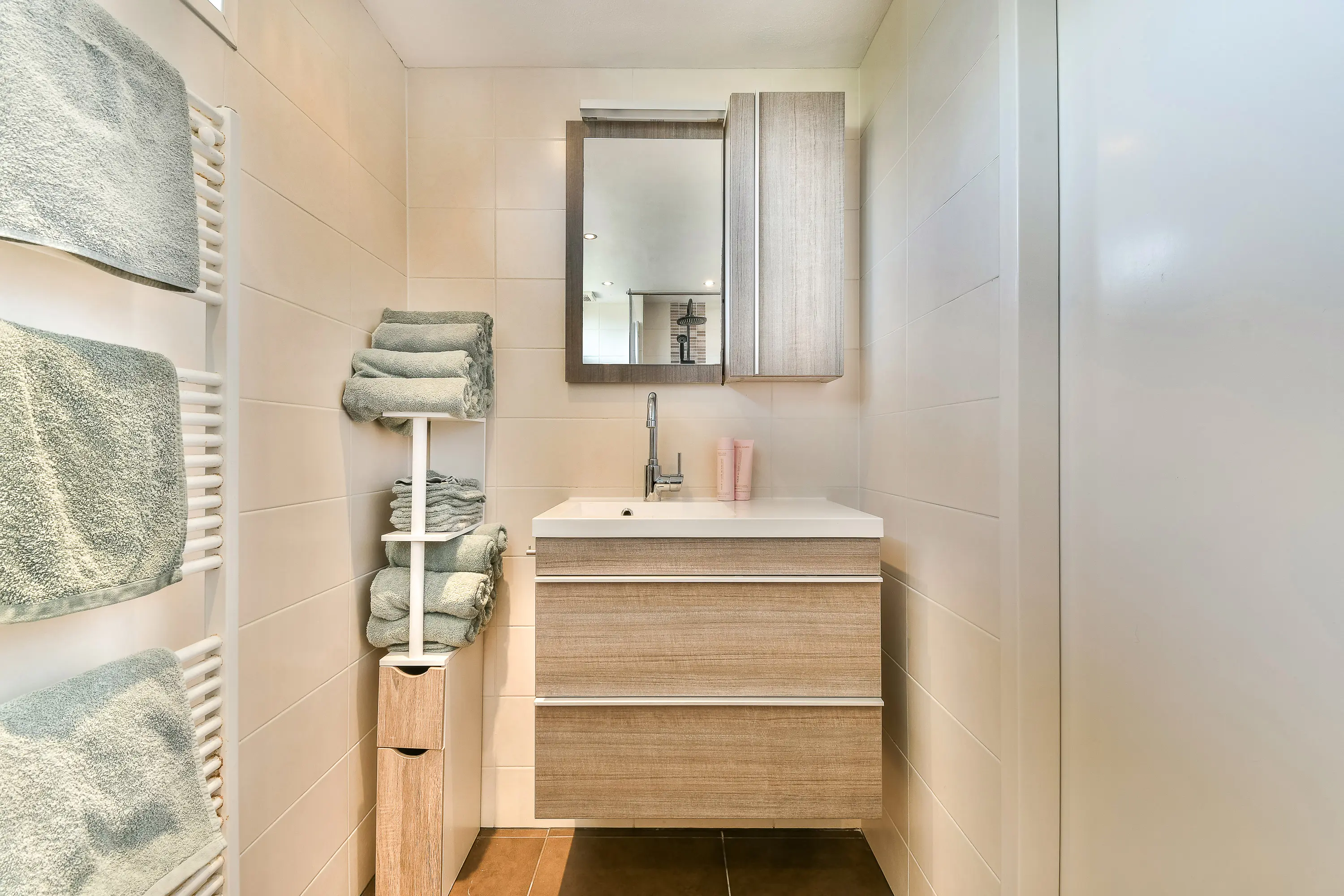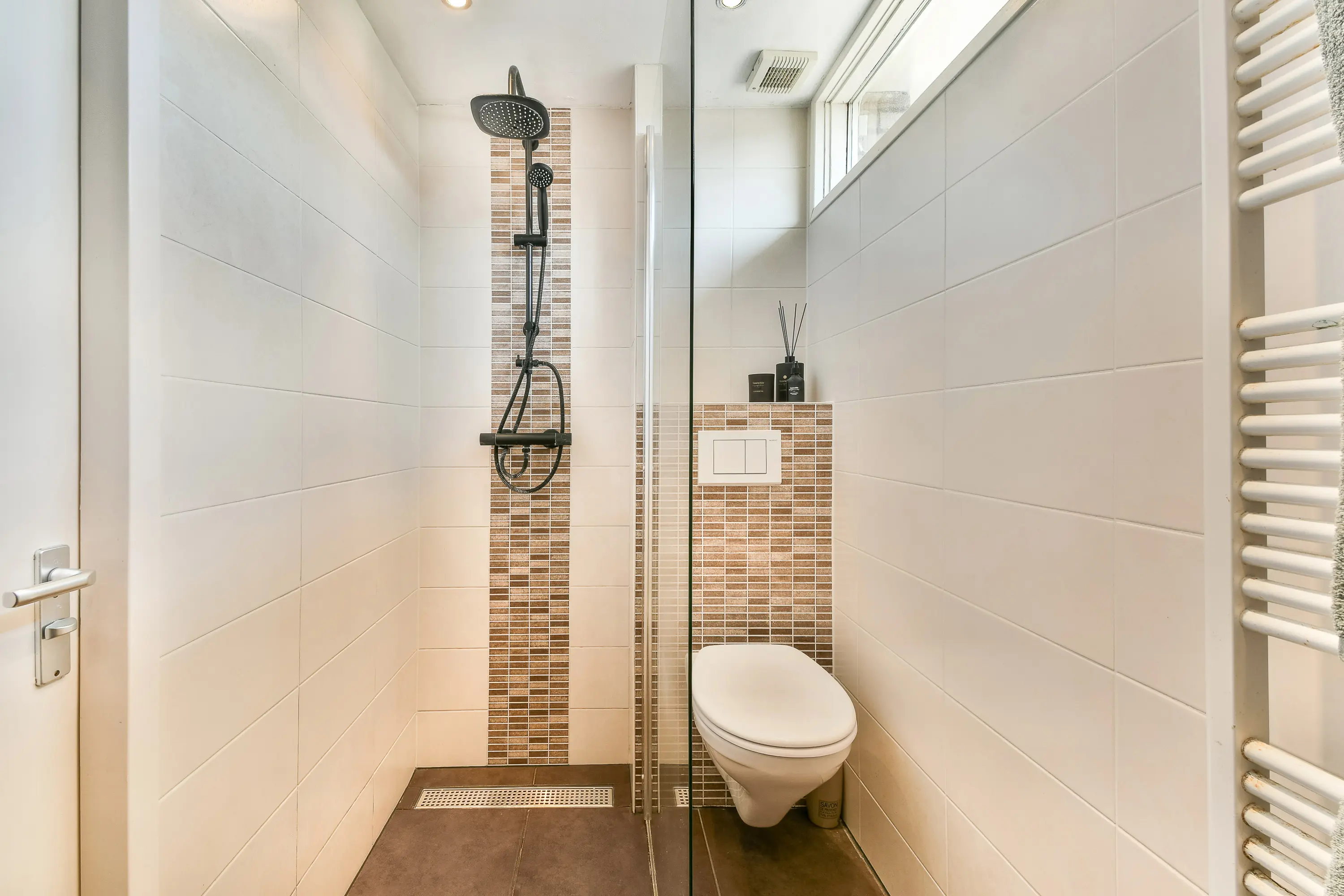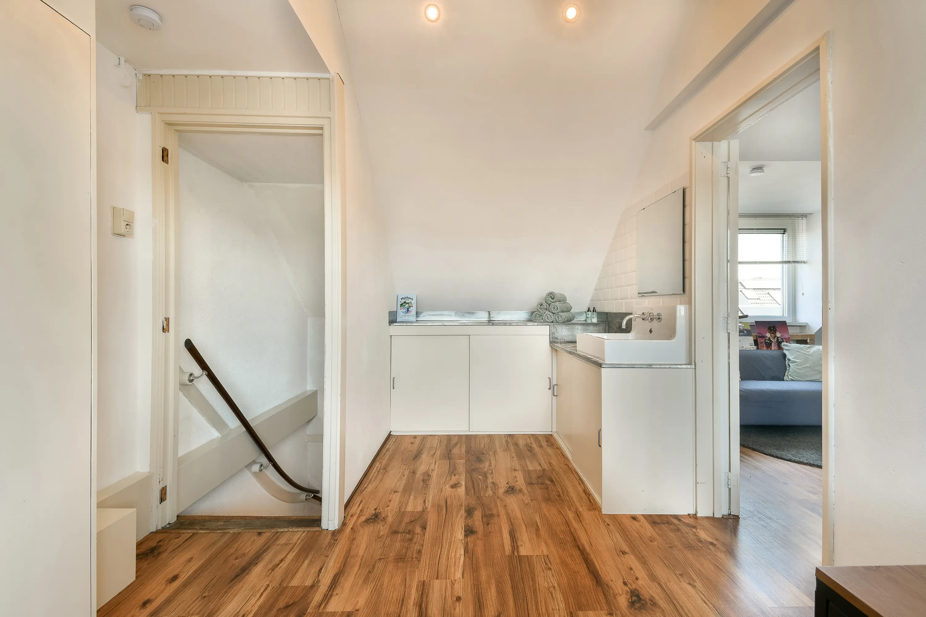 De overloop biedt toegang tot twee slaapkamers en de moderne badkamer. De badkamer aan de voorzijde is ingericht met een zwevend toilet, inloopdouche met glazen wand, wastafelmeubel, designradiator en mechanische ventilatie.