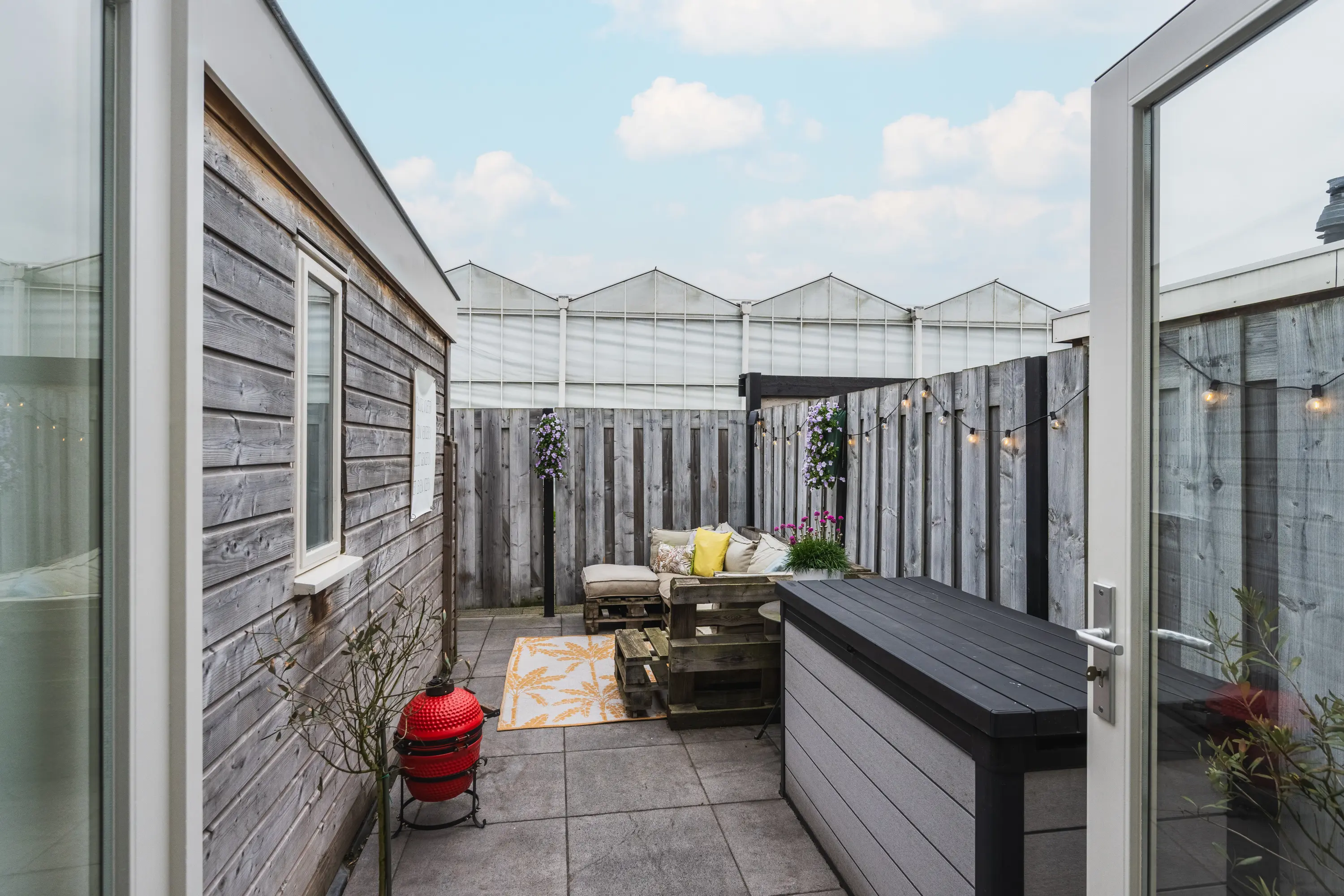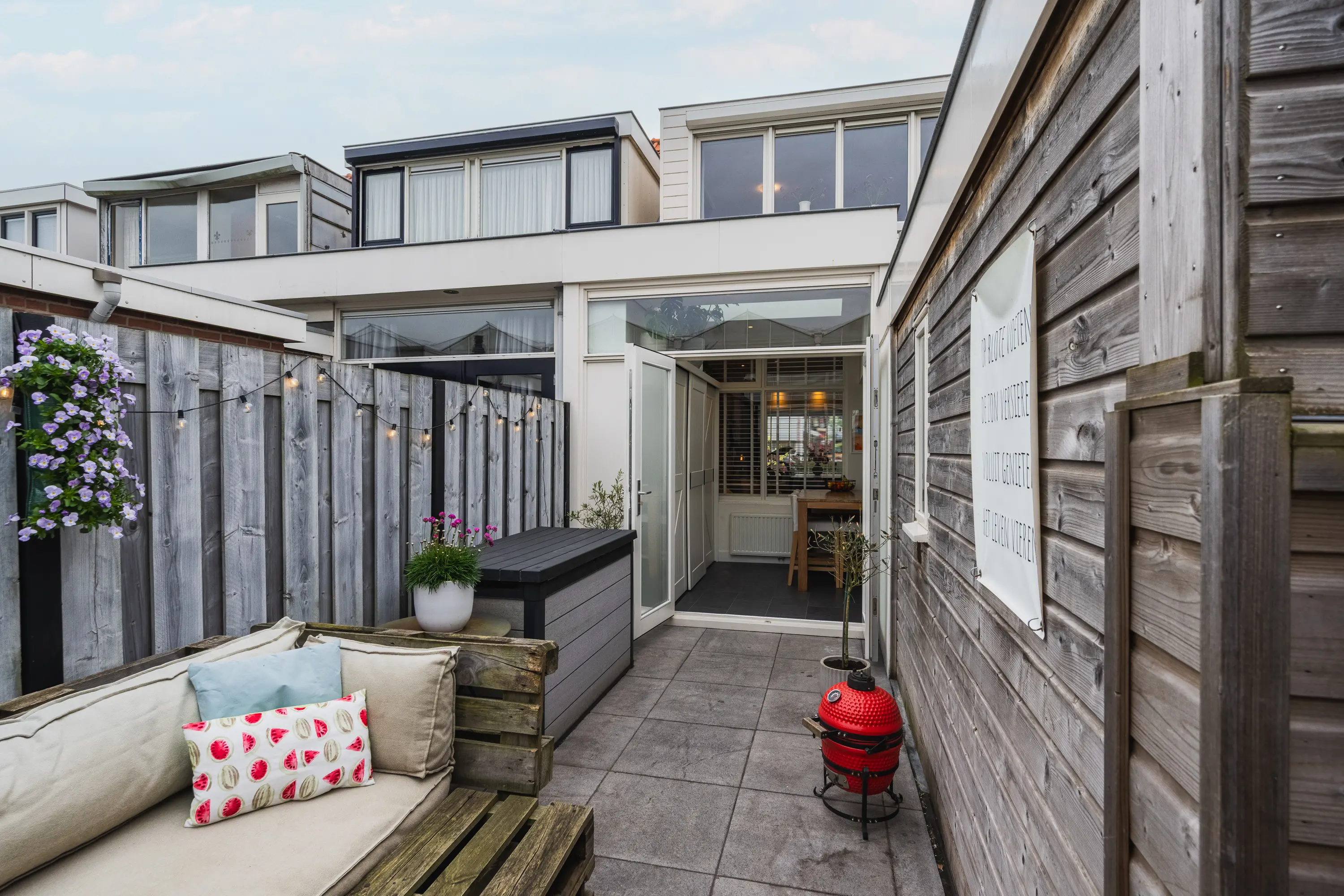 De achtertuin is in 2020 vernieuwd en verzorgd aangelegd met grijze tegels, een houten schutting en een fijne overkapping. Direct achter de woning bevinden zich een speeltuin en parkeergelegenheid.