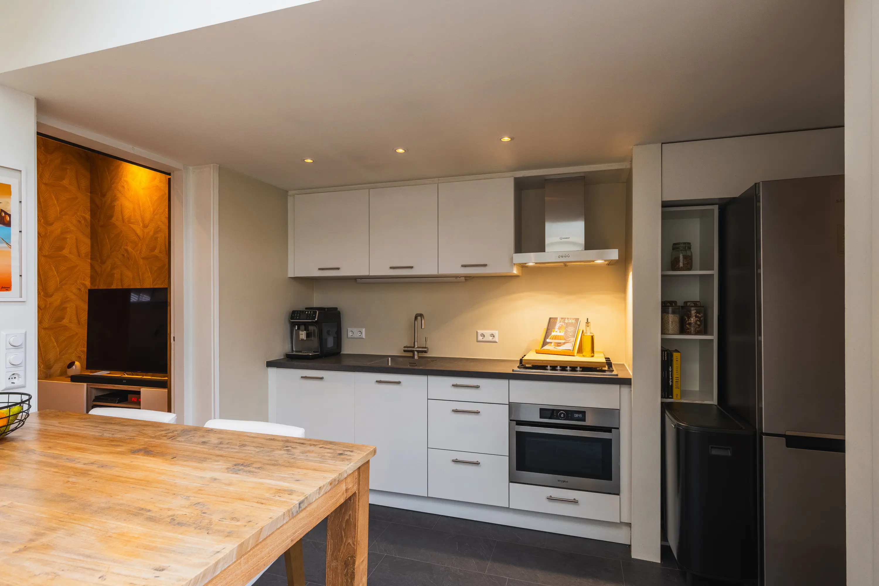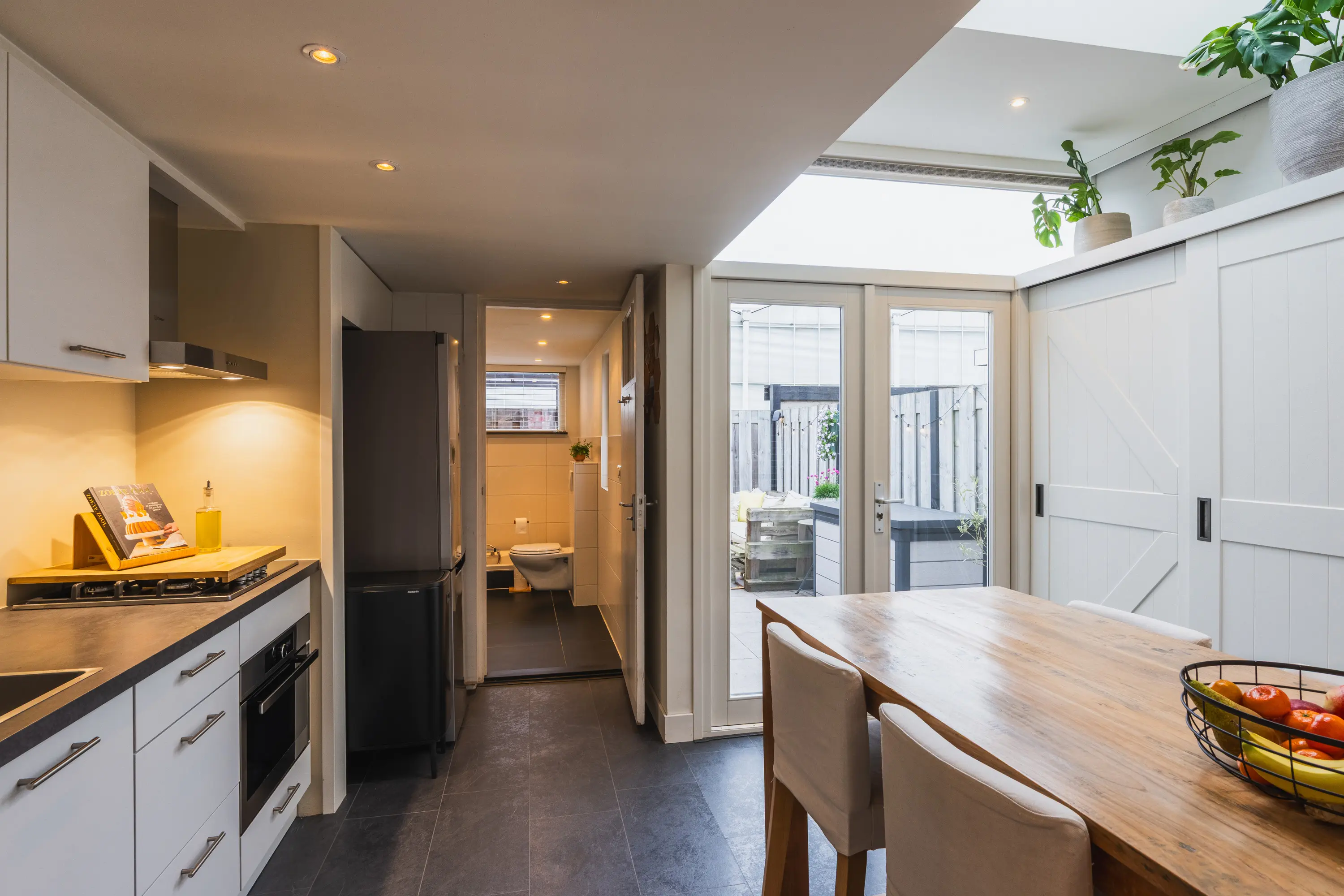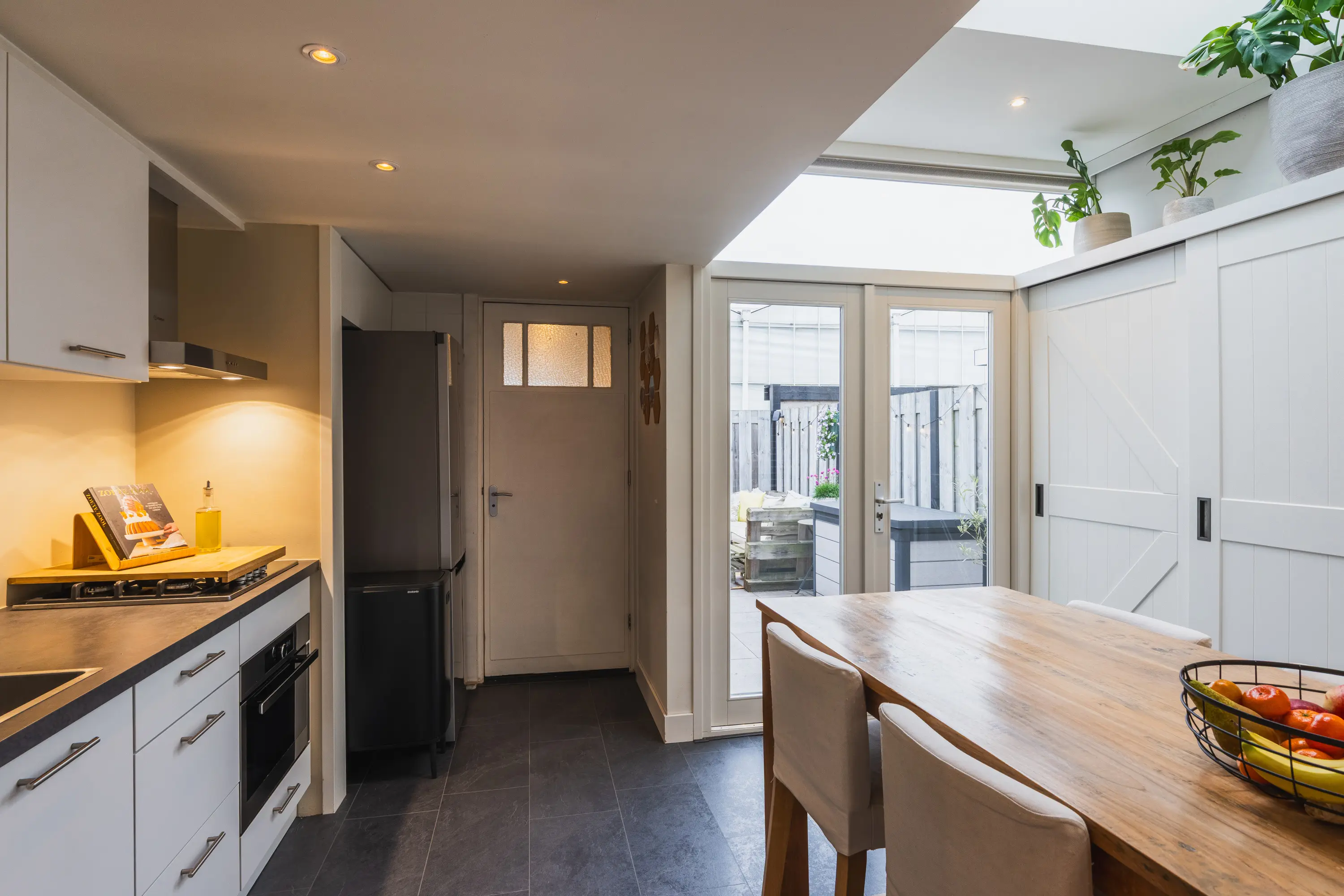 De keuken (2019) bevindt zich in de aanbouw en heeft een tijdloze uitstraling dankzij de neutrale kleurstelling en strak gestucte wanden. De keuken is uitgerust met diverse inbouwapparatuur, waaronder een 4-pits gaskookplaat, vaatwasser en combi-oven/magnetron. Het laminaat op de vloer maakt het geheel praktisch in onderhoud. De combinatie van neutrale kleuren, strakke afwerking en veel lichtinval via de lichtstraat (2021) zorgt voor een ruimtelijk en fris geheel. De aanbouw is voorzien van een ruime inbouwkast met plek voor de kapstok, witgoed en overige opbergruimte. Via de openslaande deuren (2021) bereik je de fraai aangelegde achtertuin.
