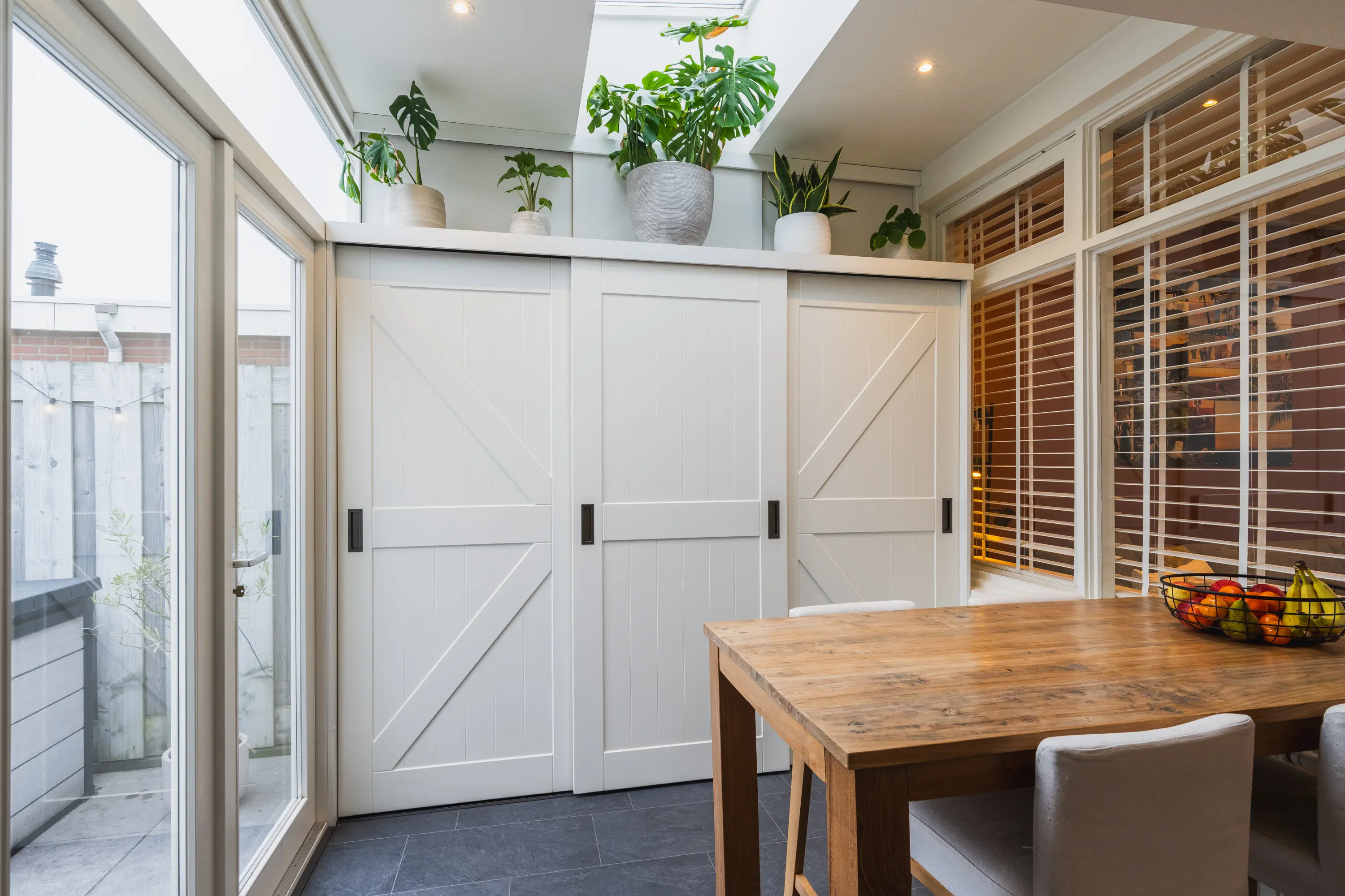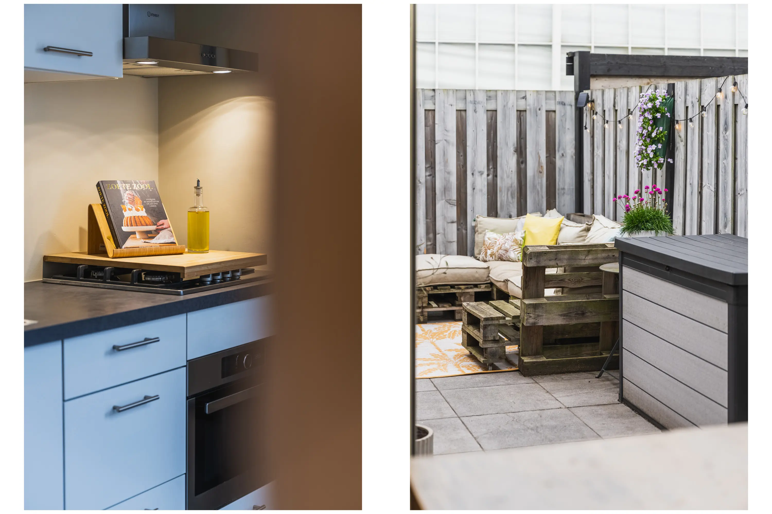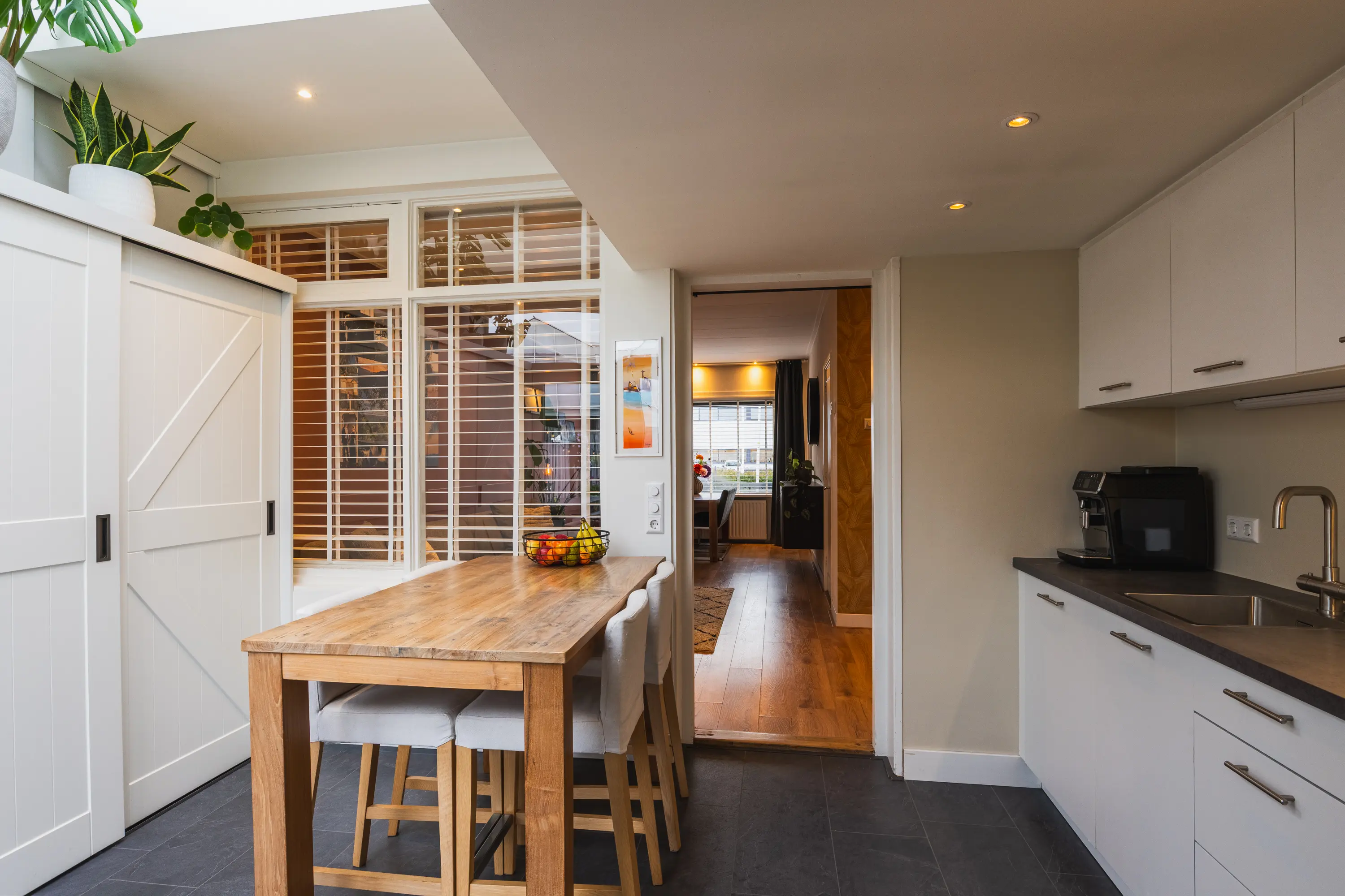 De keuken (2019) bevindt zich in de aanbouw en heeft een tijdloze uitstraling dankzij de neutrale kleurstelling en strak gestucte wanden. De keuken is uitgerust met diverse inbouwapparatuur, waaronder een 4-pits gaskookplaat, vaatwasser en combi-oven/magnetron. Het laminaat op de vloer maakt het geheel praktisch in onderhoud. De combinatie van neutrale kleuren, strakke afwerking en veel lichtinval via de lichtstraat (2021) zorgt voor een ruimtelijk en fris geheel. De aanbouw is voorzien van een ruime inbouwkast met plek voor de kapstok, witgoed en overige opbergruimte. Via de openslaande deuren (2021) bereik je de fraai aangelegde achtertuin.