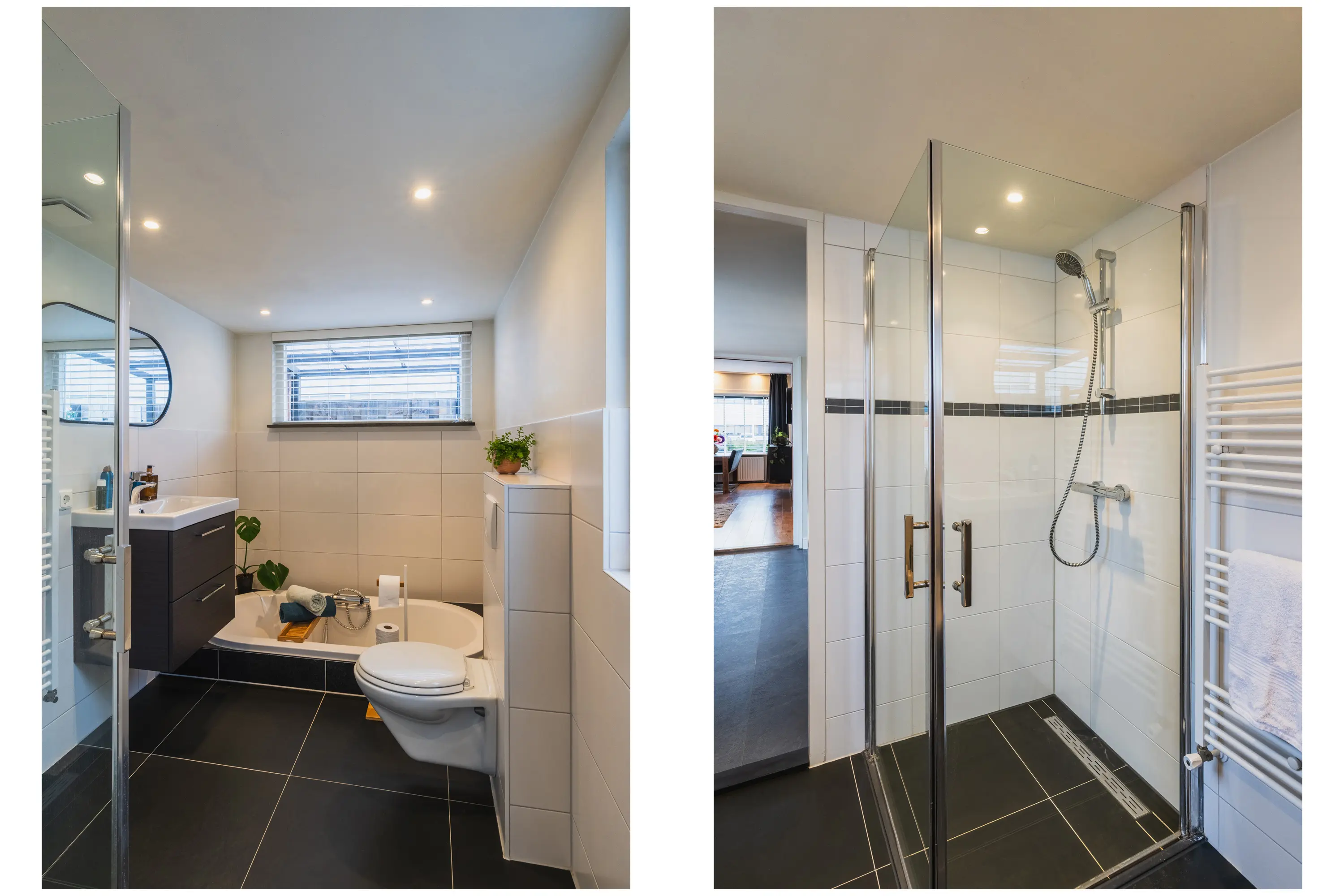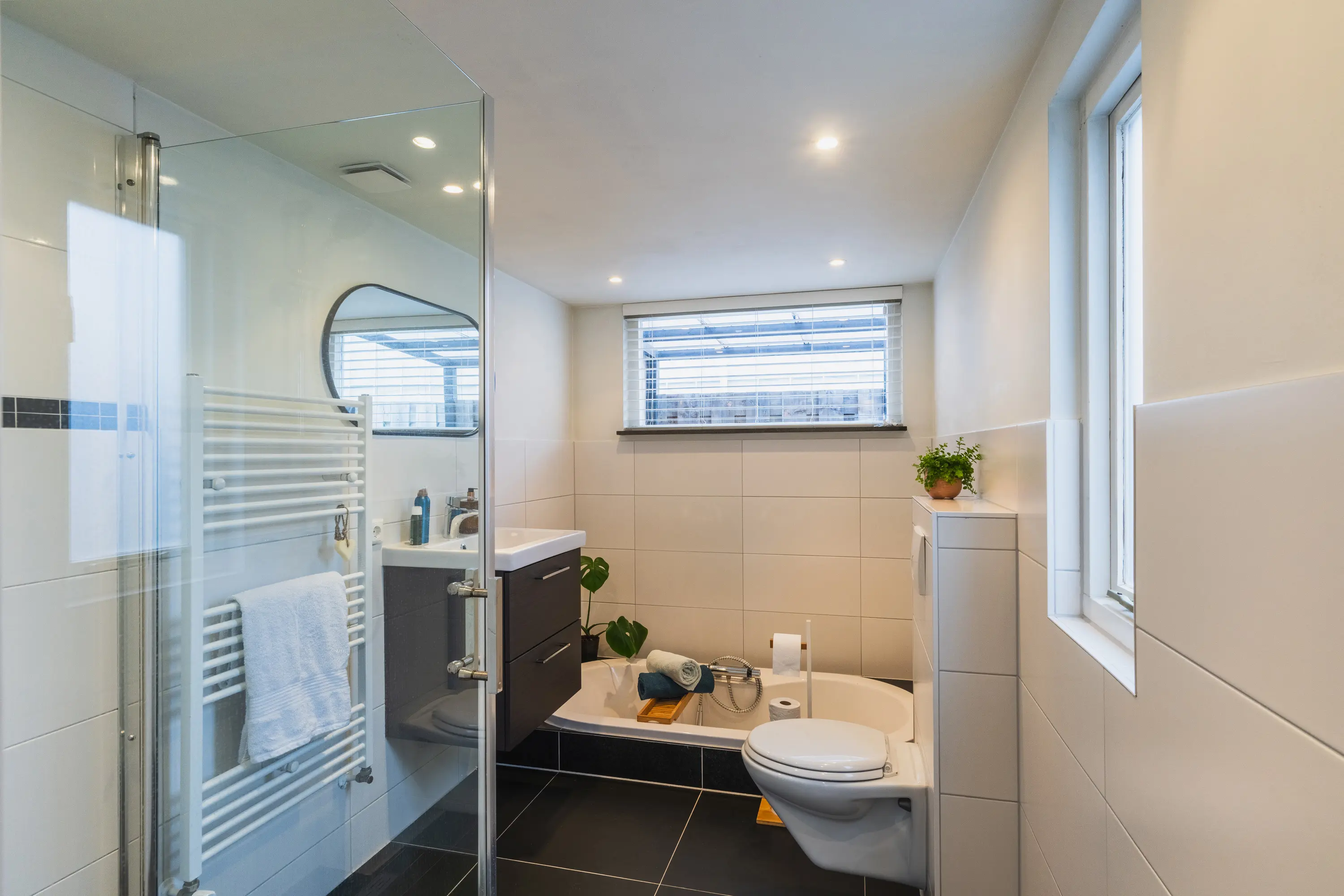 Aansluitend aan de keuken bevindt zich de ruime badkamer (2013), gelegen op de begane grond. Deze is compleet uitgevoerd met een verzonken ligbad, douche, toilet en wastafelmeubel en is afgewerkt in eveneens een neutrale stijl met betegelde en gestucte wanden.