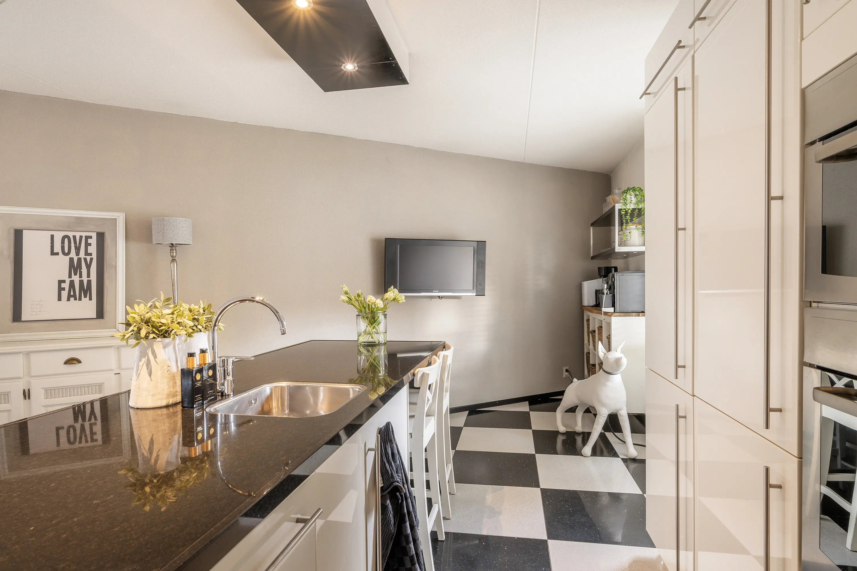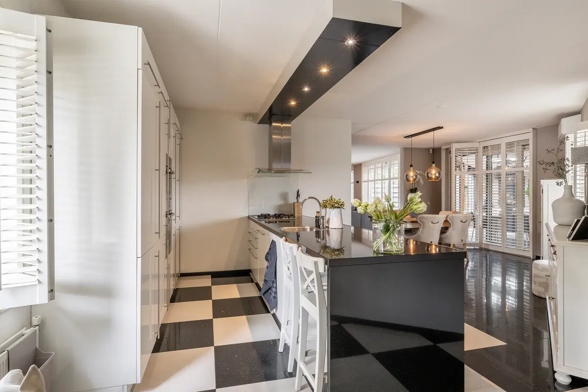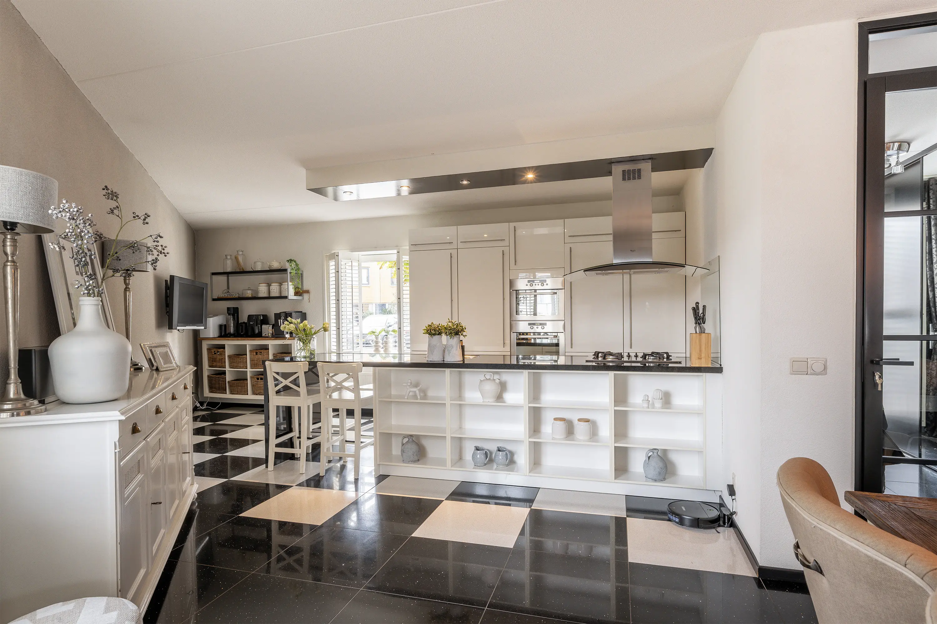 Aan de rechterzijde bevindt zich de open keuken, uitgevoerd in wit hoogglans met een granieten werkblad. De keuken is voorzien van diverse inbouwapparatuur, waaronder een gasfornuis met afzuigkap, combi-oven en magnetron, en een in 2023 vernieuwde koel-vriescombinatie en vaatwasser.