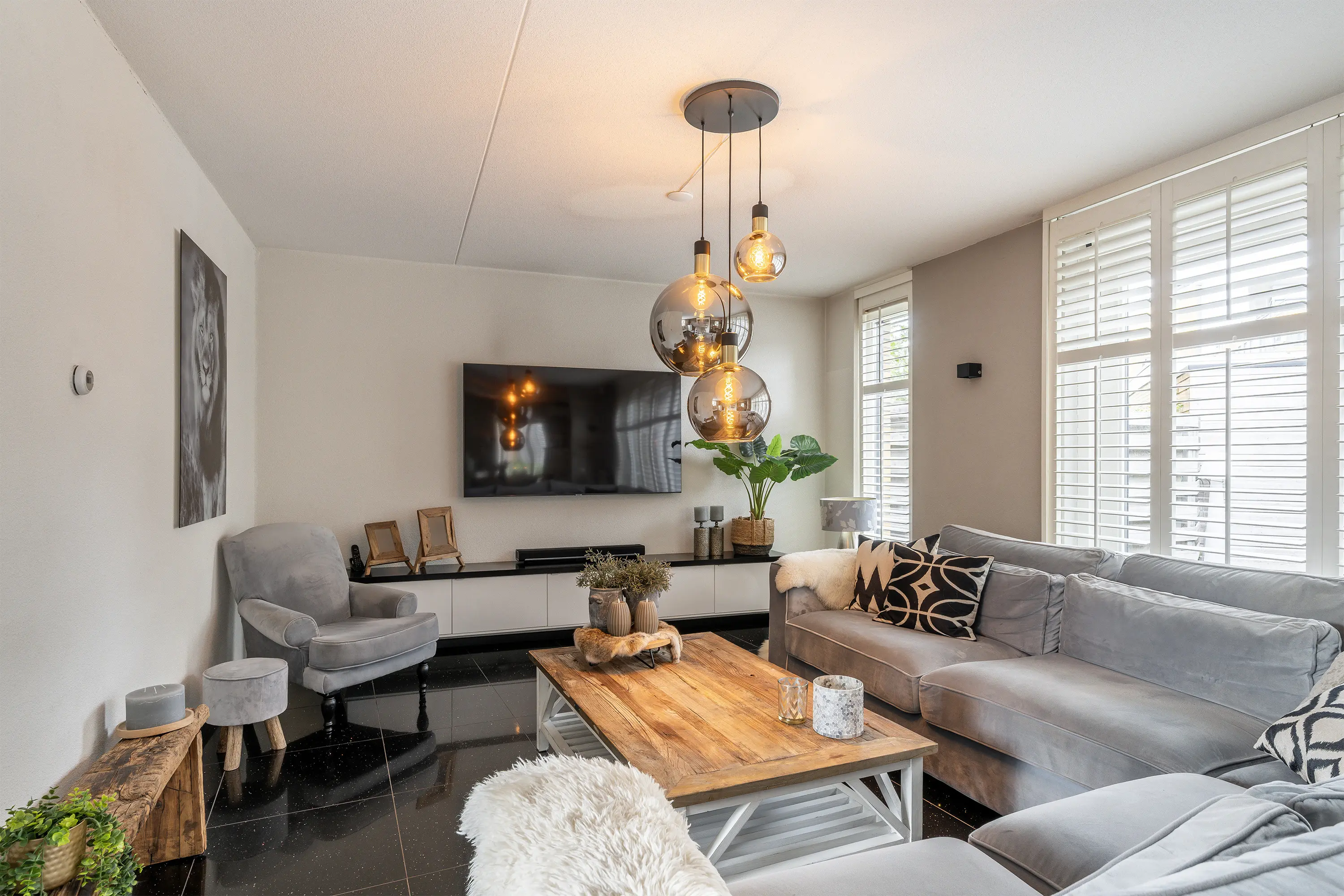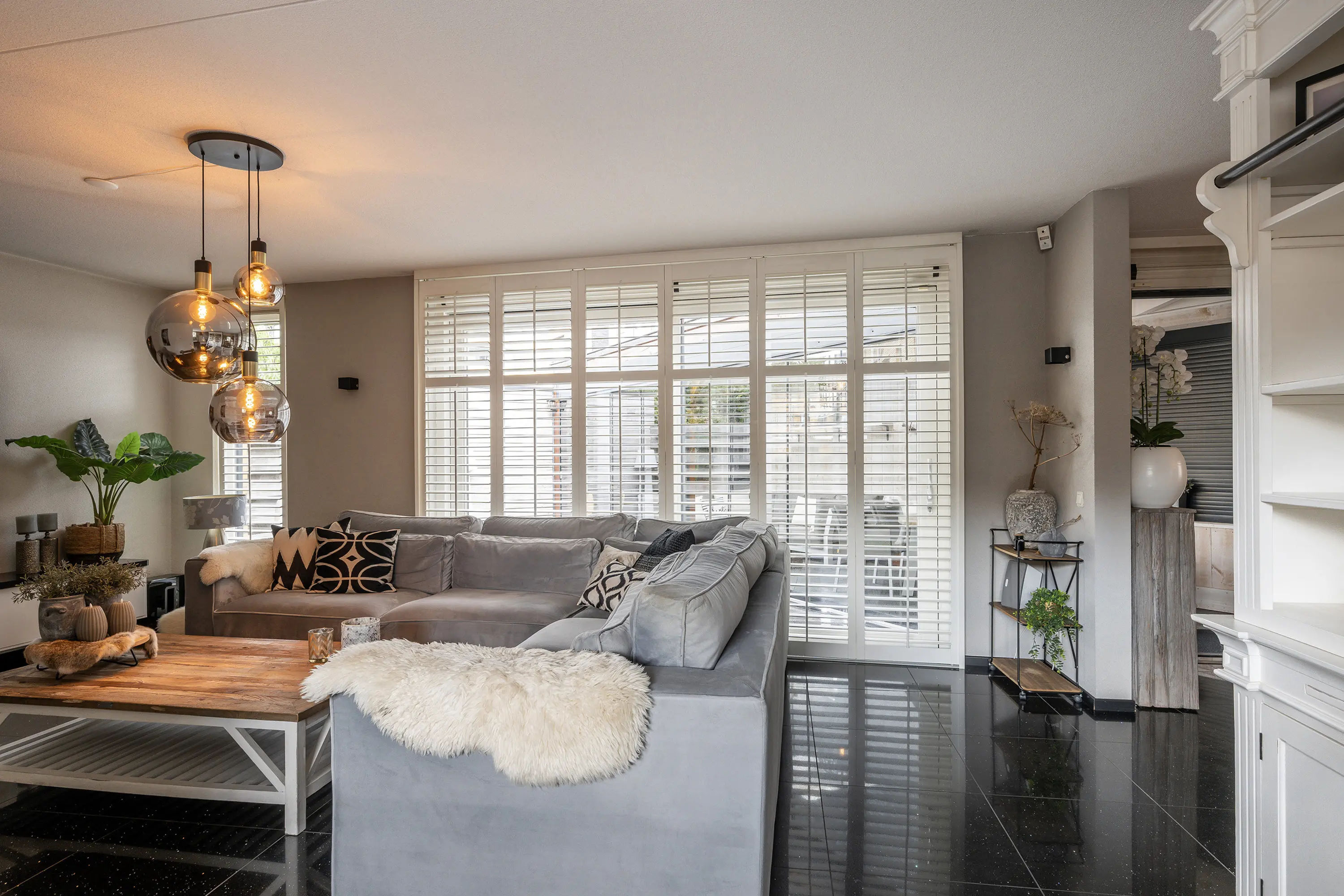 De woonkamer zelf is gelegen aan de achterzijde van de woning en biedt dankzij de grote raampartijen en schuifpui van vloer tot plafond een prachtige lichtinval en directe toegang tot de tuin.