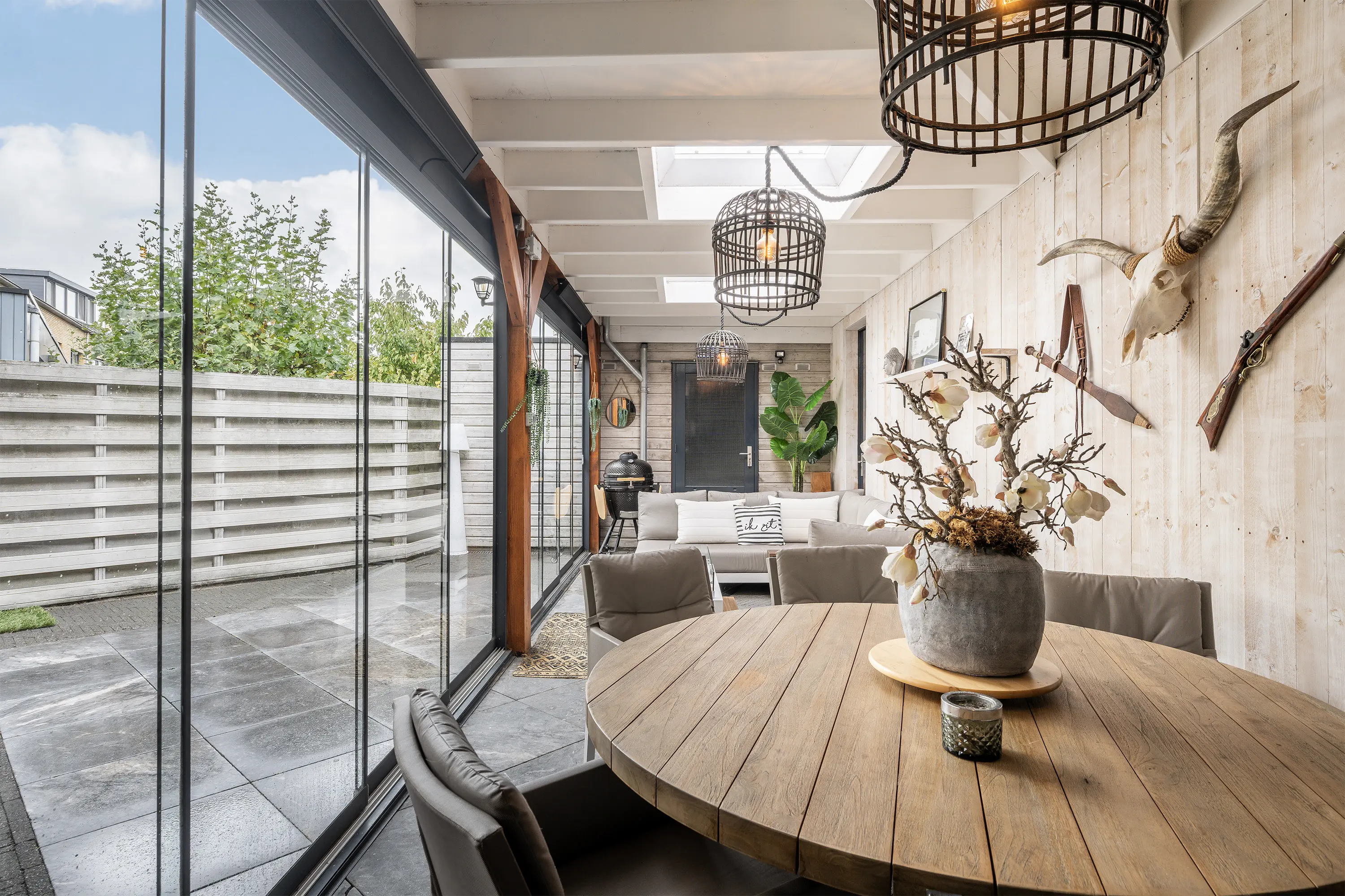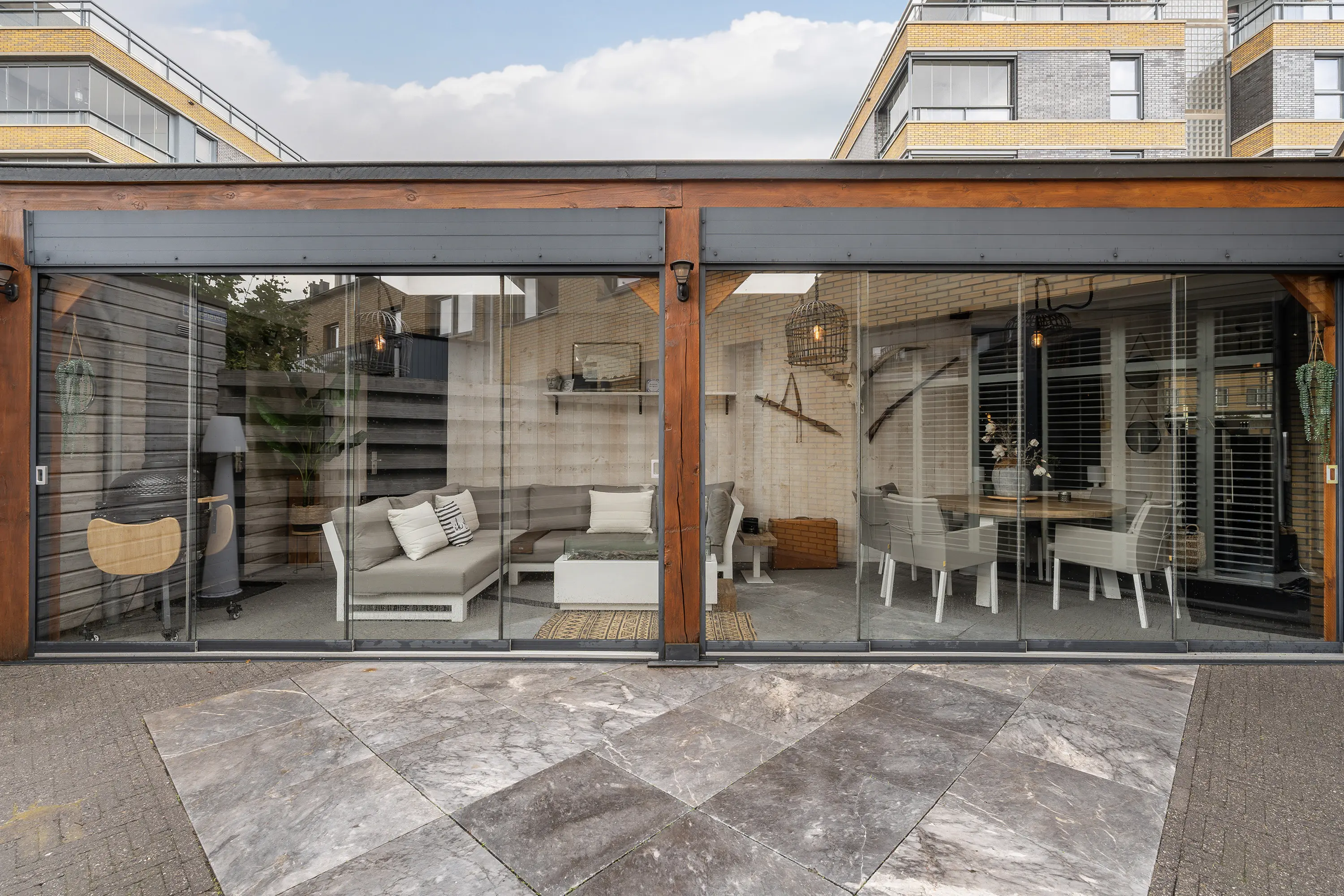 Dankzij de glazen wanden geniet u hier het hele jaar door — ’s zomers met open schuifpanelen, ’s winters knus beschut onder de heaters.