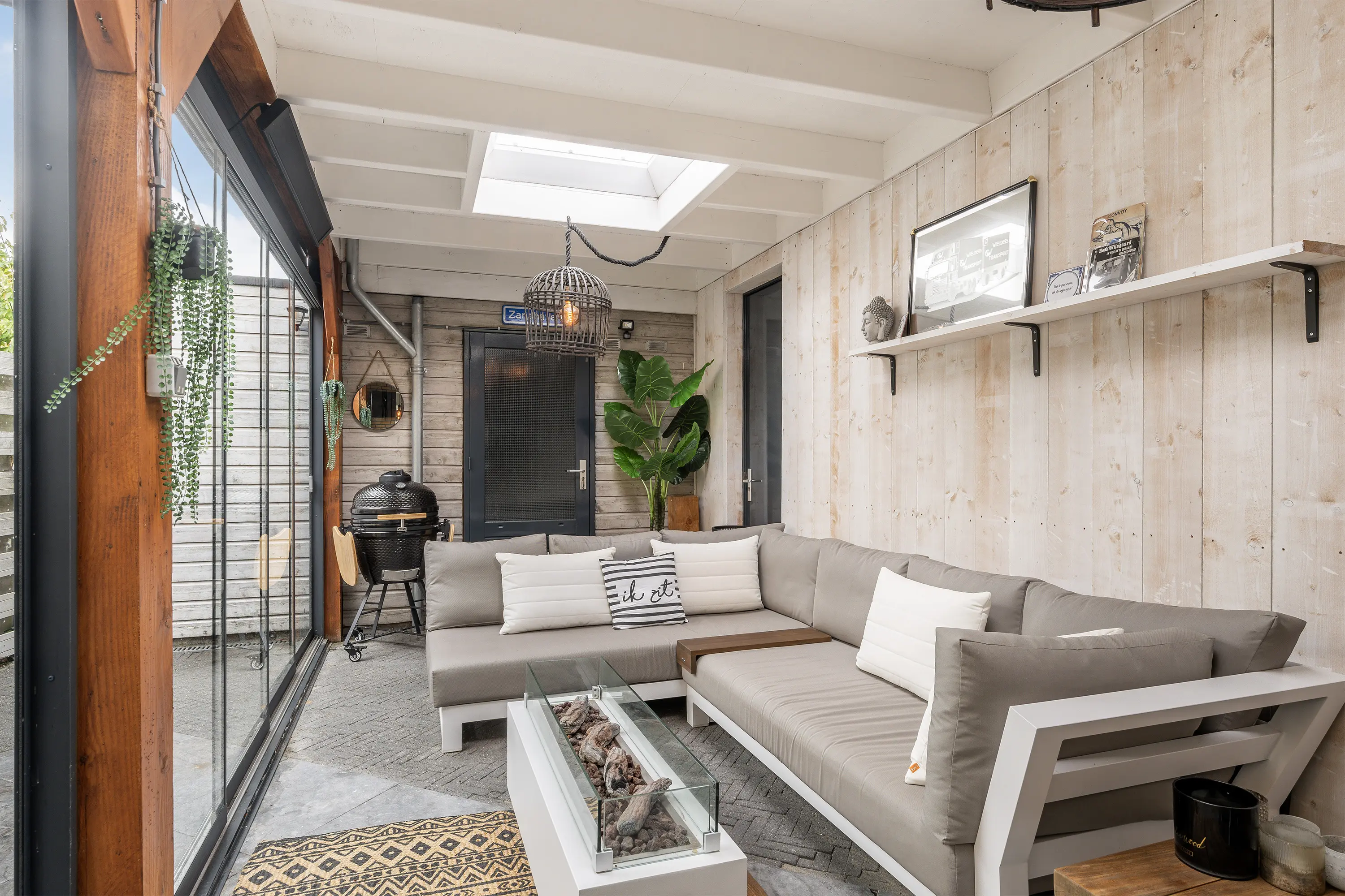 De achtertuin is volledig bestraat en voorzien van een sfeervolle veranda (ca. 5 jaar oud) met glazen schuifwanden, verlichting, verwarming en ruimte voor een royale zithoek.