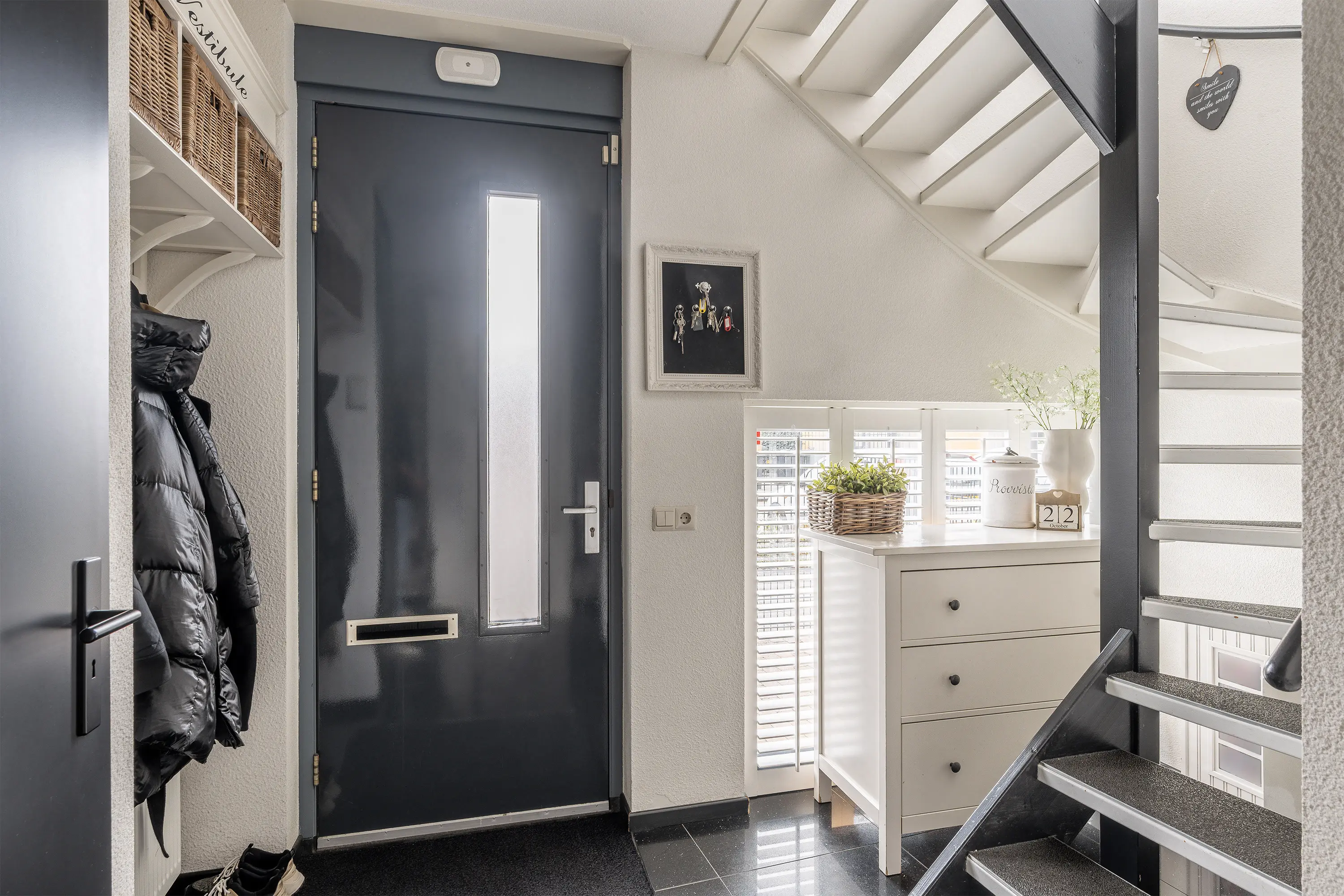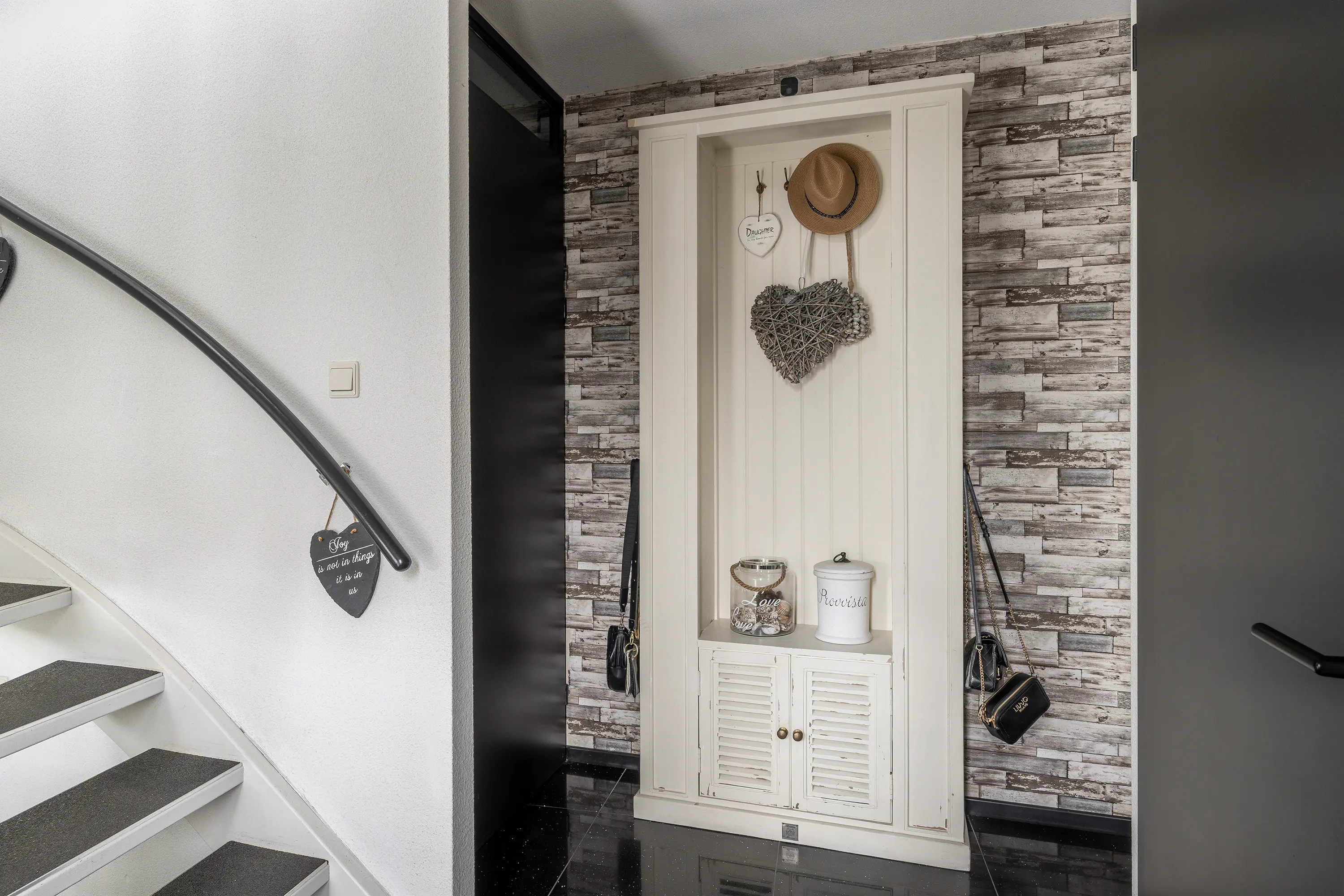 Via de verzorgde bestrate voortuin met sierbeplanting en stenen picknicktafel bereikt u de entree van de woning. De hal beschikt over een meterkast, trapopgang en toiletruimte.