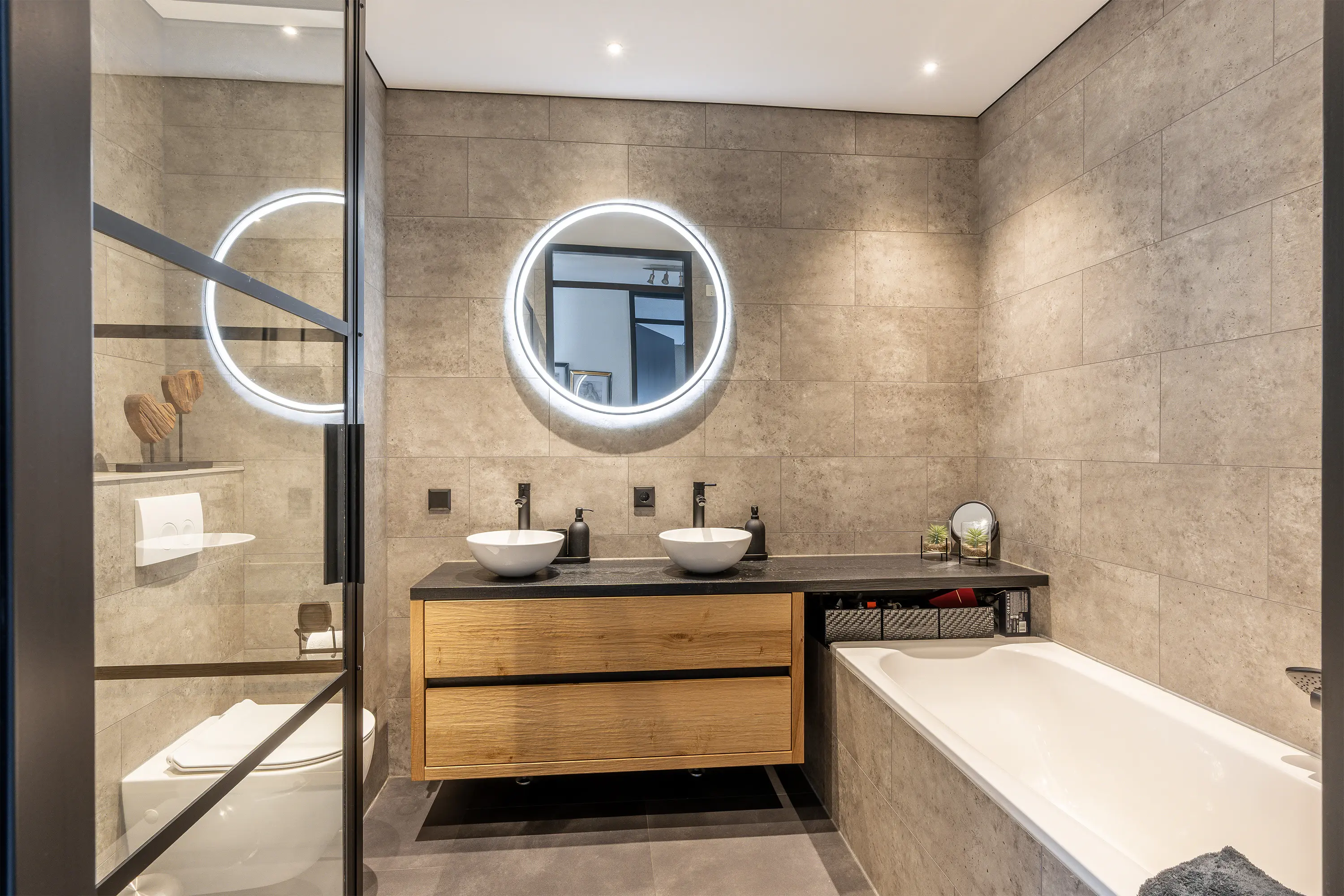 De afwerking is stijlvol en tijdloos, met hoogwaardige materialen en ingebouwde verlichting.