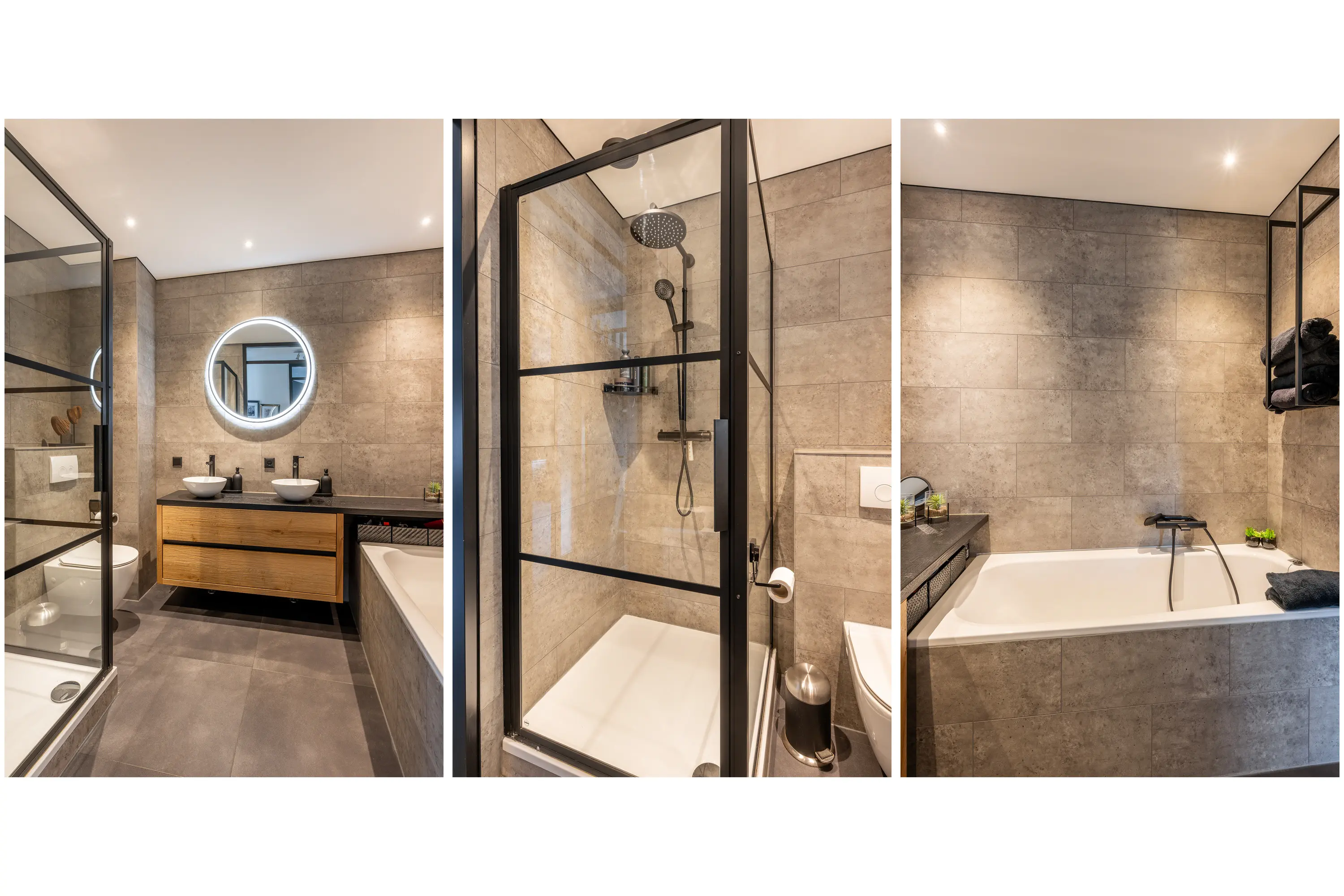De badkamer is in 2020 volledig vernieuwd en straalt een luxe hotelsfeer uit: een ligbad, ruime douche met o.a. een regendouche, dubbele wastafel met spiegelverlichting en een modern toilet.