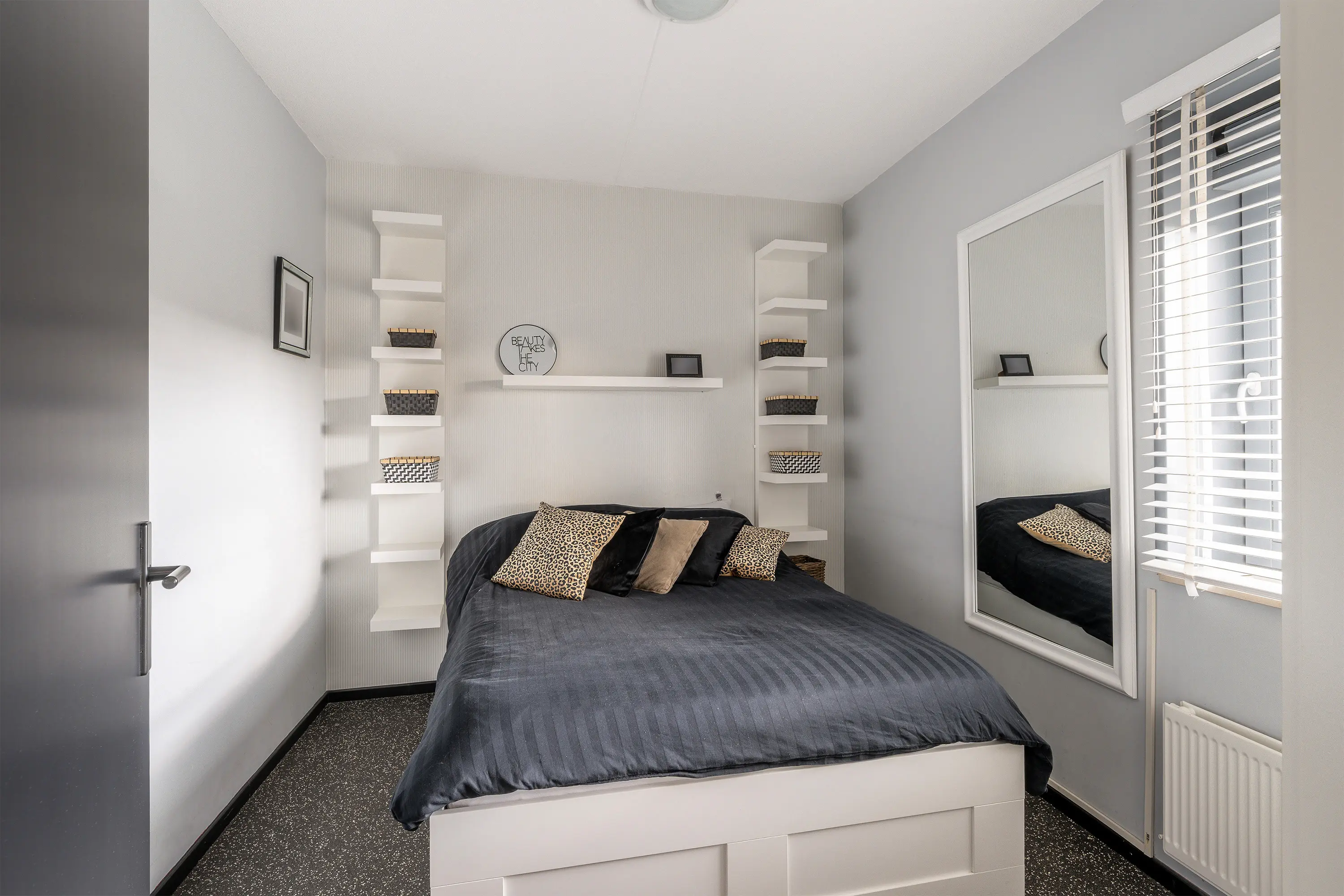 Er is een ruime slaapkamer met inbouwkasten en airconditioning, en een aparte wasruimte met toiletvoorziening en wastafelmeubel. Ook de aansluiting voor wasmachine en droger zijn hier gevestigd.