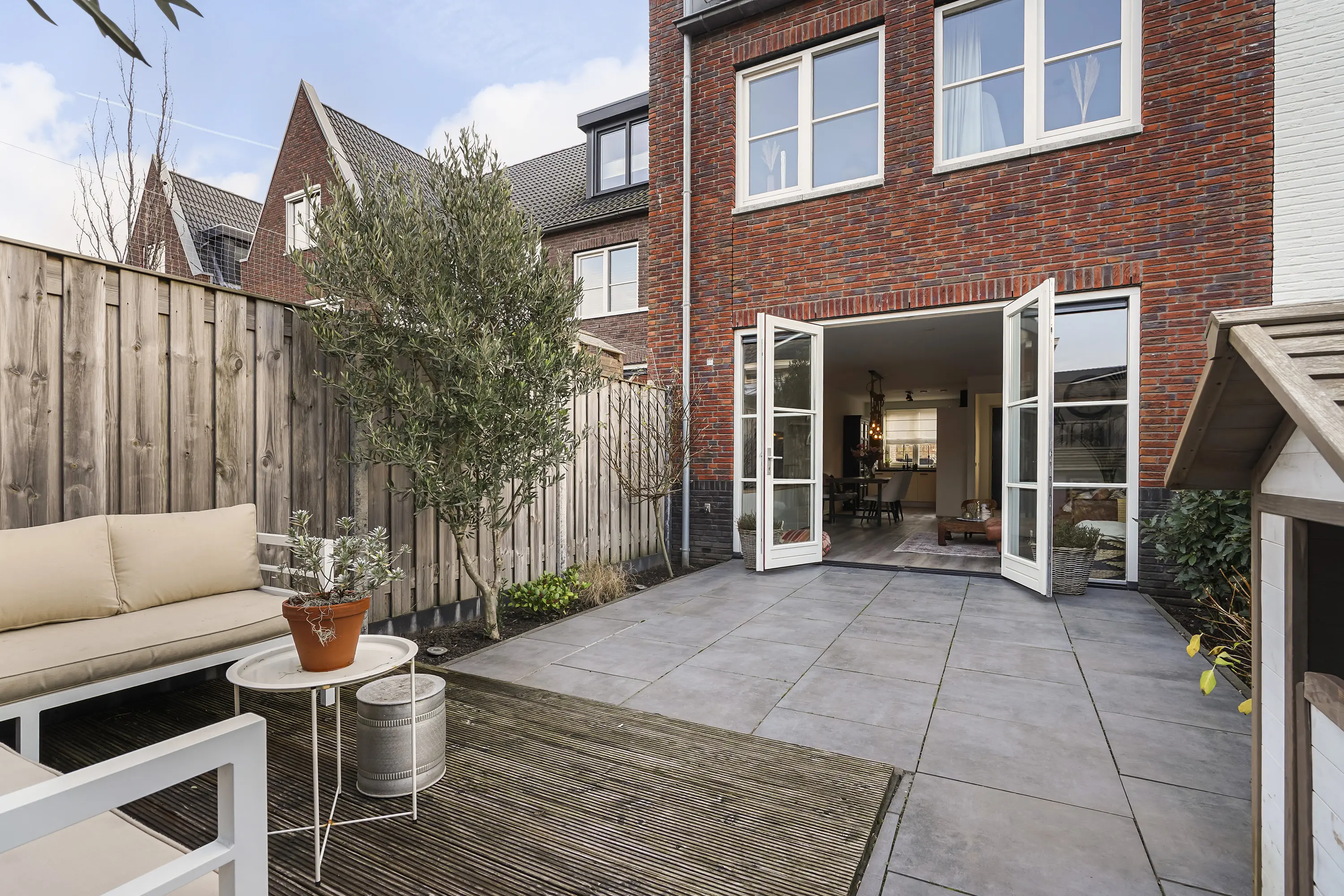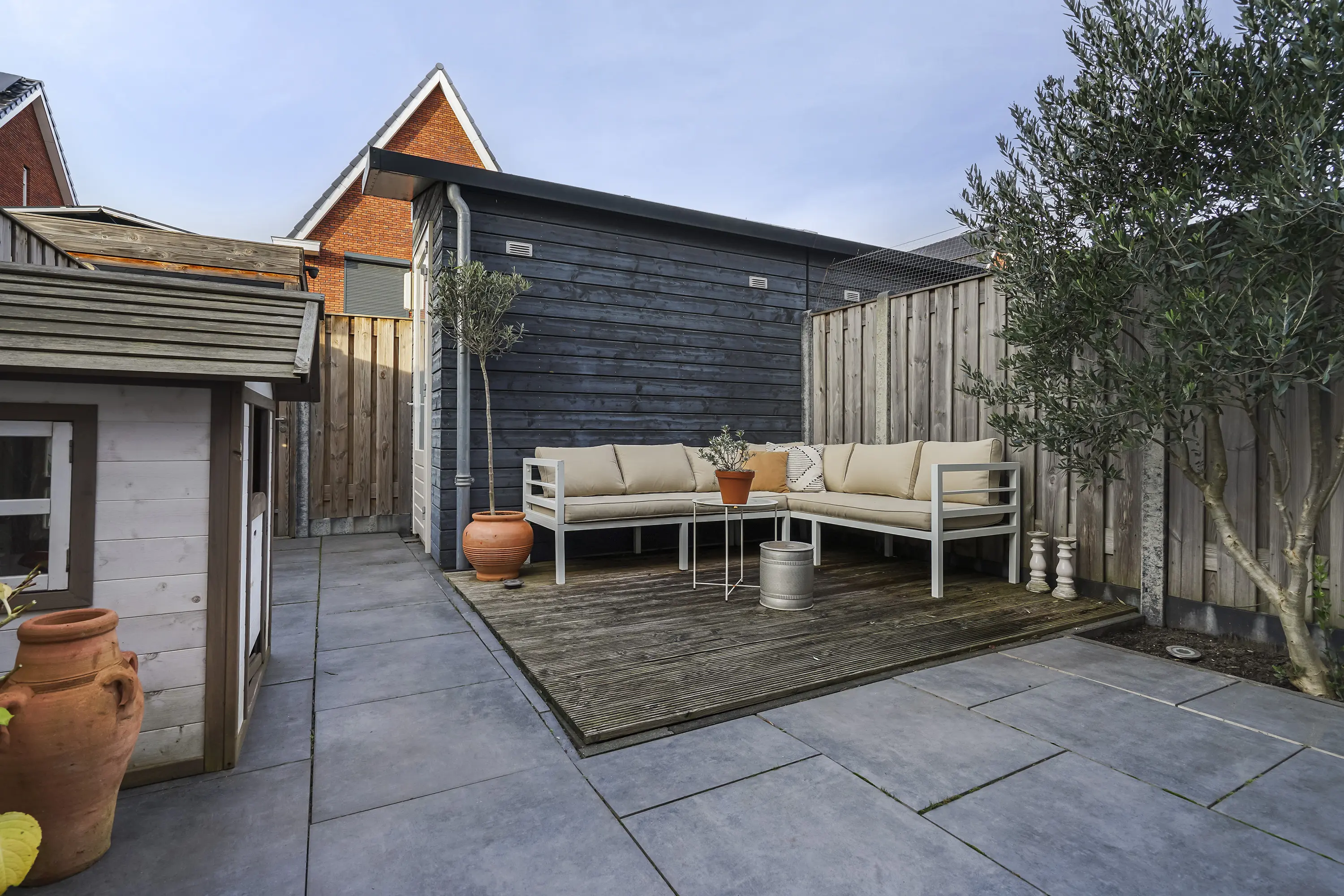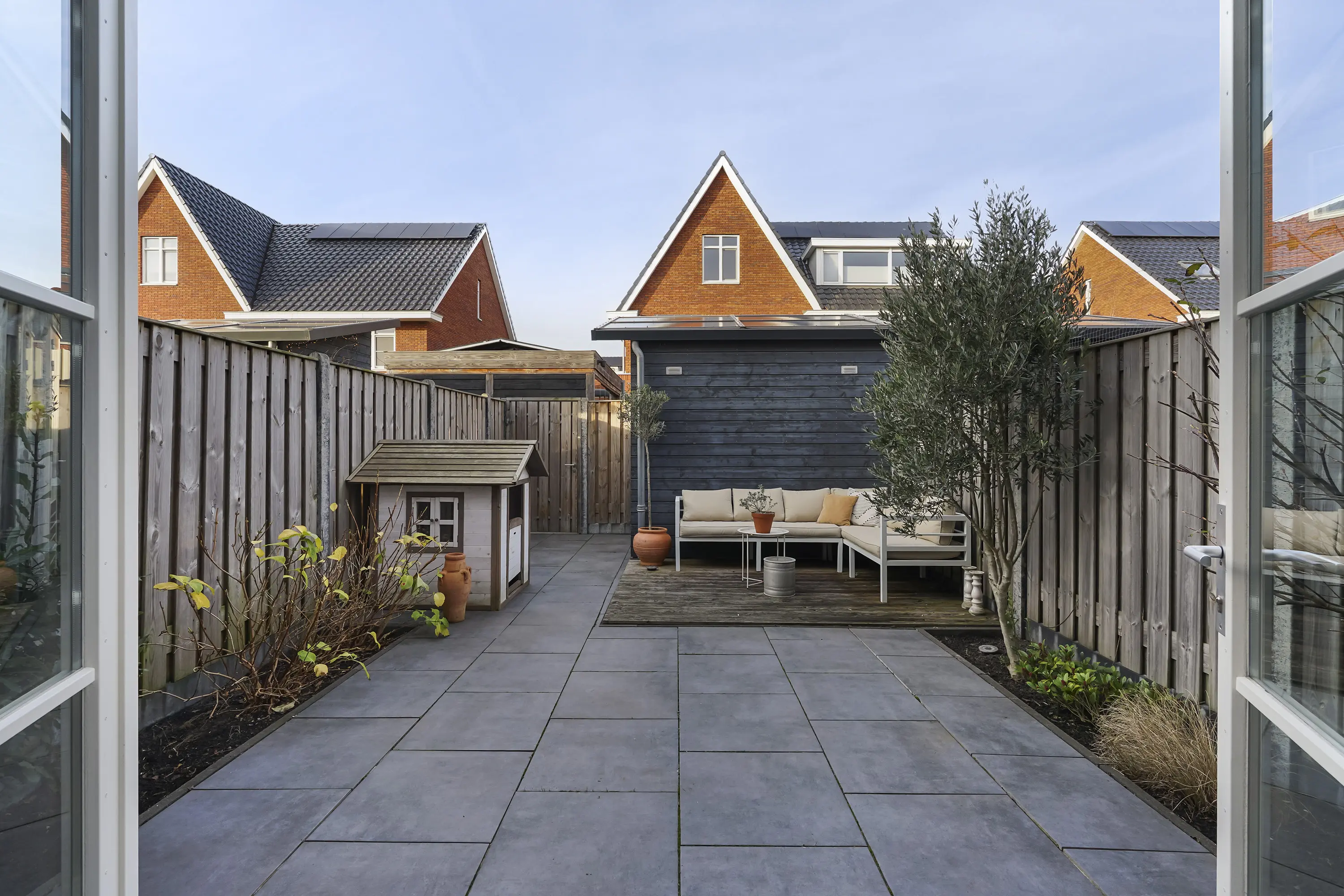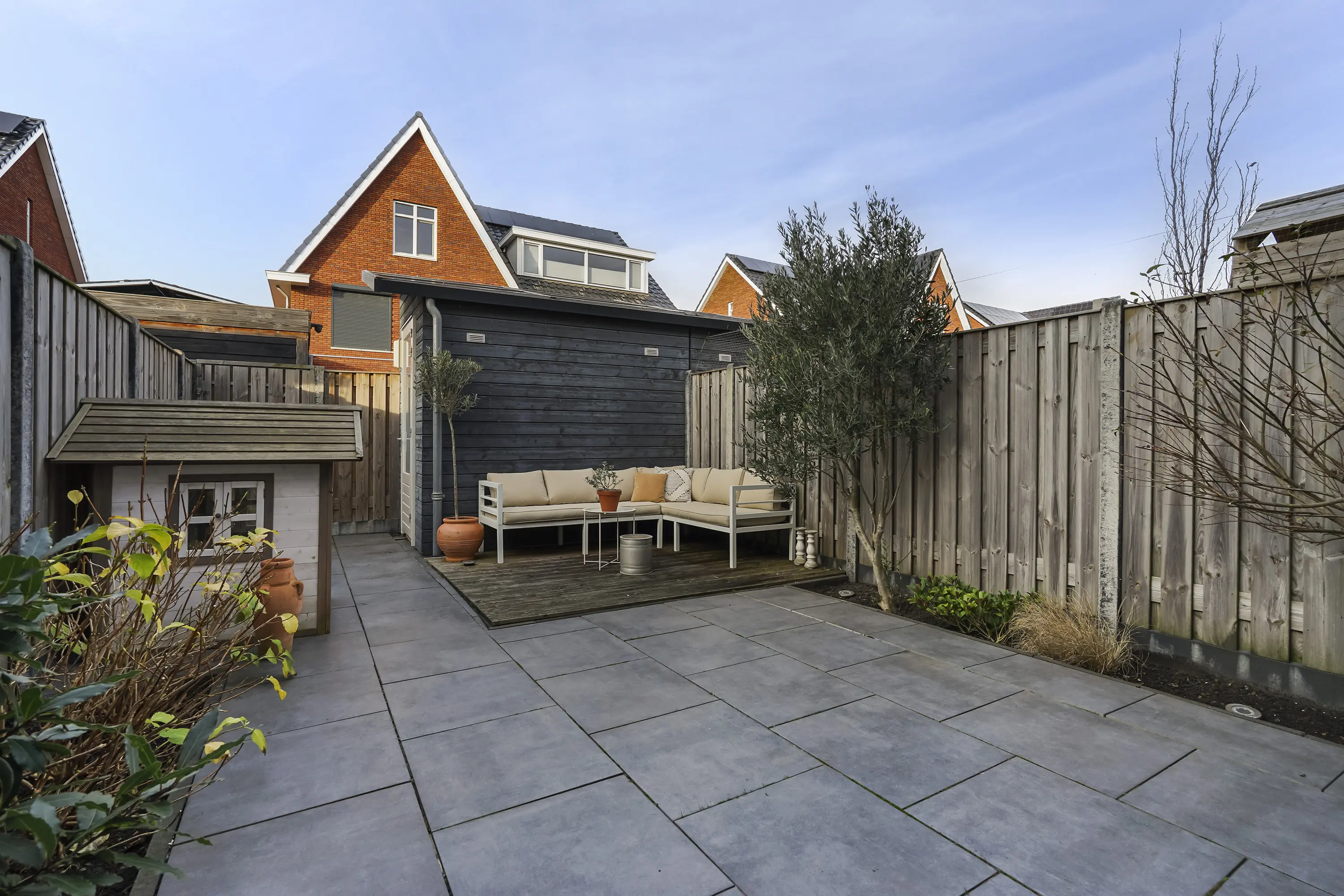 Openslaande deuren bieden toegang tot de fraai aangelegde achtertuin. De achtertuin is voorzien van grotendeels tuintegels, een charmante vlonderstrook en een houten berging. Buitenkraan (achterzijde woning) en tuinverlichting aanwezig. De noordwestligging en de diepte van de tuin van ca. 8,5 meter zorgt voor een prettige balans: geen overdaad aan zon, maar bijna het gehele jaar door zonnige plekjes die met de dag meebewegen. Zo is er vrijwel altijd een plek in de tuin waar de zon schijnt. ’s Middags ontspannen in de zon op de loungebank en ’s avonds dineren voor de openslaande deuren met het avondzonnetje als gezelschap.