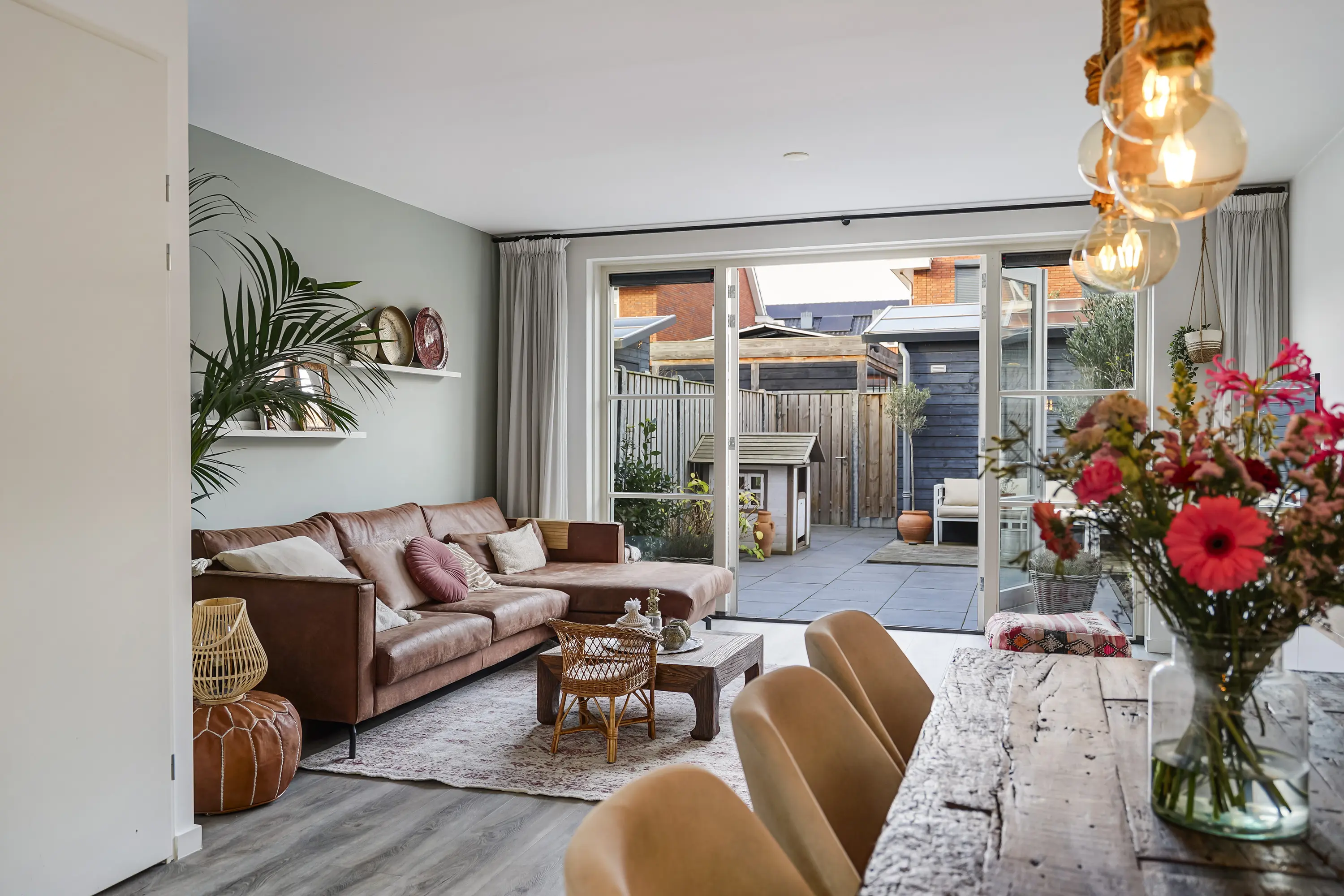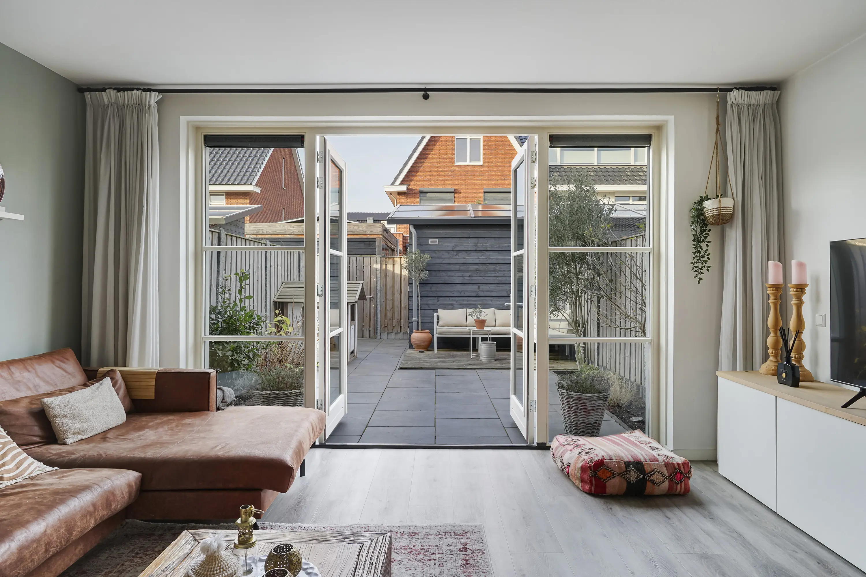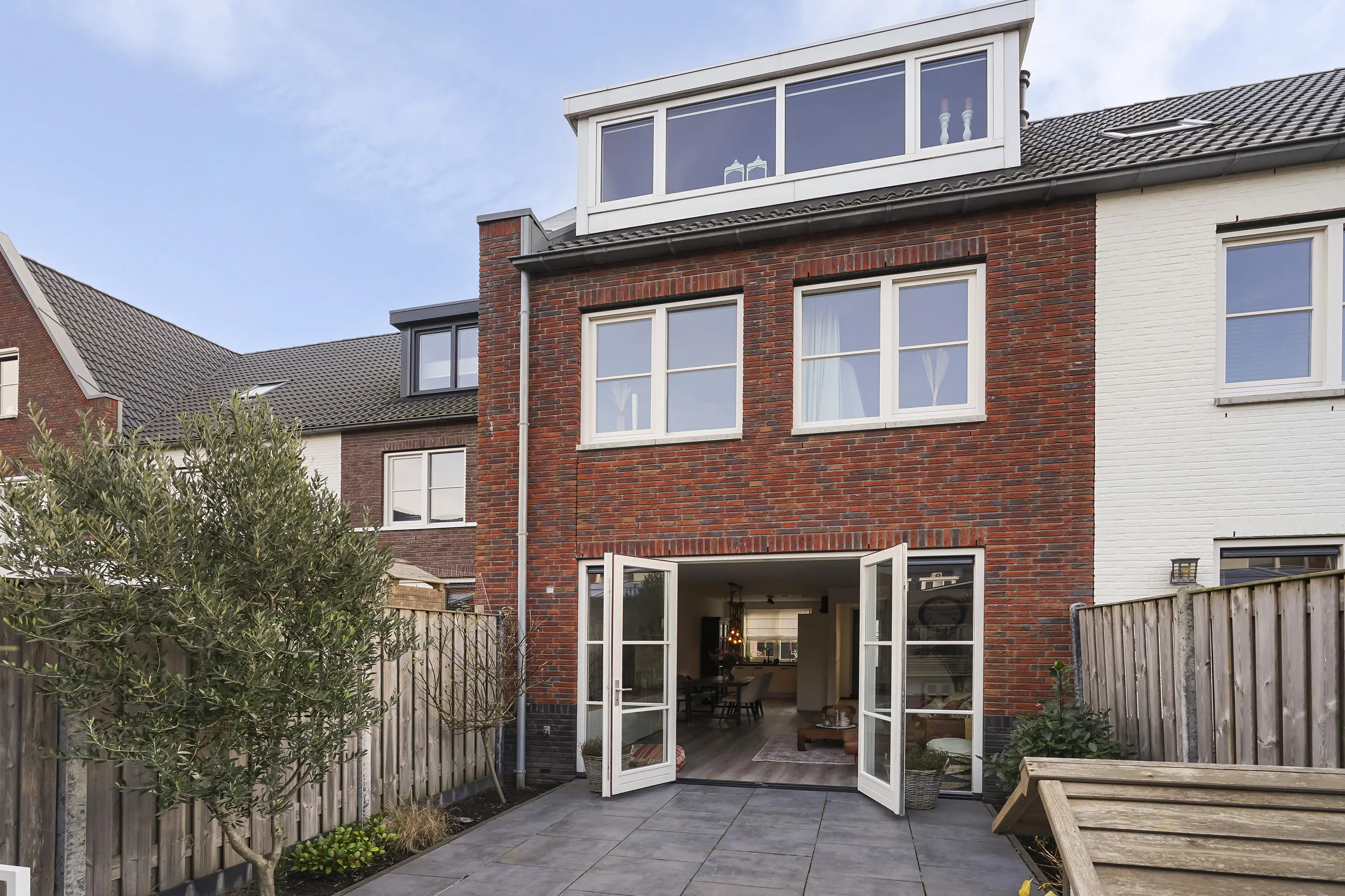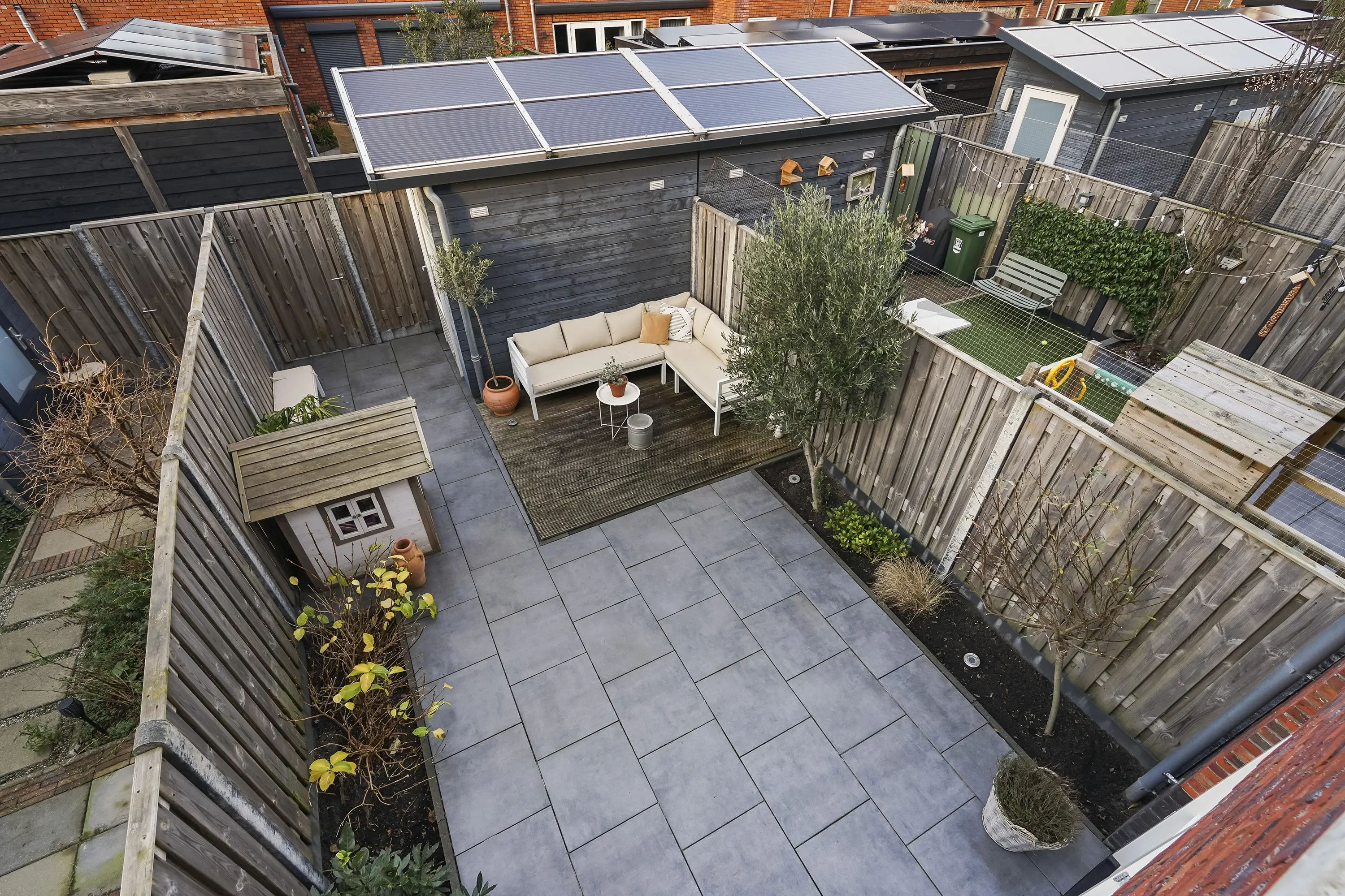 Openslaande deuren bieden toegang tot de fraai aangelegde achtertuin. De achtertuin is voorzien van grotendeels tuintegels, een charmante vlonderstrook en een houten berging. Buitenkraan (achterzijde woning) en tuinverlichting aanwezig. De noordwestligging en de diepte van de tuin van ca. 8,5 meter zorgt voor een prettige balans: geen overdaad aan zon, maar bijna het gehele jaar door zonnige plekjes die met de dag meebewegen. Zo is er vrijwel altijd een plek in de tuin waar de zon schijnt. ’s Middags ontspannen in de zon op de loungebank en ’s avonds dineren voor de openslaande deuren met het avondzonnetje als gezelschap.