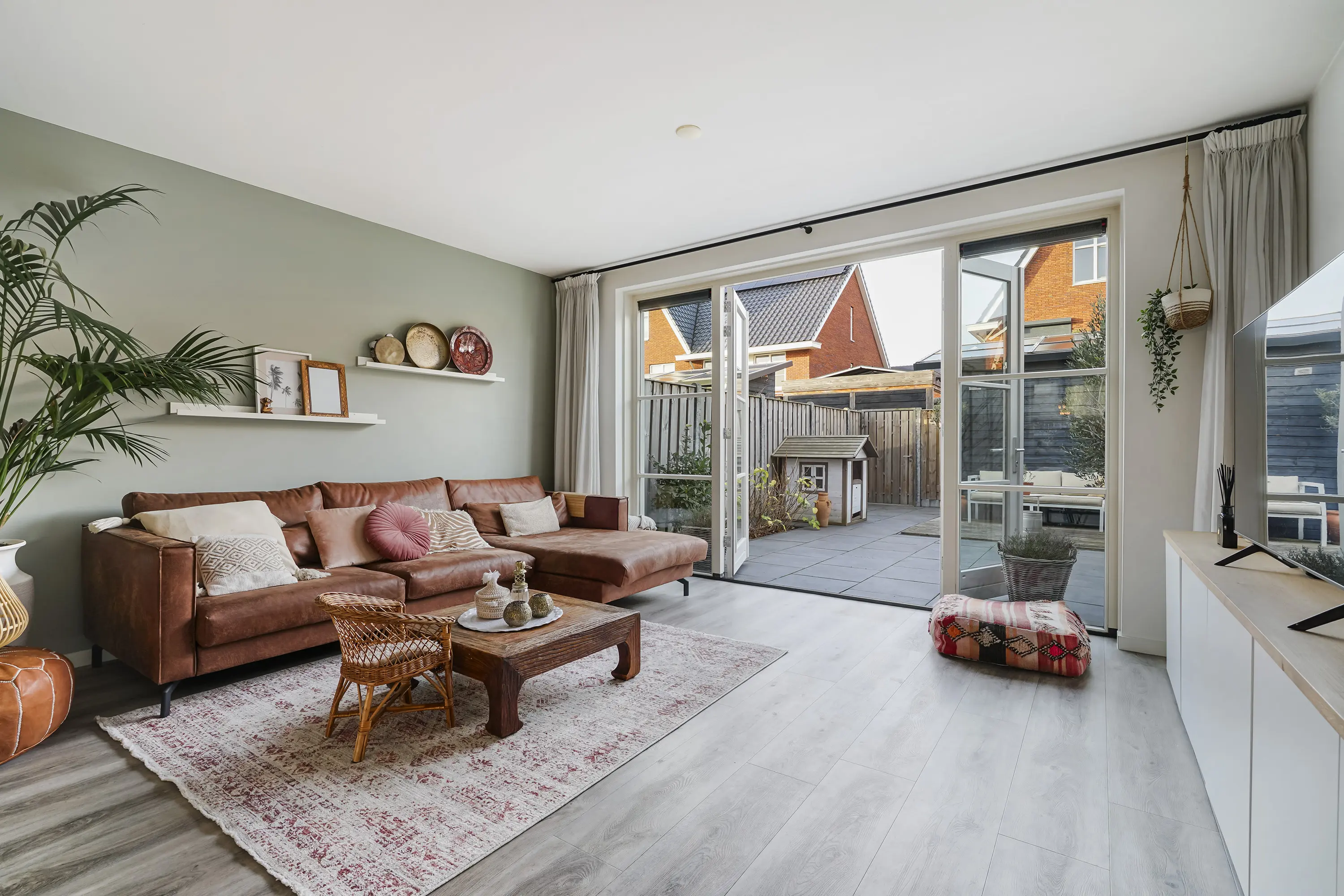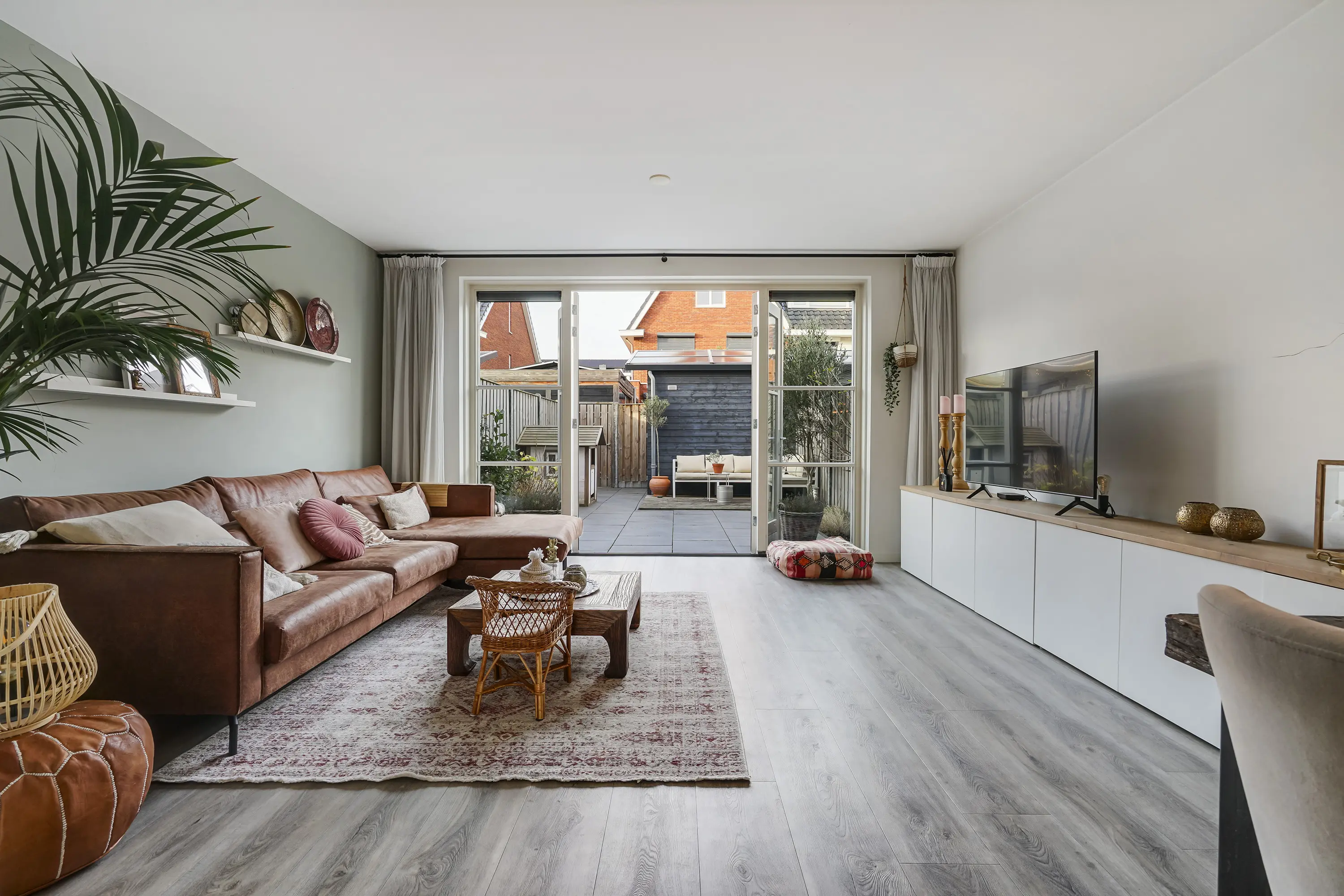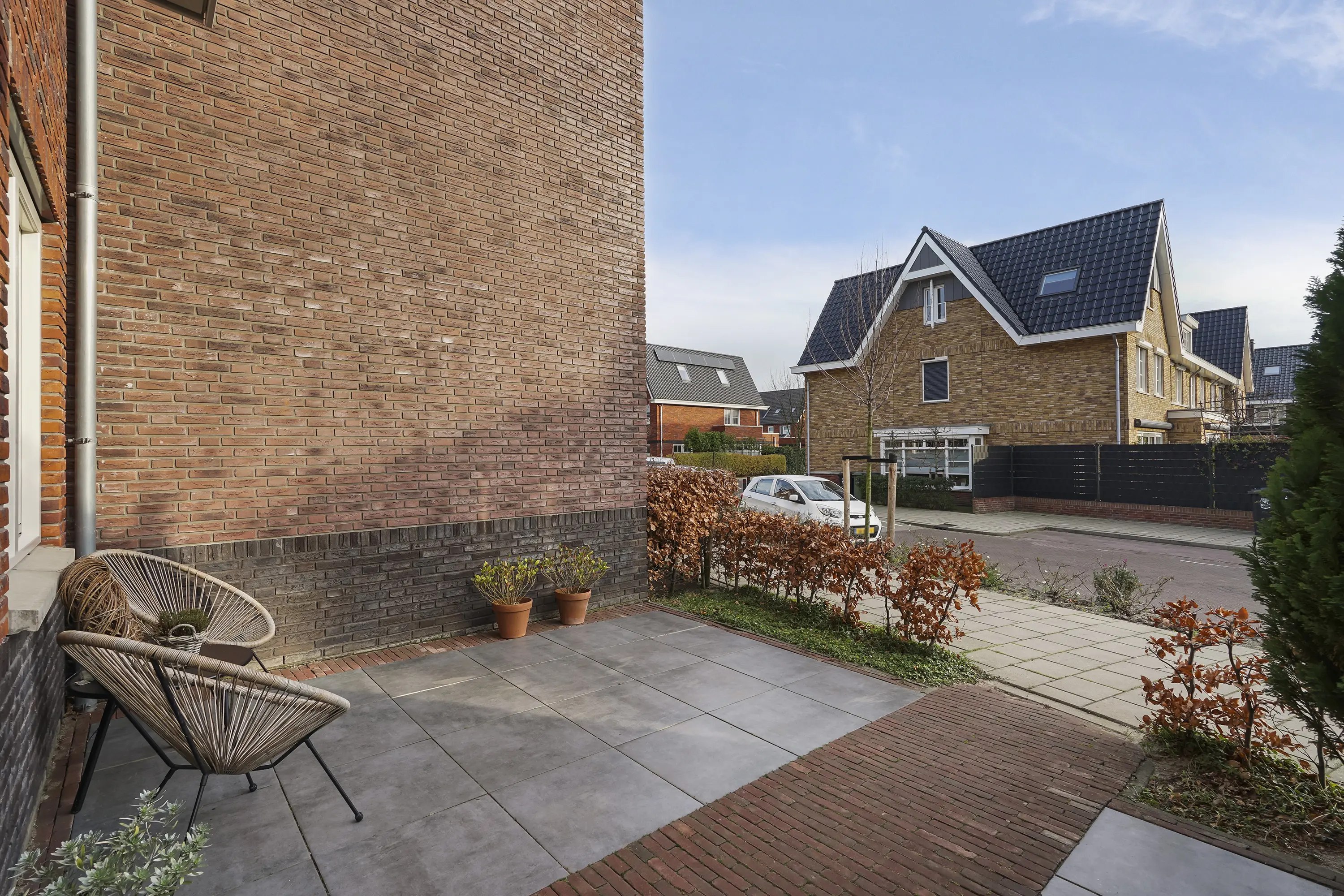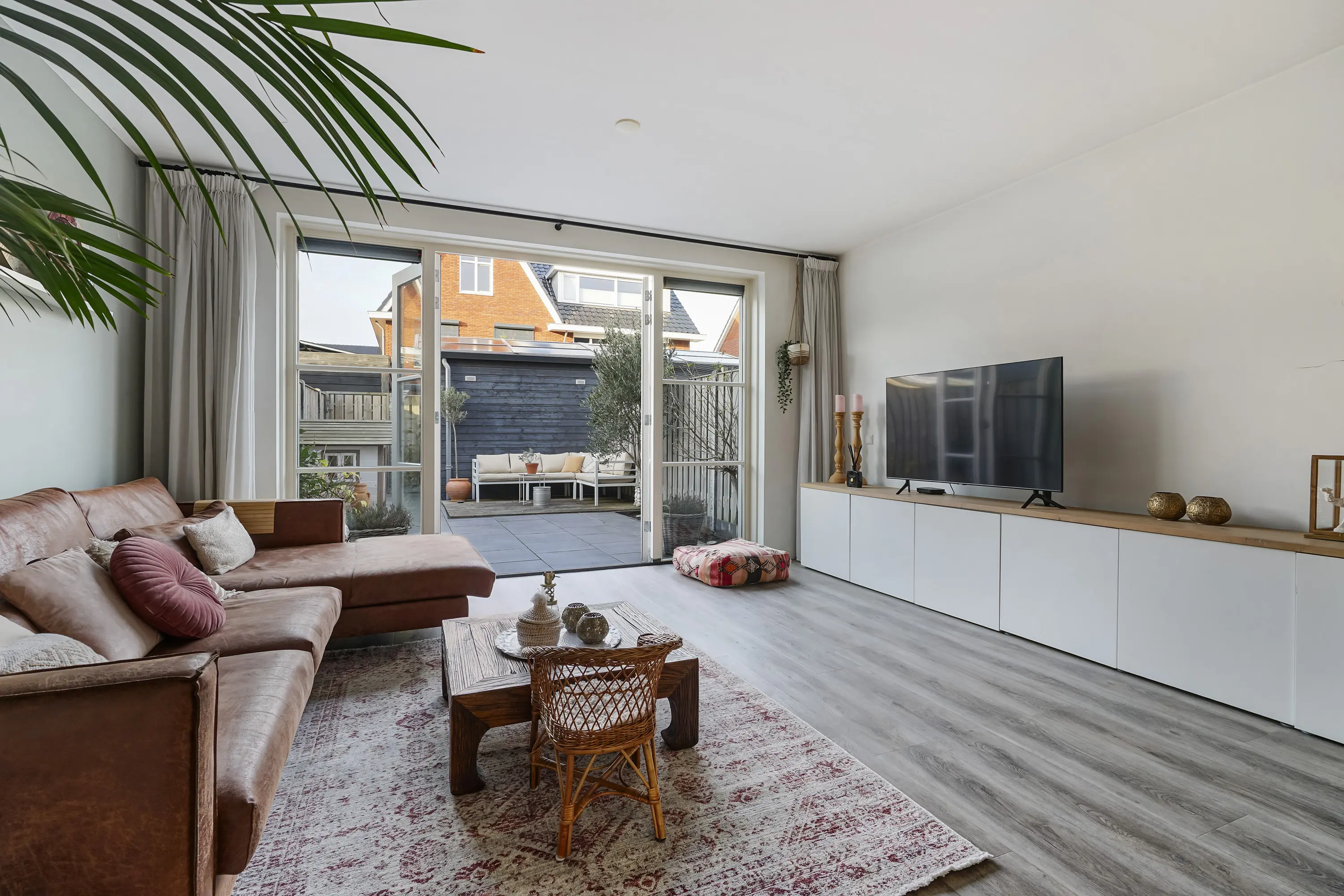 Openslaande deuren bieden toegang tot de fraai aangelegde achtertuin. De achtertuin is voorzien van grotendeels tuintegels, een charmante vlonderstrook en een houten berging. Buitenkraan (achterzijde woning) en tuinverlichting aanwezig. De noordwestligging en de diepte van de tuin van ca. 8,5 meter zorgt voor een prettige balans: geen overdaad aan zon, maar bijna het gehele jaar door zonnige plekjes die met de dag meebewegen. Zo is er vrijwel altijd een plek in de tuin waar de zon schijnt. ’s Middags ontspannen in de zon op de loungebank en ’s avonds dineren voor de openslaande deuren met het avondzonnetje als gezelschap.