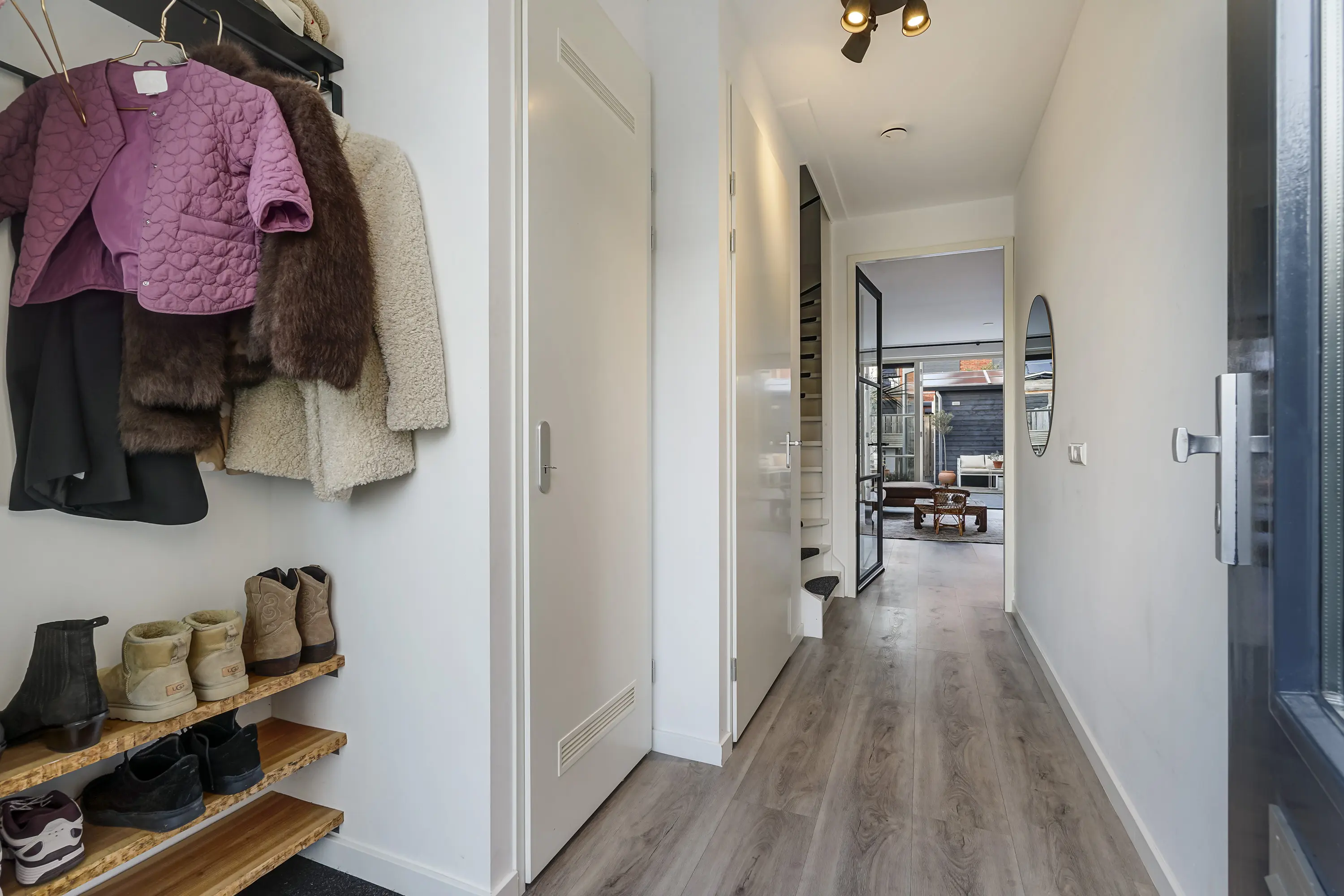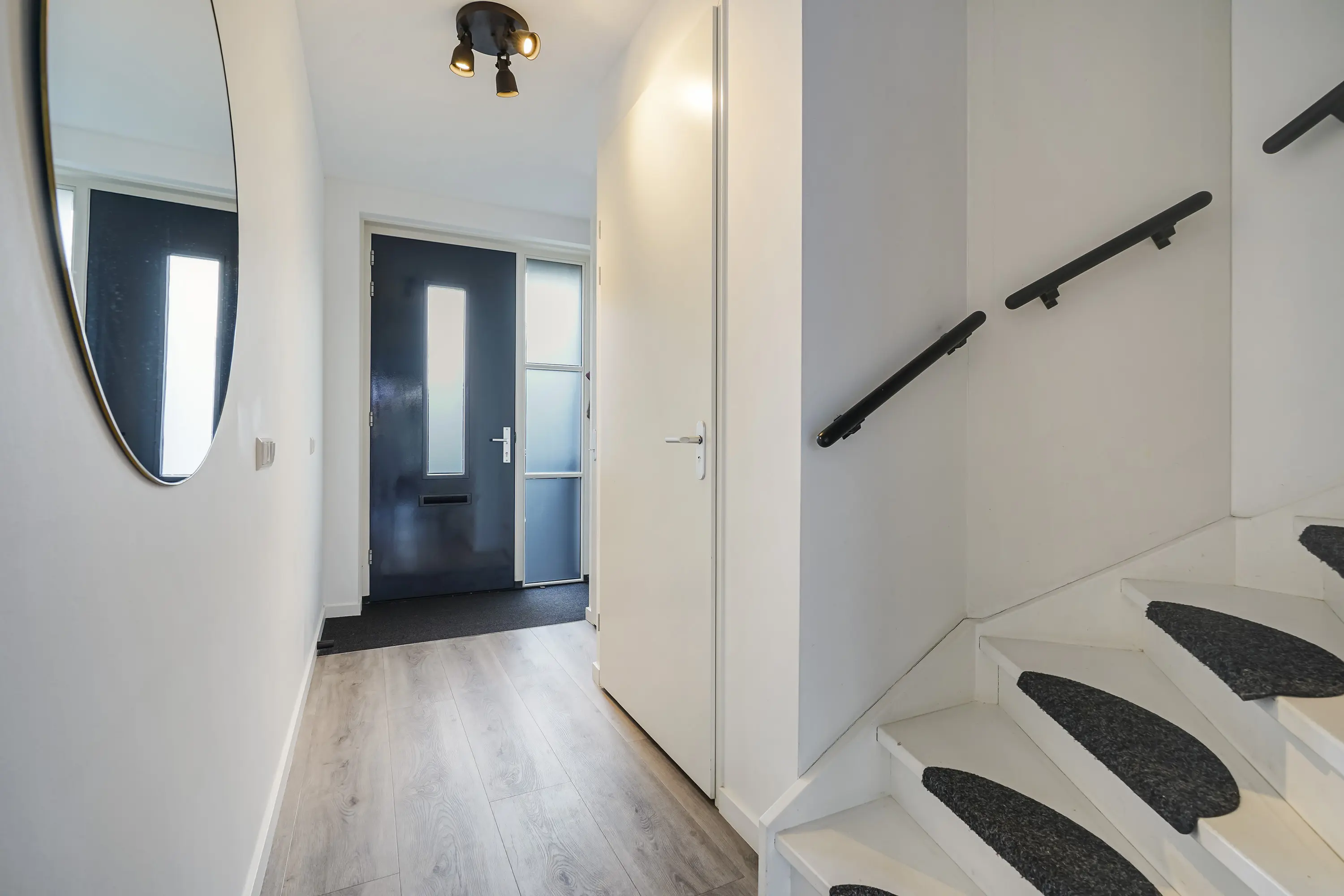 De ruime en verzorgde voortuin geeft direct een uitnodigende indruk en biedt ruimte voor een gezellig zitje. Binnenkomst in ruime hal met een garderobe, de meterkast, een toiletruimte en trapopgang naar de verdiepingen.