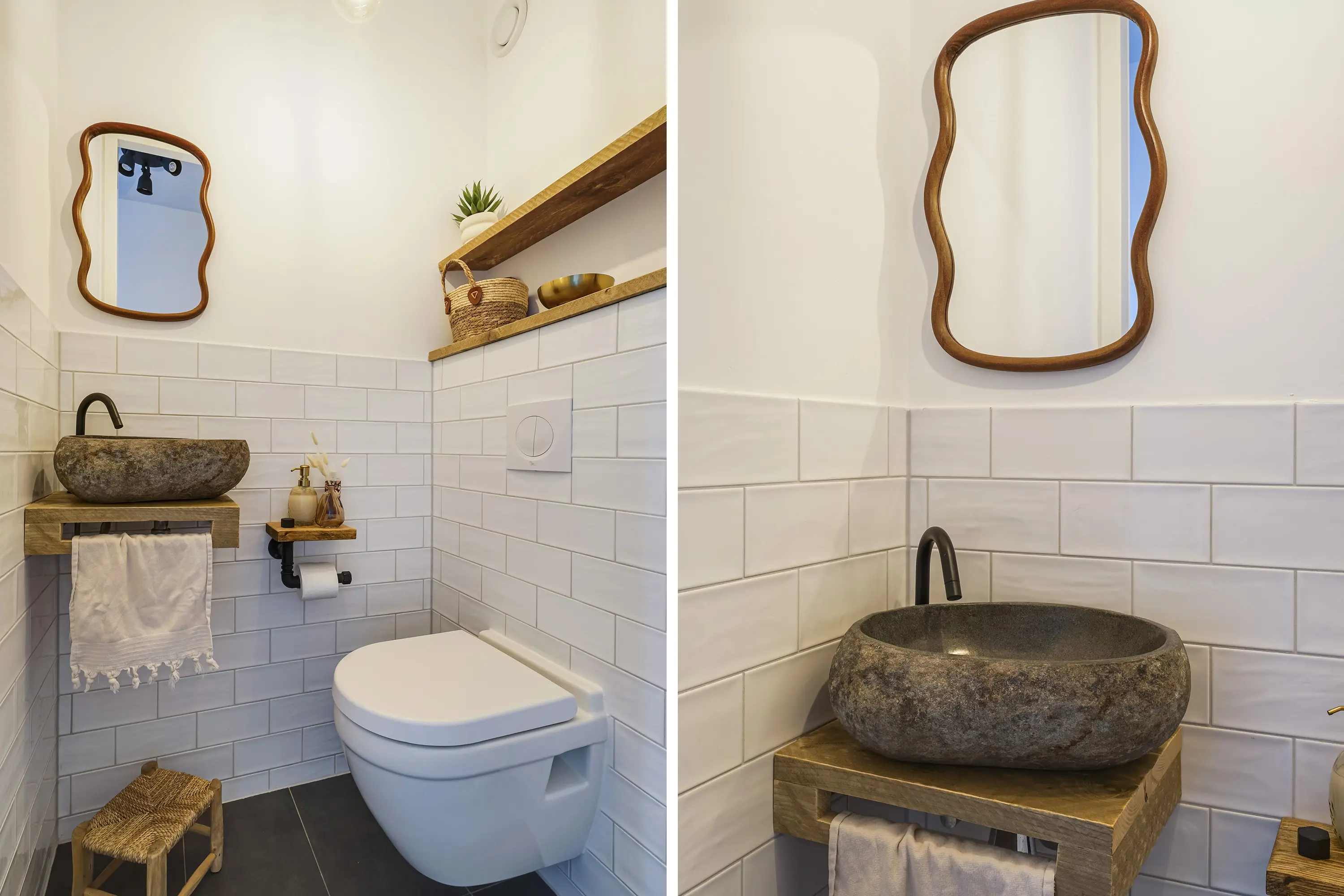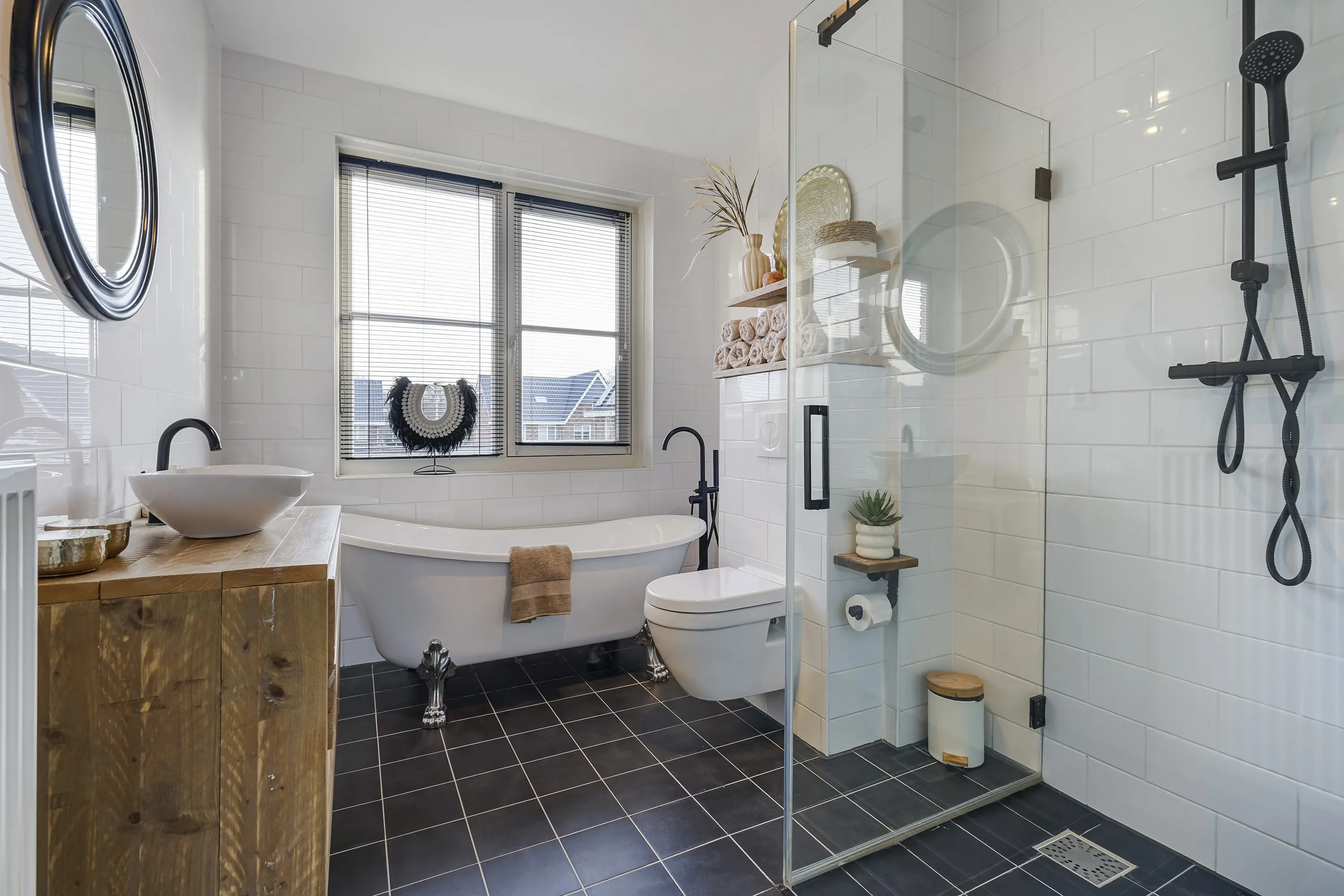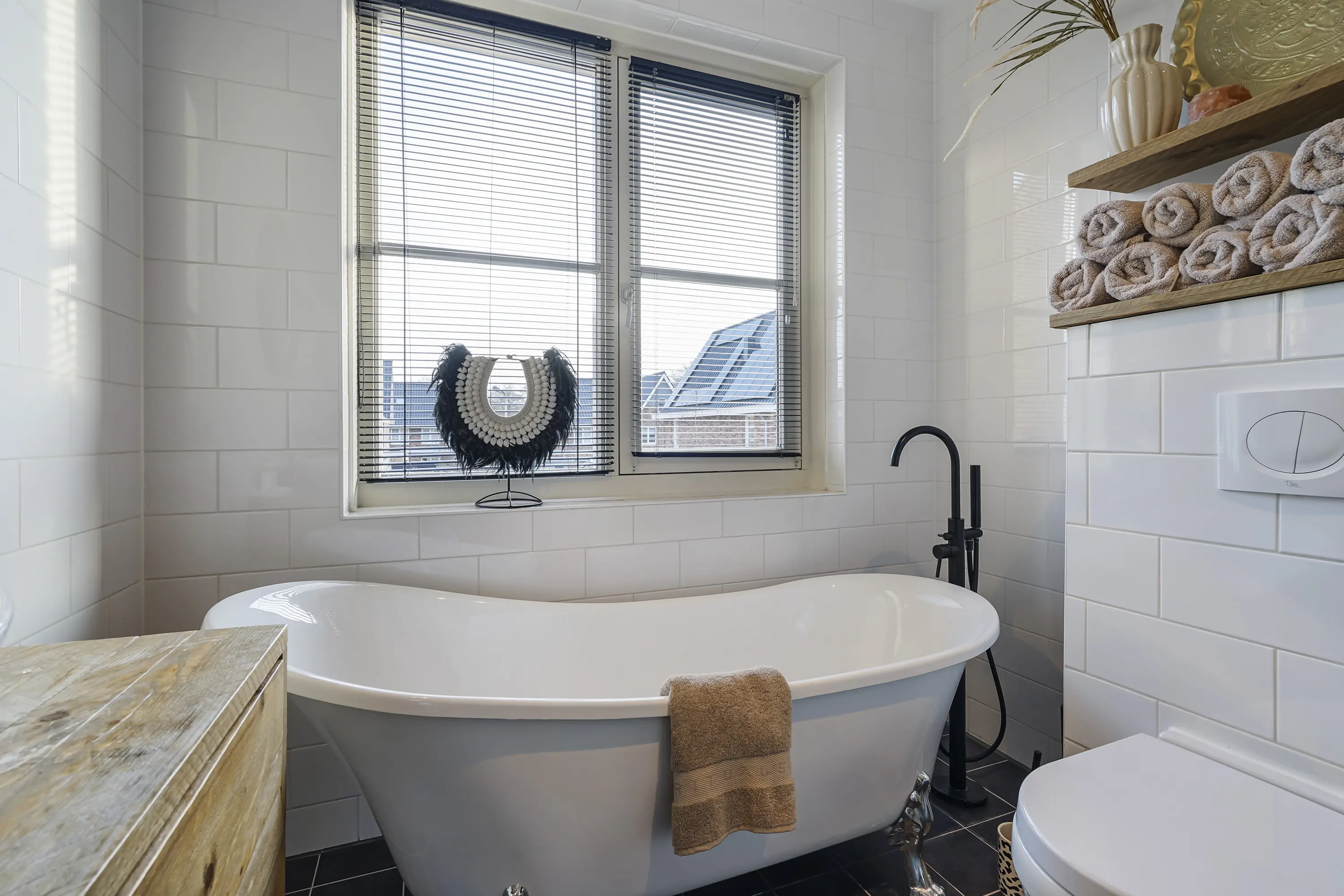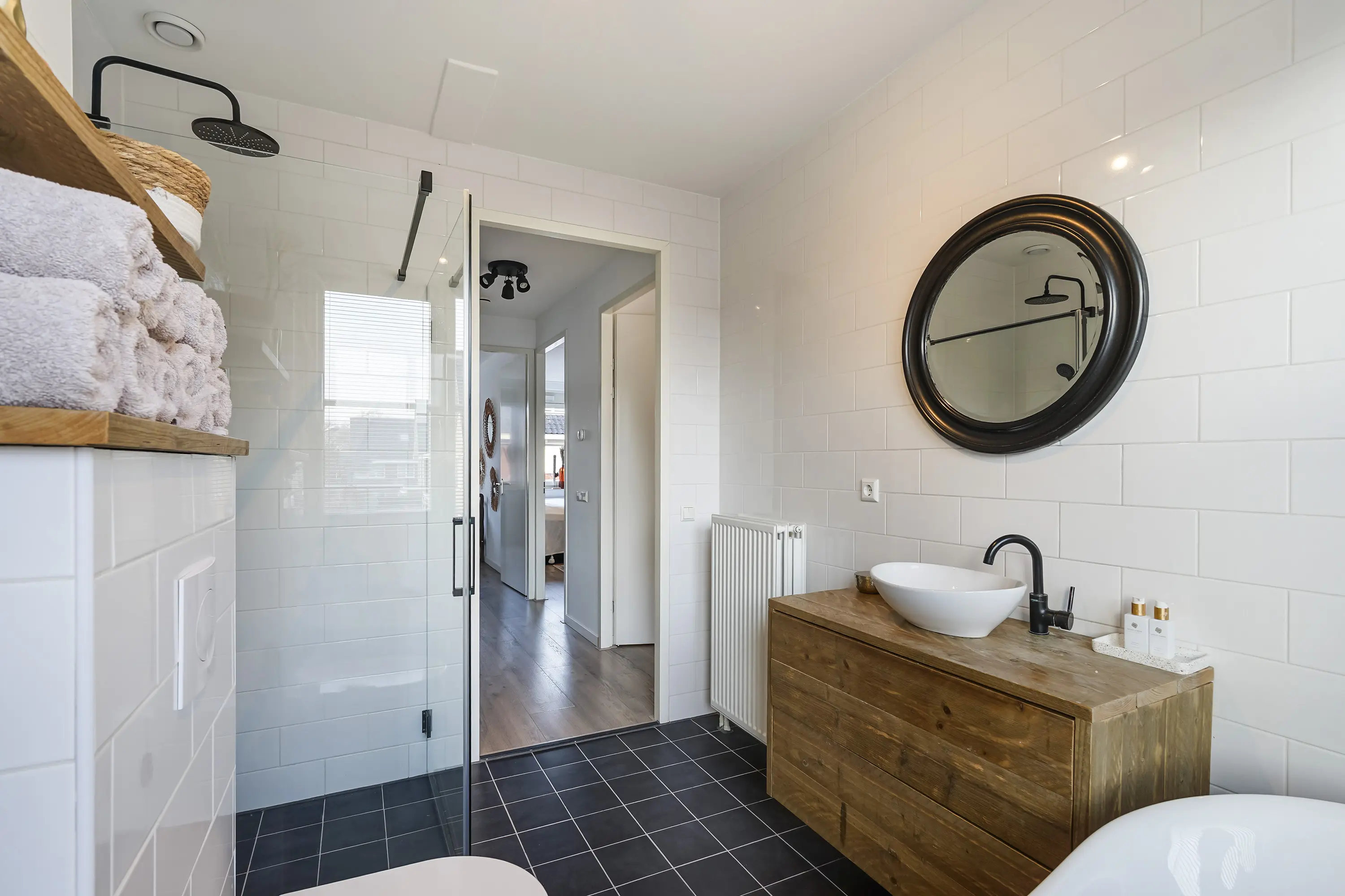 De moderne badkamer, gelegen aan de voorzijde van de woning, is uitgerust met een luxe ligbad, een (regen)douche, een radiator, een wastafelmeubel en een tweede toilet. De aanwezigheid van mechanische ventilatie en een te openen raam zorgen hier voor frisse lucht.