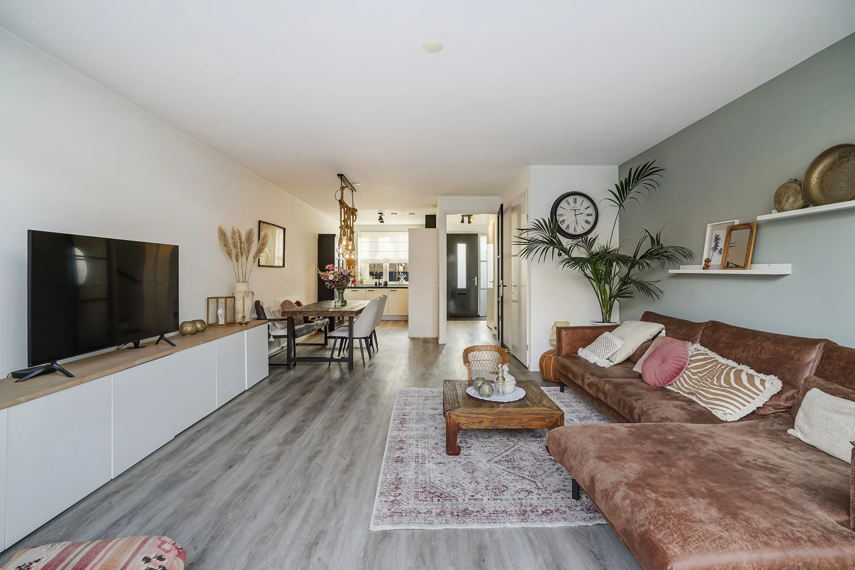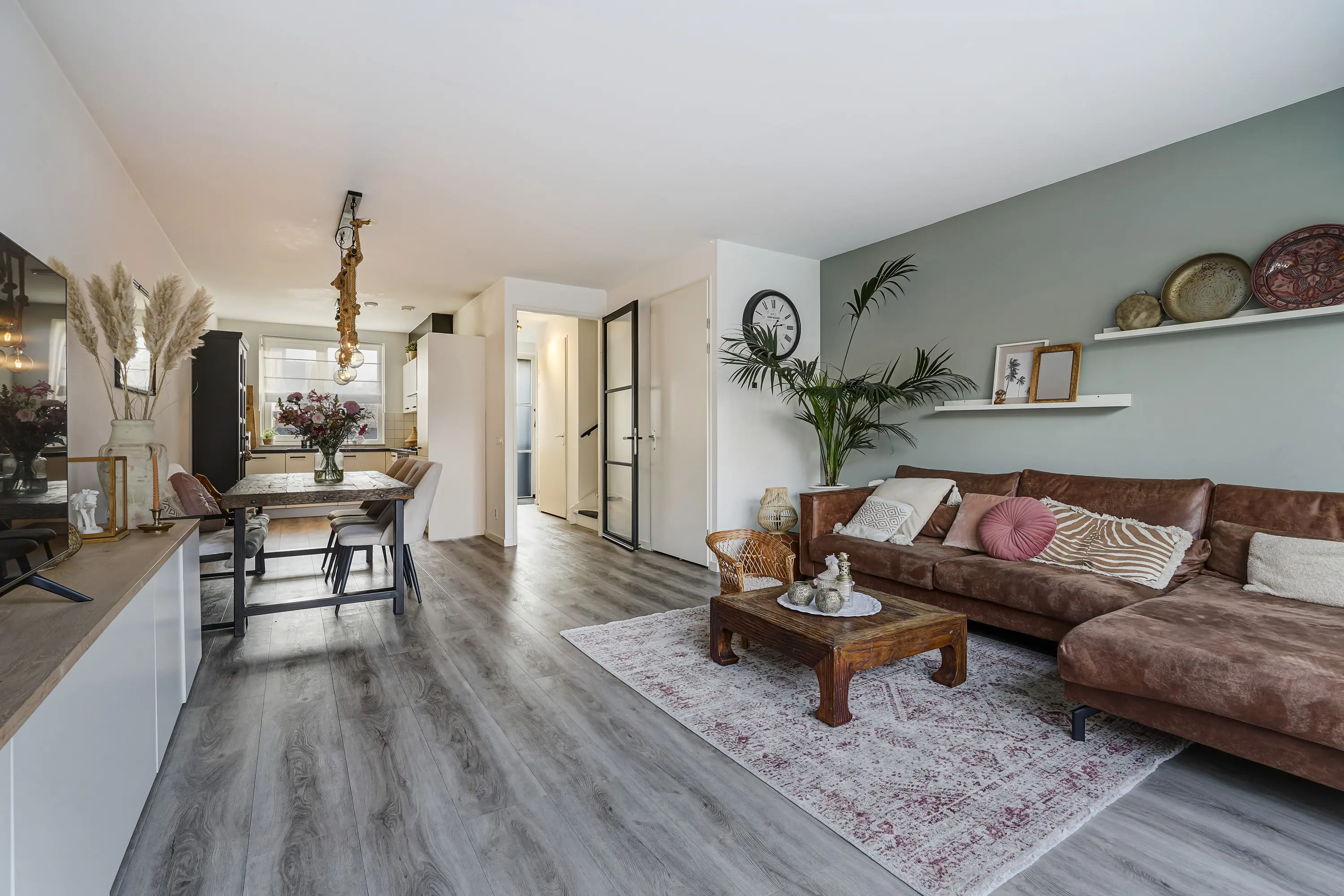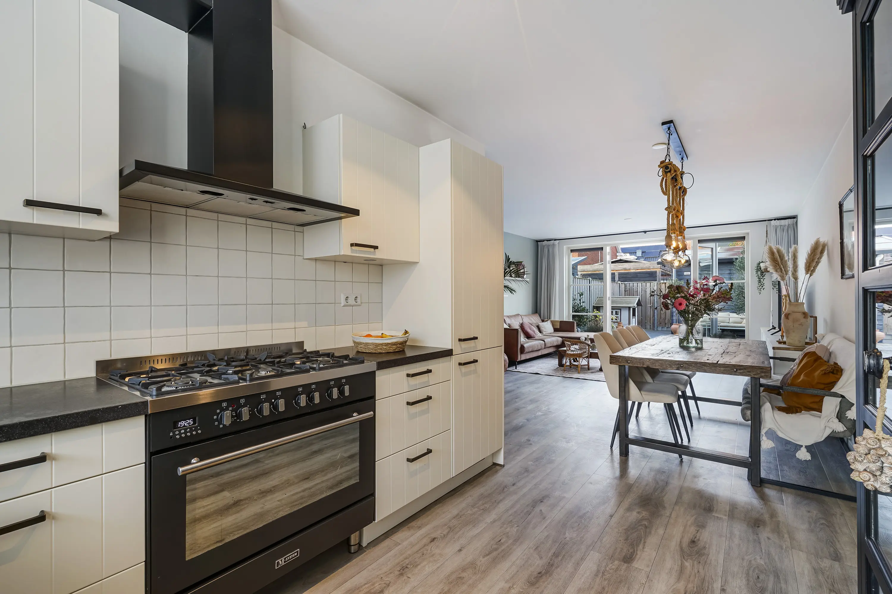 De woonkamer is licht en royaal, voorzien van pvc-vloer met vloerverwarming en grote raampartijen. De woonkamer is slim ingedeeld met een open (leef)keuken aan de voorzijde en een riante zithoek aan de achterzijde. De open keuken is uitgevoerd in een stijlvolle L-opstelling, voorzien van een antraciet composiet werkblad en een scala aan inbouwapparatuur, inclusief een 6-pits oven-gasfornuis met afzuigkap, mengkraan, vaatwasser, vriezer en koelkast.
