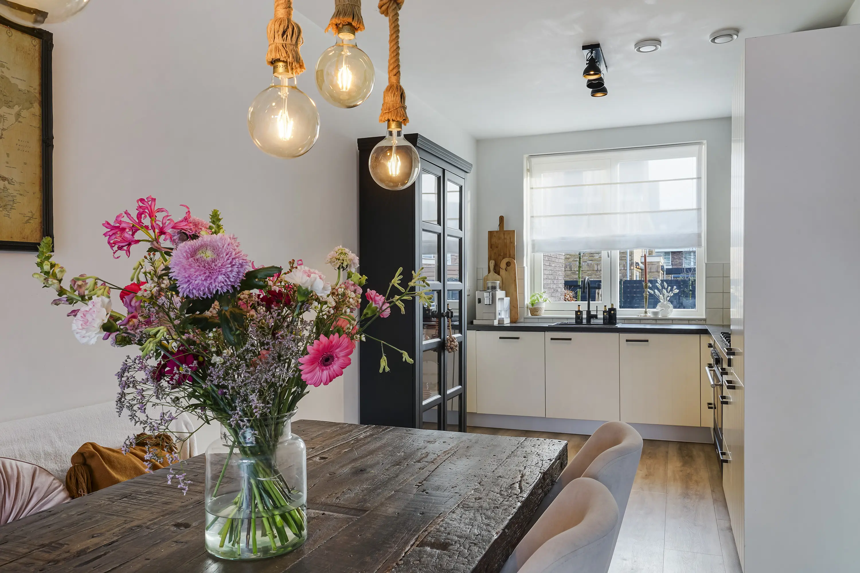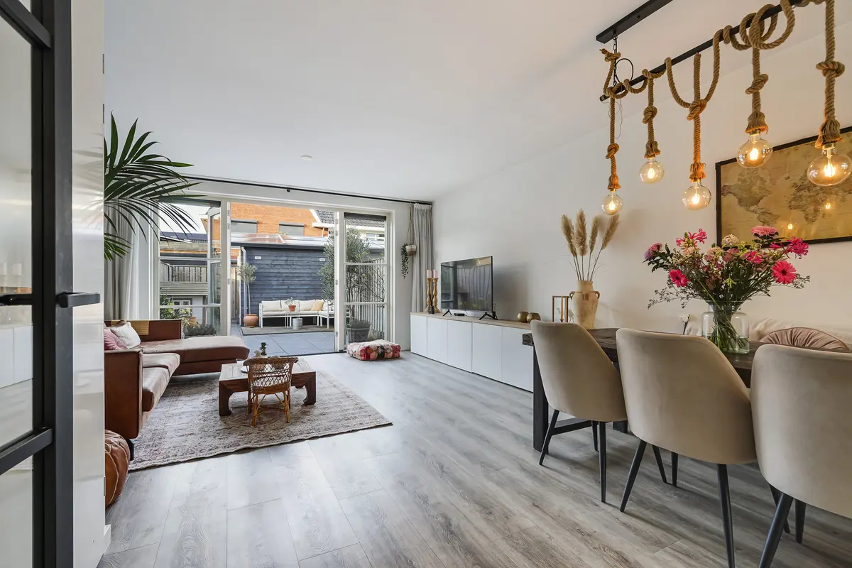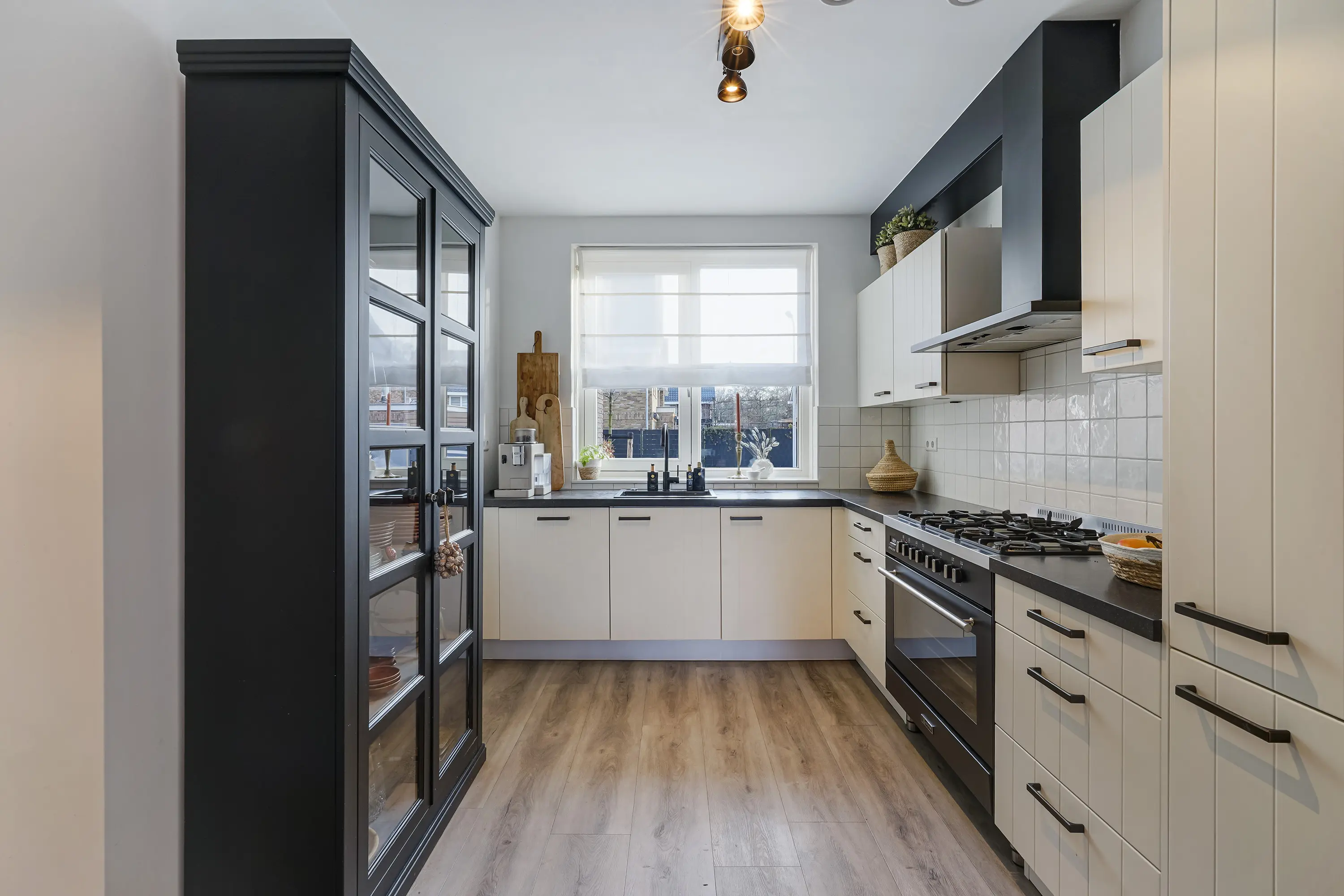De woonkamer is licht en royaal, voorzien van pvc-vloer met vloerverwarming en grote raampartijen. De woonkamer is slim ingedeeld met een open (leef)keuken aan de voorzijde en een riante zithoek aan de achterzijde. De open keuken is uitgevoerd in een stijlvolle L-opstelling, voorzien van een antraciet composiet werkblad en een scala aan inbouwapparatuur, inclusief een 6-pits oven-gasfornuis met afzuigkap, mengkraan, vaatwasser, vriezer en koelkast.