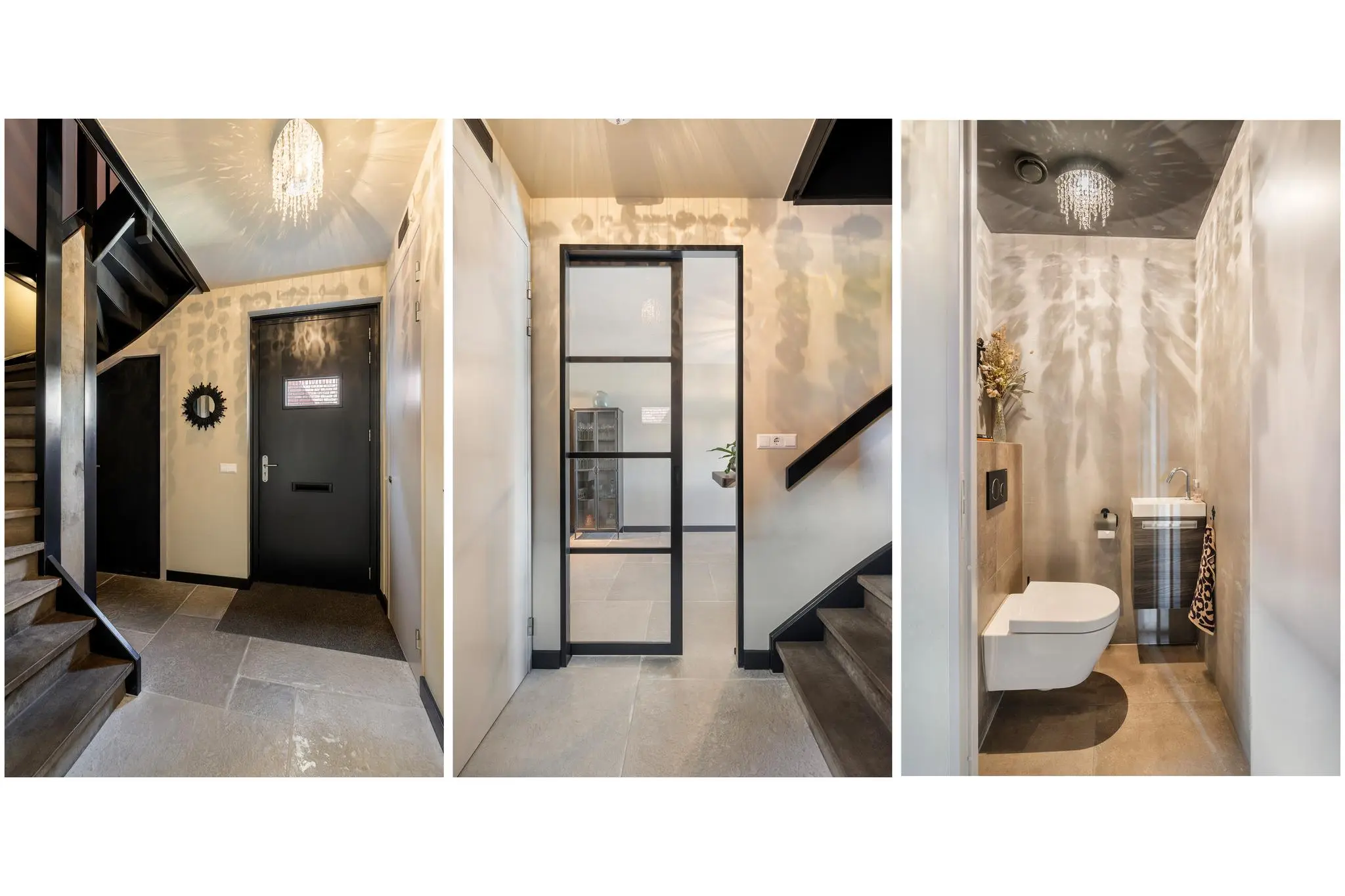 In de hal bevinden zich de meterkast, een modern toilet stijlvol afgewerkt met tadelakt, en een deur naar de berging. De stalen schuifdeur tussen hal en woonkeuken zorgt voor een fraaie verbinding met de rest van het huis.