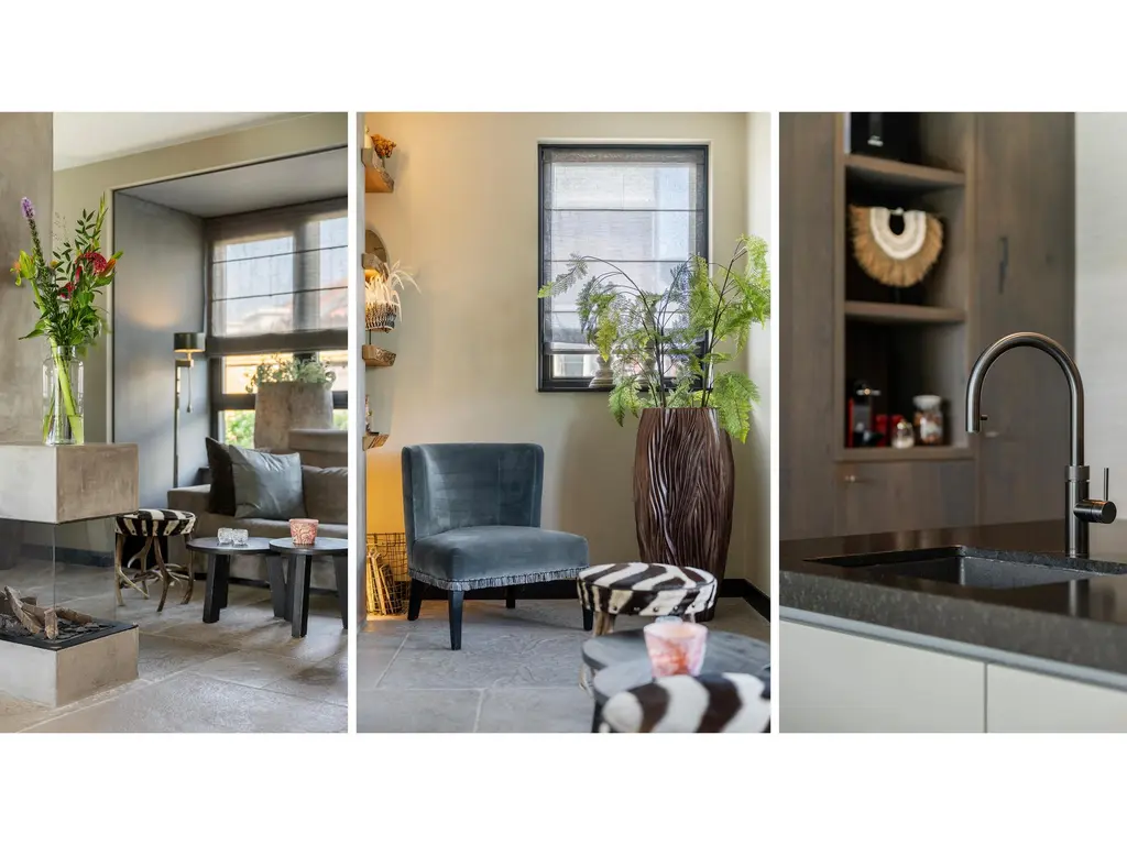 De keuken is het centrale hart van het huis en combineert modern design met natuurlijke elementen. De combinatie van zwart-, wit- en bruintinten geeft de ruimte een stijlvolle uitstraling, versterkt door een natuurstenen werkblad. Een bijzonder element is de robuuste boomstamtafel, uit Bali, die naadloos in het eiland is geïntegreerd – ideaal om aan te schuiven voor een gesprek of diner. De keuken is uitgerust met o.a. een inductiekookplaat met afzuiging naar buiten, Quooker, combi-oven, vaatwasser, twee koelkasten en een vriezer. De wanden zijn voorzien van luxe wandbekleding van Phillip Jeffries.