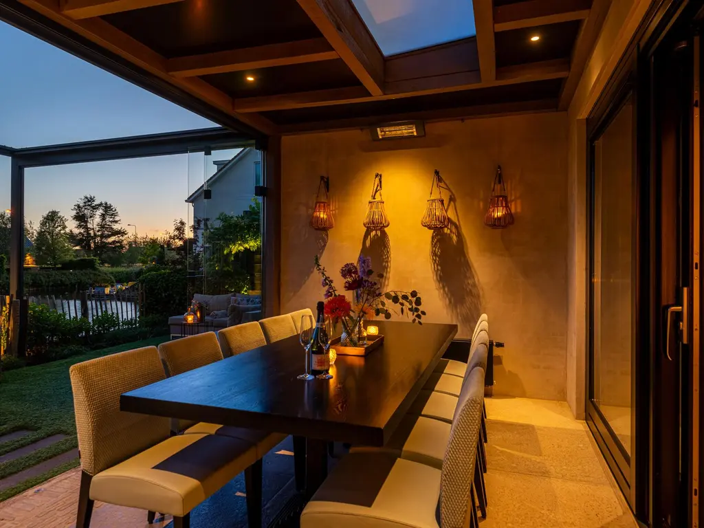 De tuinkamer (2018) vormt een volwaardige tweede leefruimte die het hele jaar door gebruikt kan worden. De glazen harmonicadeur, die in zijn geheel aan beide zijden open kan en tevens als deur/openslaande deuren functioneert, zorgt voor maximale flexibiliteit. De ruimte is voorzien van elektrische vloerverwarming en een lichtkoepel, waardoor u in alle seizoenen kunt genieten van een gezellige borrel of een rustige zit. Dankzij de overvloed aan natuurlijk licht, dat wordt verzorgd door een lichtkoepel, is dit de ideale plek om te genieten van de tuin.