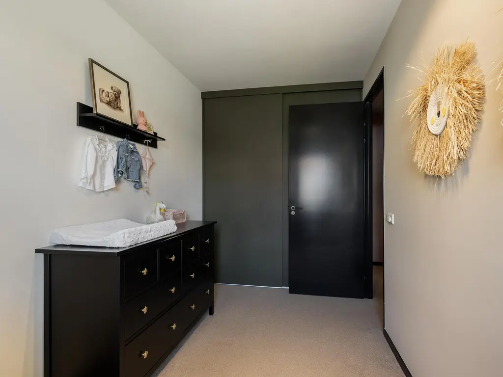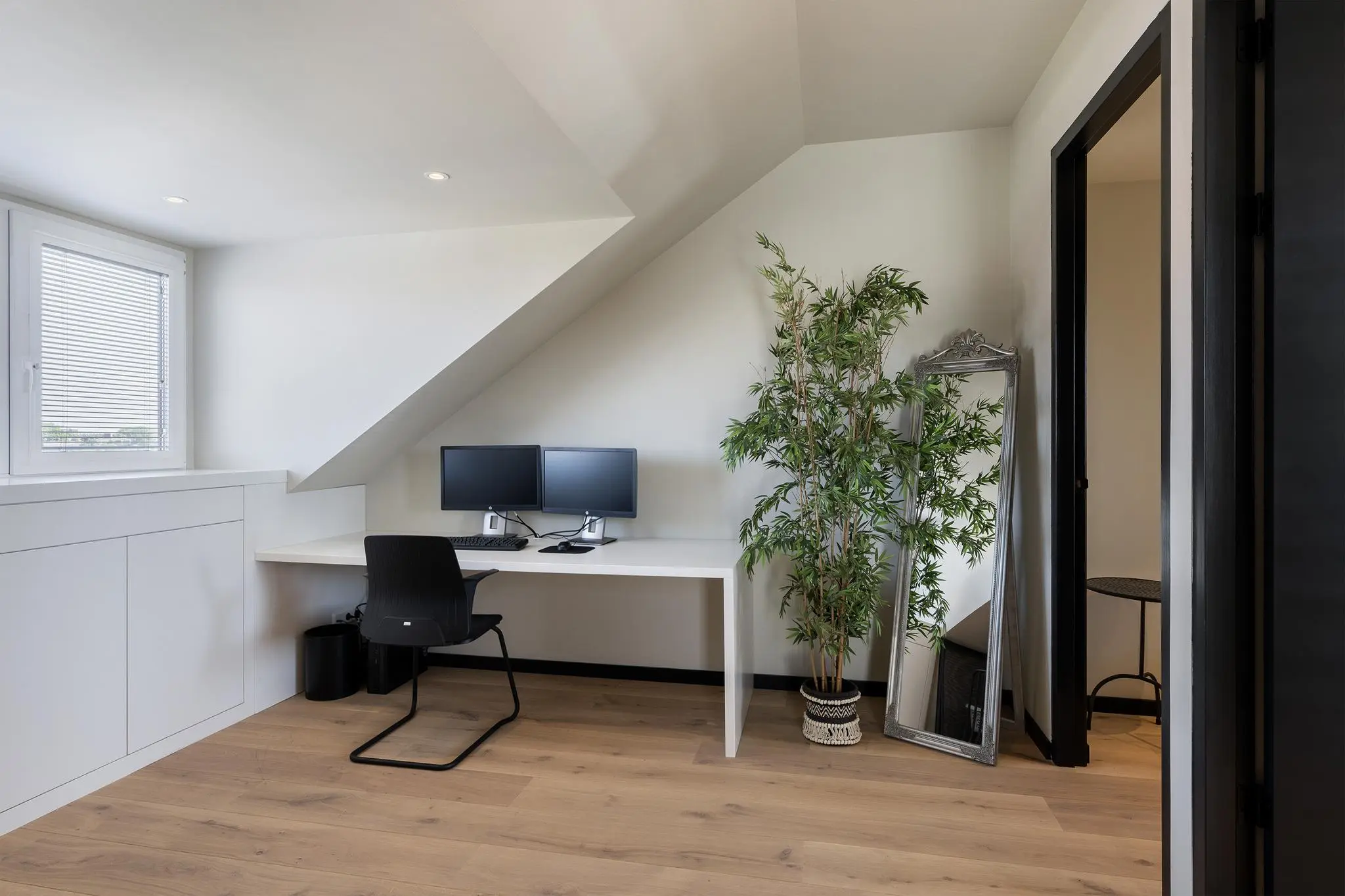 De keurig afgewerkte garage biedt veel meer dan alleen ruimte voor de fietsen. Dankzij de moderne tadelakt wanden, het strakke plafond en de hoogwaardige opbergkasten is dit een perfecte plek voor hobbyisten, klussers of simpelweg als extra bergruimte. Met een directe doorgang naar de tuin en veel natuurlijk licht door de glazen deur, is dit een veelzijdige ruimte.