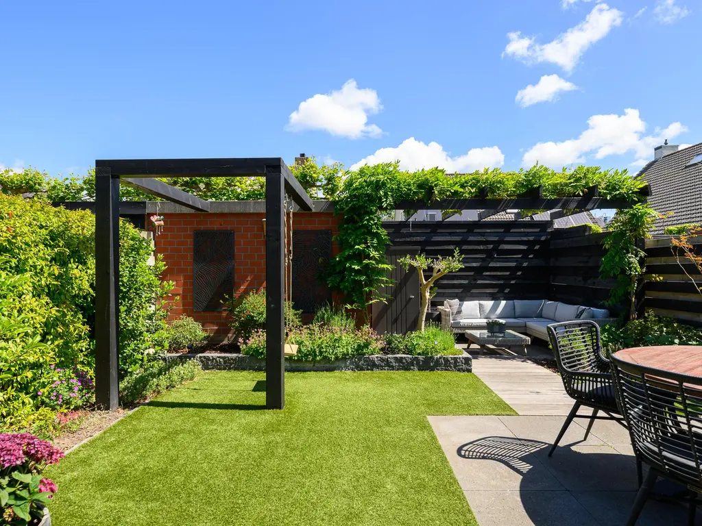 Aan de achterzijde van de woning bevindt zich de tuingerichte woonkamer, waar u via een grote schuifpui direct toegang hebt tot de groene en sfeervolle achtertuin. De tuin is met zorg en smaak aangelegd met een combinatie van tegels, gras, houten planken en weelderige groenborders. Een echte eyecatcher is de gezellige, verlaagde zithoek onder een begroeide pergola – dé plek om heerlijk te ontspannen in alle rust. Daarnaast is er voldoende ruimte voor een grote eettafel, ideaal om op warme dagen buiten te dineren met familie en vrienden.