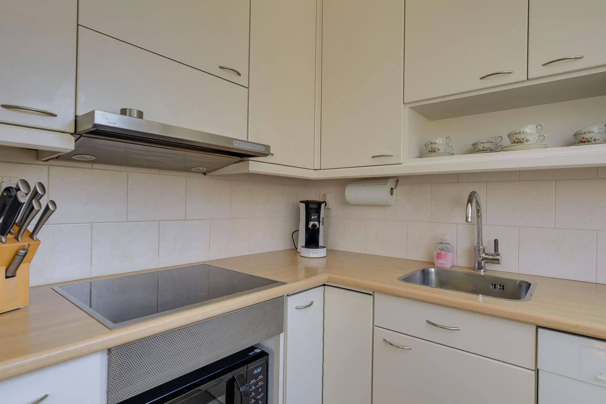 Aan de voorzijde van de woning bevindt zich de open keuken, die is uitgerust met diverse inbouwapparatuur, waaronder een keramische kookplaat met afzuigkap, spoelbak met mengkraan, vaatwasmachine en een koelkast.