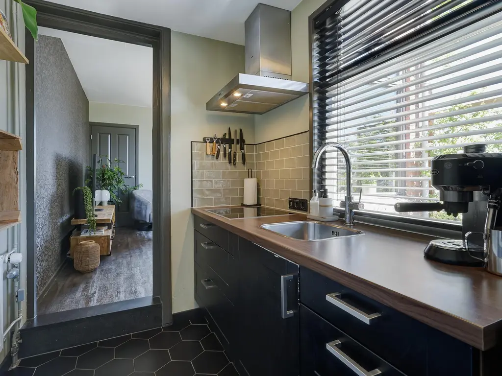 De keuken in wandopstelling biedt een fijn uitzicht op zowel de tuin als de straat. Het bruine werkblad vormt een goede combinatie met de zwarte onderkasten. Daarnaast is de keuken voorzien van diverse inbouwapparatuur, waaronder een inductiekookplaat met afzuigkap, een spoelbak met mengkraan en een losse koelkast en een vriezer. De keuken is voorzien van vloerwarming.