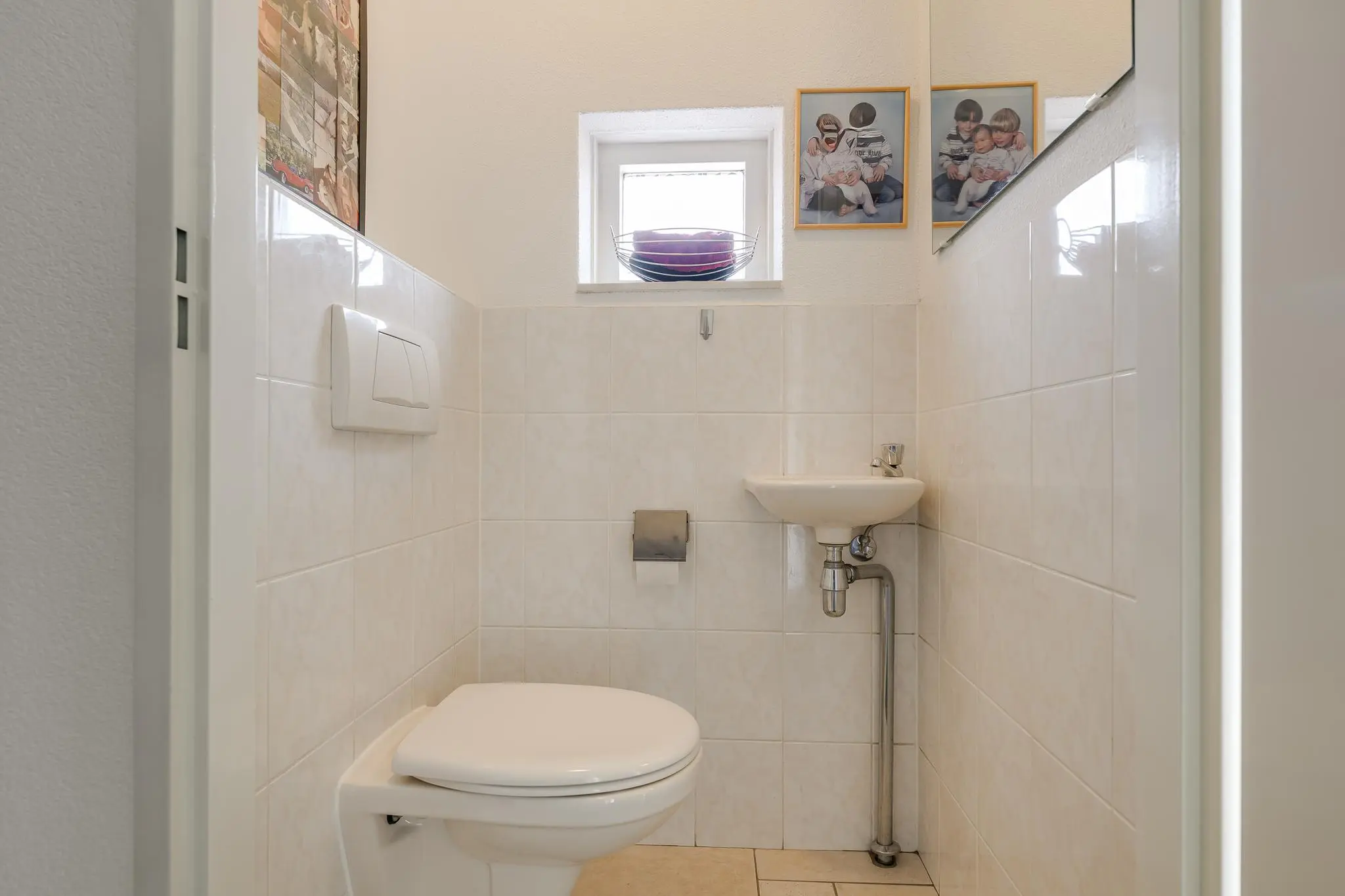 U parkeert gemakkelijk op uw eigen oprit met ruimte voor twee auto's, direct voor de deur. Via de overkapping bereikt u zowel de garage als de entree van de woning. Binnenkomst is in de ruime hal, waar voldoende plaats is voor een garderobe. Vanuit hier heeft u toegang tot het volledig betegelde toilet met fonteintje, de meterkast en de trap naar de eerste verdieping. Daarnaast biedt de hal inpandige doorgang naar zowel de garage als de woonkamer, wat zorgt voor extra comfort en gemak.