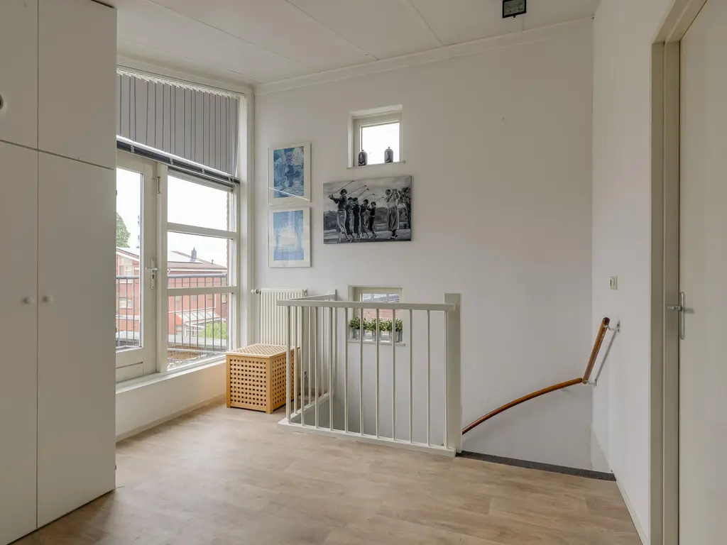 Boven komt u allereerst terecht op de overloop. Vanaf hier heeft u toegang tot drie slaapkamers, de badkamer en de trapopgang naar de tweede verdieping.
