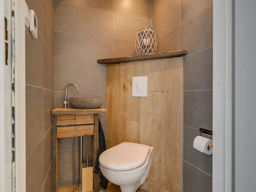 Langs de stenen berging in de nette voortuin bereikt u de entree van de woning. In de hal vindt u de garderobe, meterkast en een volledig betegeld toilet in warme bruintinten, voorzien van vloerverwarming en fonteintje. Vanuit de hal heeft u toegang tot de keuken.