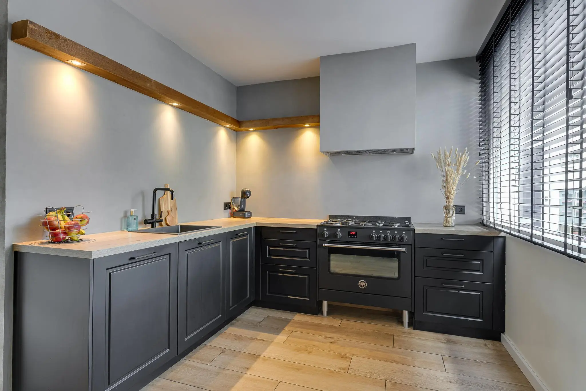 Aan de voorzijde van de woning bevindt zich de in 2020 vernieuwde open keuken in een praktische L-opstelling, gecombineerd met een losse kastenwand. De keuken is uitgevoerd met een stijlvol houtlook werkblad en moderne zwarte onderkasten, wat een eigentijdse uitstraling geeft.