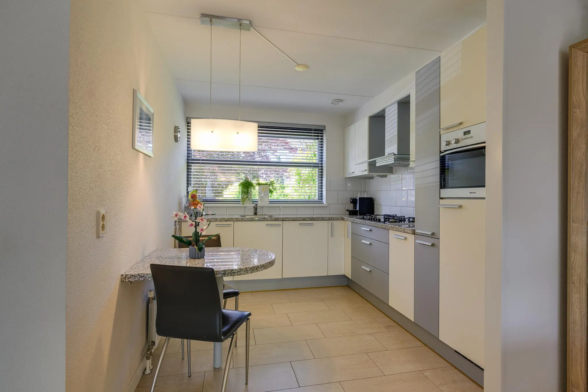 Aan de voorzijde van de woning bevindt zich de open keuken, uitgevoerd in een L-opstelling met een granieten werkblad en strakke grijs-cremekleurige kasten. De keuken is van alle gemakken voorzien en uitgerust met diverse inbouwapparatuur, waaronder een oven van Miele, een Siemens vaatwasser en afzuigkap en een vriezer van Pelgrim. Dankzij deze indeling is er voldoende werk- en bergruimte. Tevens biedt de trapkast nog meer opbergmogelijkheden – ideaal voor voorraad of keukengerei.