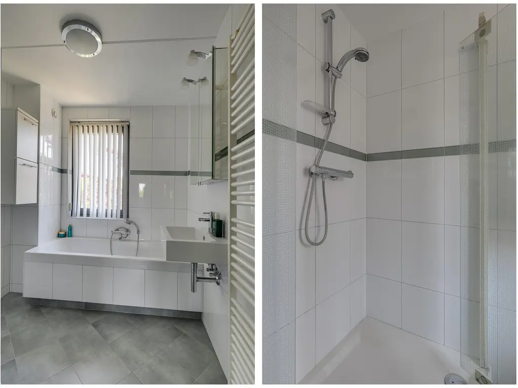 De slaapkamer aan de voorzijde van de woning is voorzien van een elektrische screen, die zorgt voor zowel privacy als zonwering. De aangrenzende (volledig betegelde) badkamer is uitgerust met een douche, ligbad, wastafel en een designradiator. Aan de achterzijde bevinden zich twee slaapkamers, waaronder de hoofdslaapkamer. Beide kamers zijn uitgerust met rolluiken en horren, zodat u zowel ’s nachts als overdag kunt genieten van een aangename temperatuur en geen last heeft van insecten.