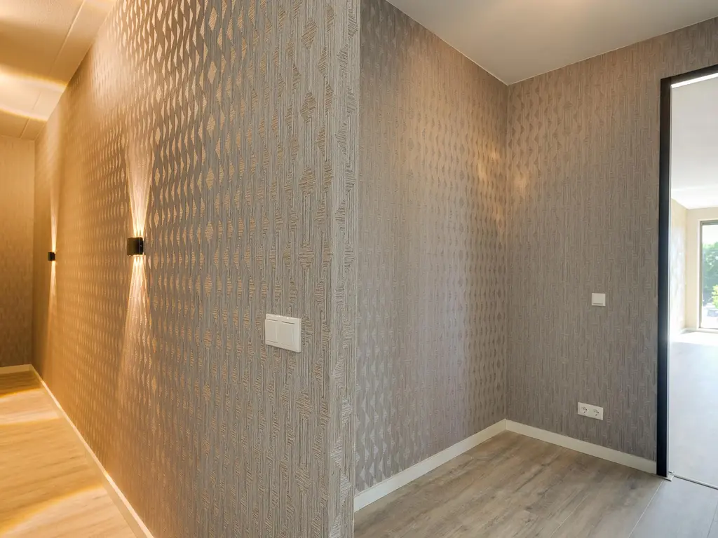 Zodra u de voordeur opent, komt u direct terecht in een uitnodigende en sfeervolle hal. De combinatie van een strak gestuukt plafond, wanden voorzien van warmbruin behang met een verfijnde print en subtiele wandverlichting zorgt direct voor een aangename ambiance/eerste indruk. De keurige laminaatvloer sluit hier naadloos op aan en onderstreept de verzorgde afwerking. Deze entree weerspiegelt perfect de kwaliteit en uitstraling van de rest van het appartement.