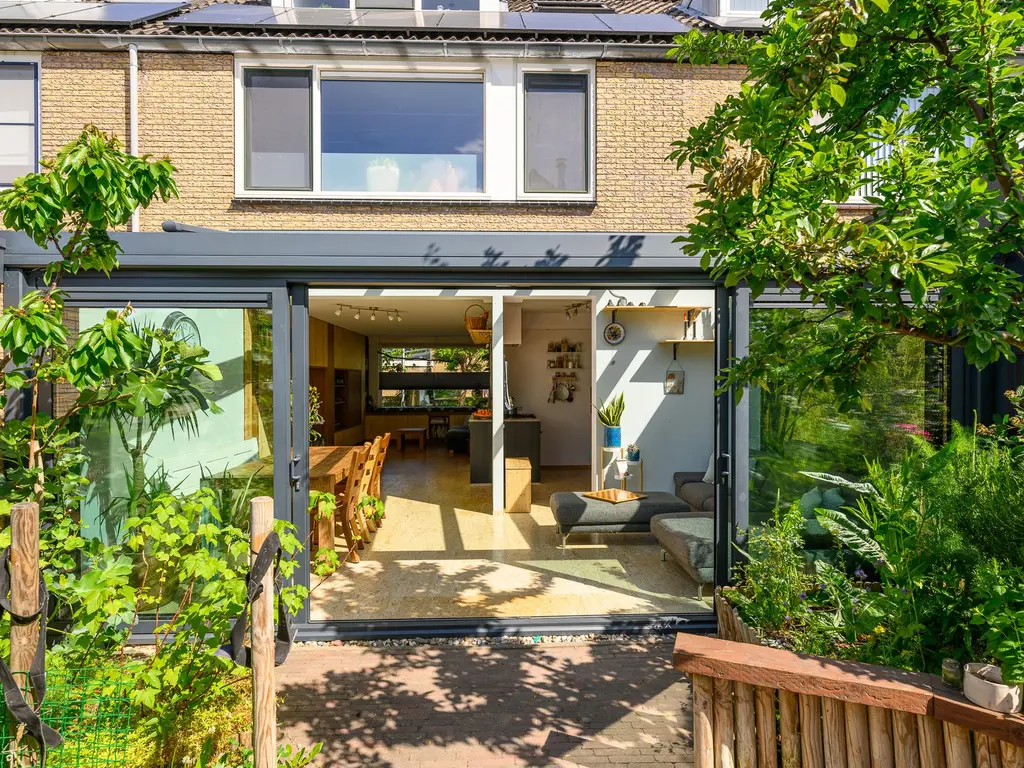 Aan de achterzijde van de woning loopt de woonkamer naadloos over in de aangebouwde serre, waar een gezellige eet- en zithoek is gecreëerd. Dankzij de schuifpui heeft u direct toegang tot de achtertuin, waardoor binnen en buiten op natuurlijke wijze in elkaar overlopen.